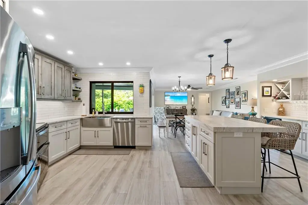 Experience coastal living in this beautifully renovated, move in ready, single-story home located in the highly sought after Park Shore community. The split plan, 4 bedroom, 3 bath home offers 2831 S.F. of living area featuring a large open kitchen with luxurious Taj White Venato Quartzite leathered countertops complete with a walk in pantry, a large center island, a wine bar and dual temperature wine refrigerator and a hidden coffee/ microwave nook. A dedicated laundry room and custom closets throughout provide plenty of storage. The oversized primary suite with direct access to the lanai and pool is enhanced with spacious his and her walk in closets and master bath offering a relaxing retreat. Both the family room and living room have pocketing sliding glass doors to create a seamless transition to the outdoor lanai overlooking the pool and lushly landscaped fenced in yard, ideal for indoor/outdoor entertaining. Perfectly positioned within walking distance to Venetian Village, Waterside Shops, the new 2 story Publix and the exclusive private beach for Park Shore residents.