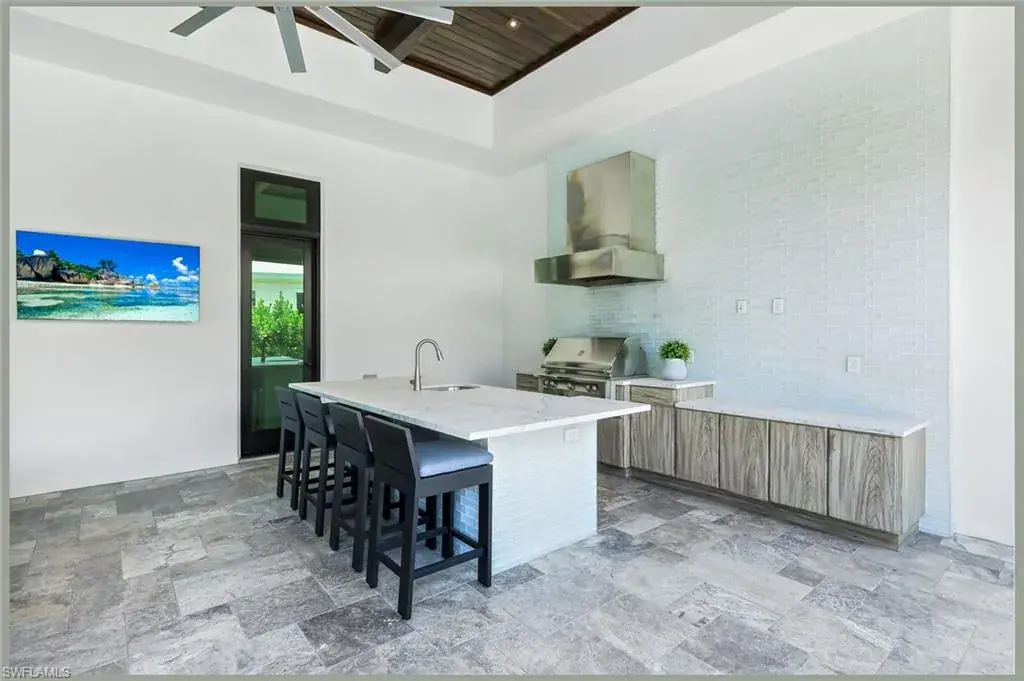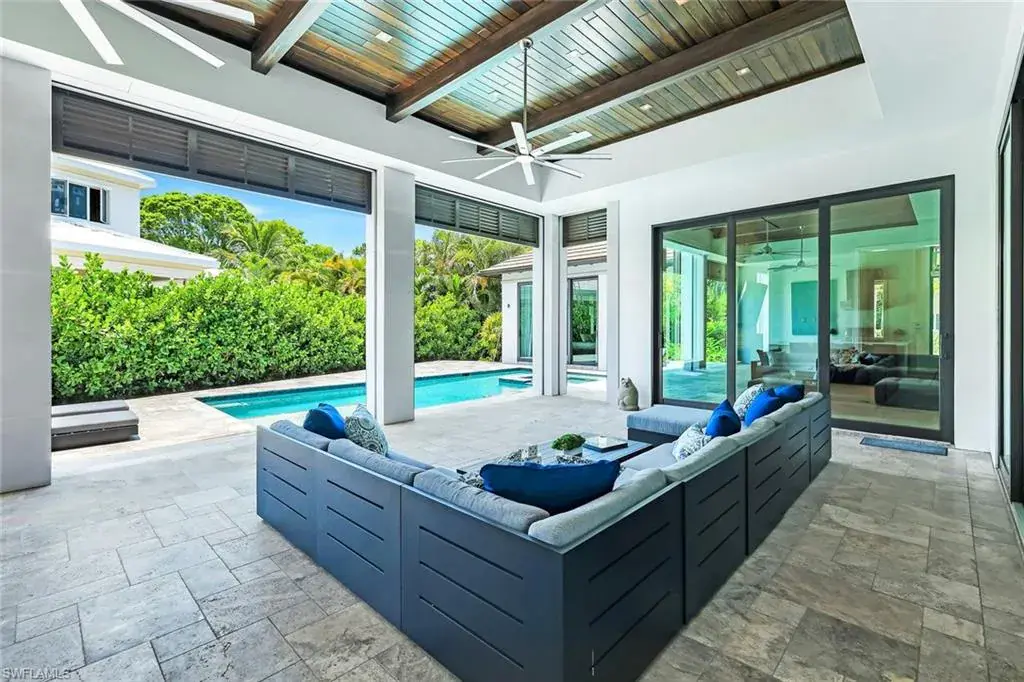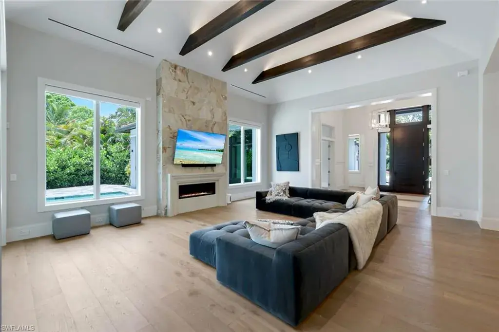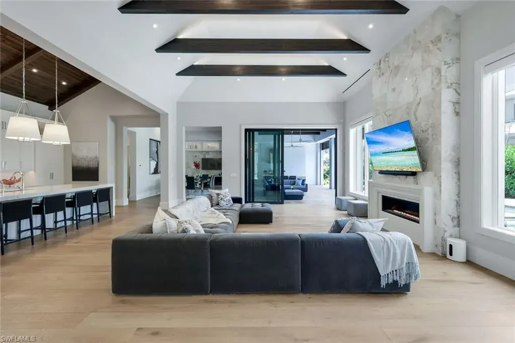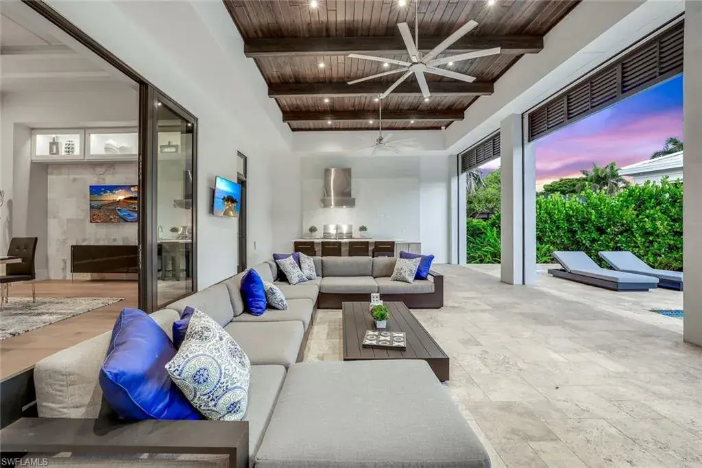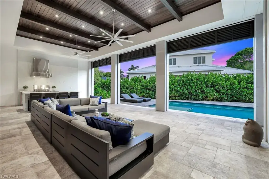 Outdoors, enjoy a relaxed Naples vibe with a casual outdoor kitchen, a sparkling pool, and generous covered seating areas ideal for lounging or hosting. Inside, the living area centers around a stylish fireplace, and each space is elevated by upscale finishes, designer lighting, and custom touches throughout.