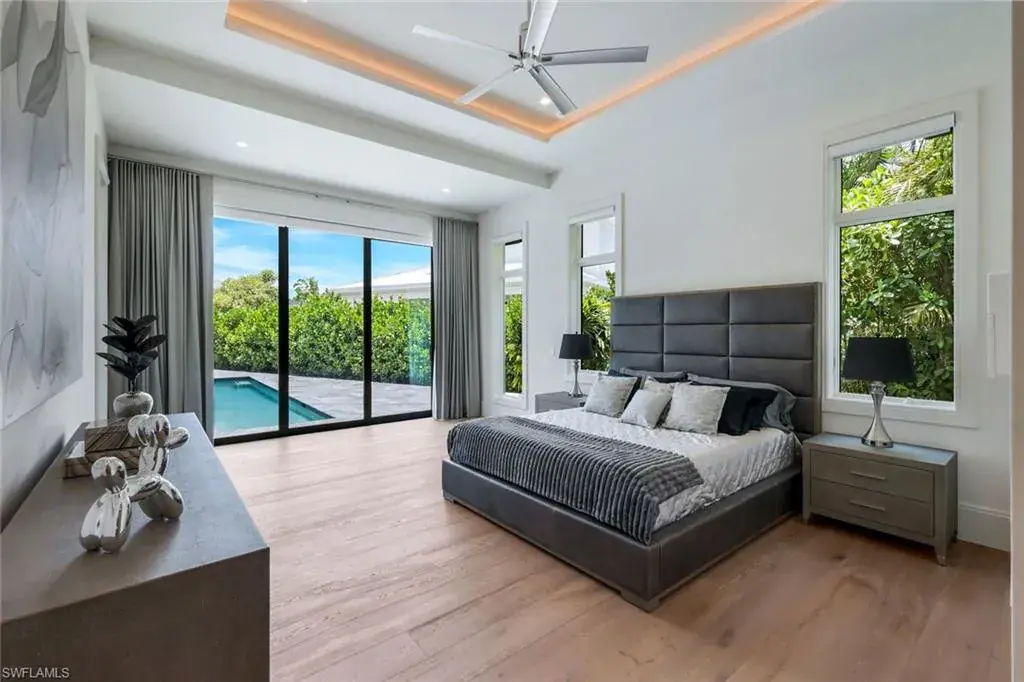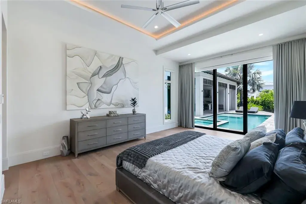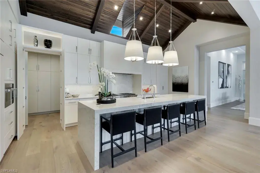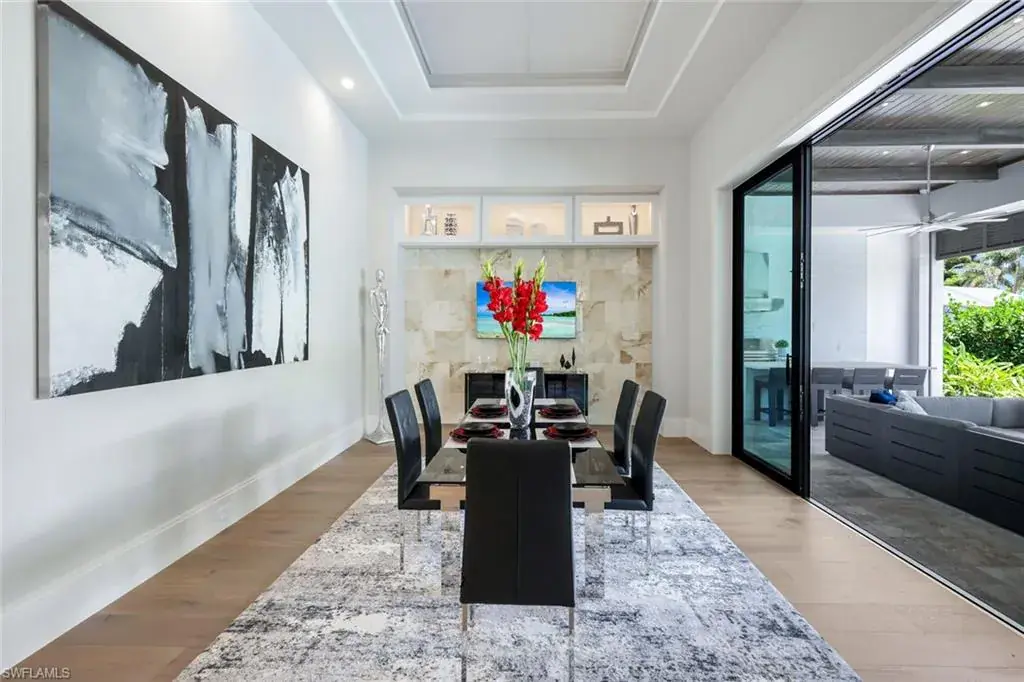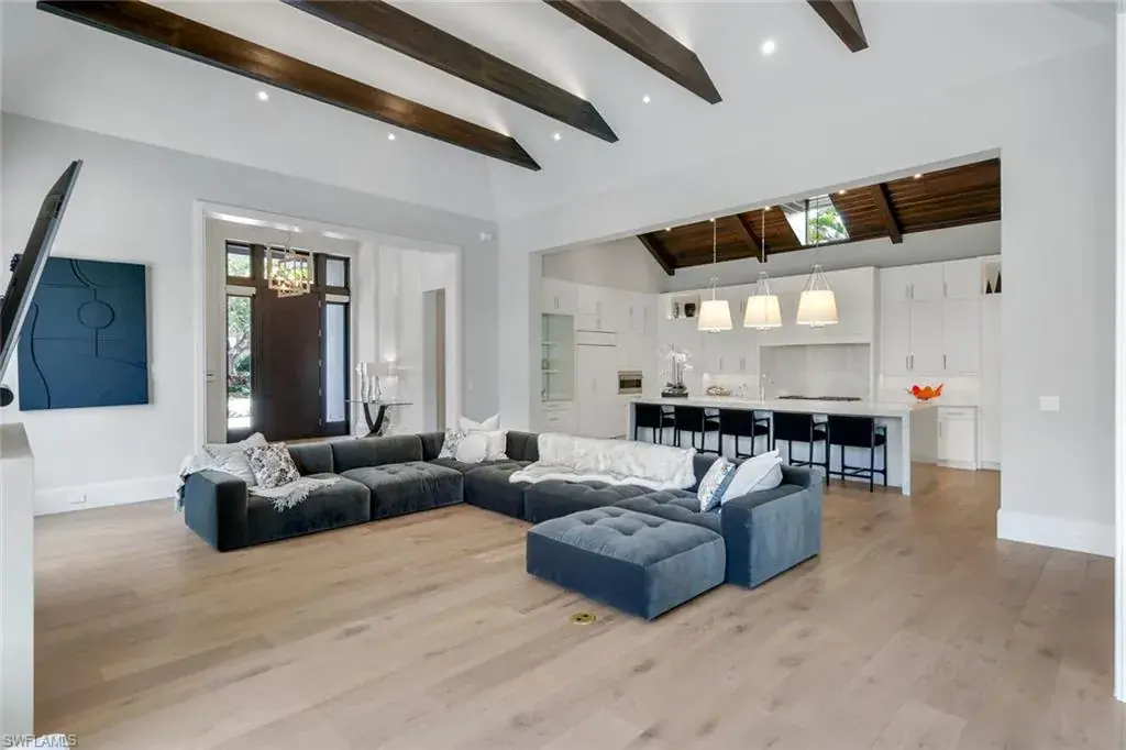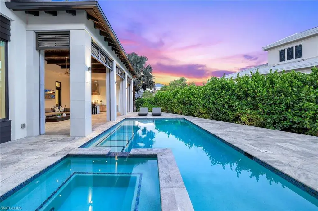 Outdoors, enjoy a relaxed Naples vibe with a casual outdoor kitchen, a sparkling pool, and generous covered seating areas ideal for lounging or hosting. Inside, the living area centers around a stylish fireplace, and each space is elevated by upscale finishes, designer lighting, and custom touches throughout.