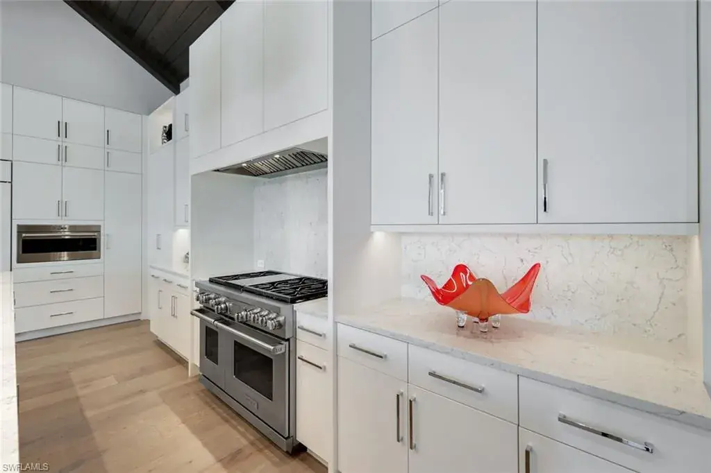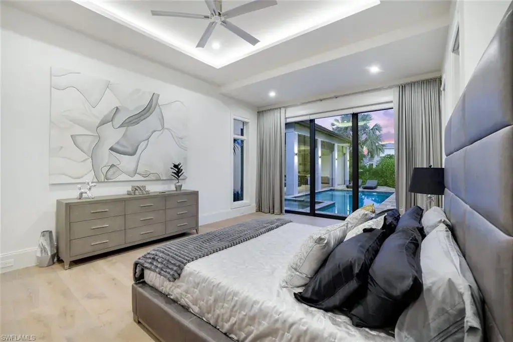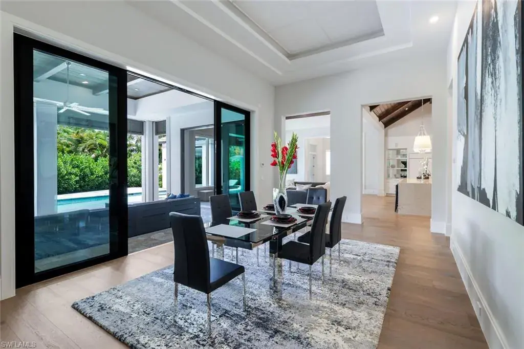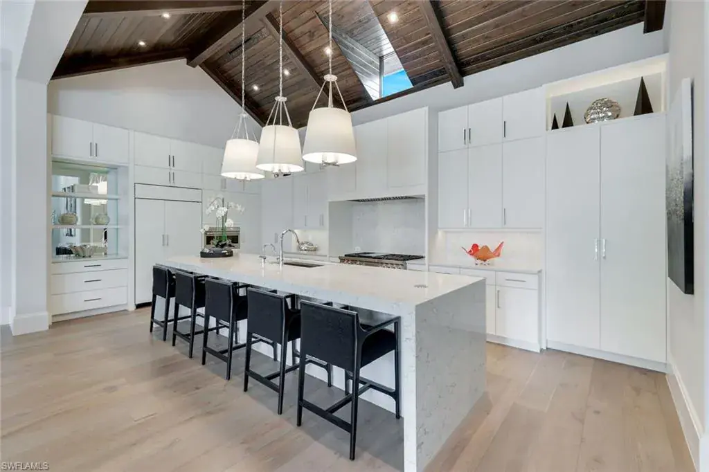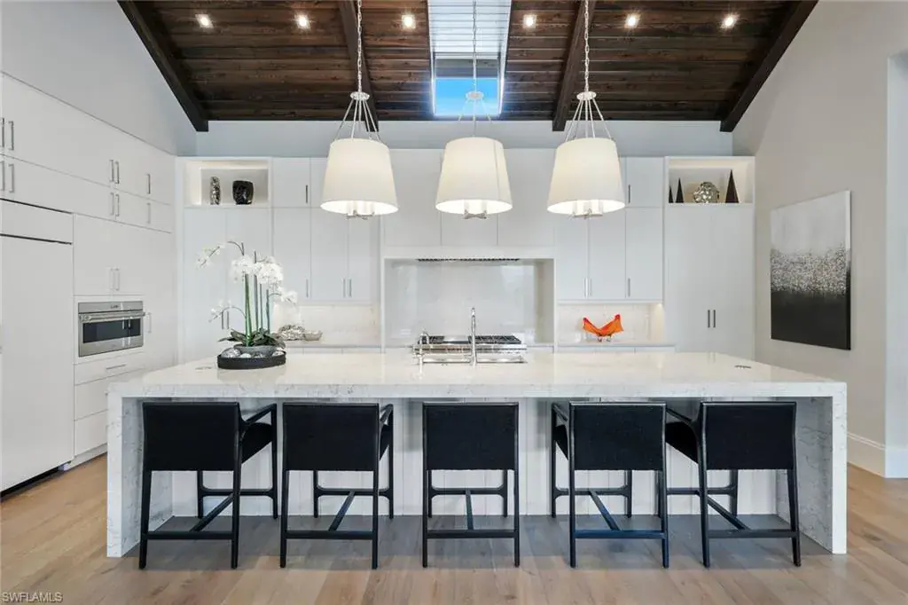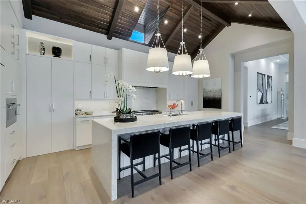 Outdoors, enjoy a relaxed Naples vibe with a casual outdoor kitchen, a sparkling pool, and generous covered seating areas ideal for lounging or hosting. Inside, the living area centers around a stylish fireplace, and each space is elevated by upscale finishes, designer lighting, and custom touches throughout.
