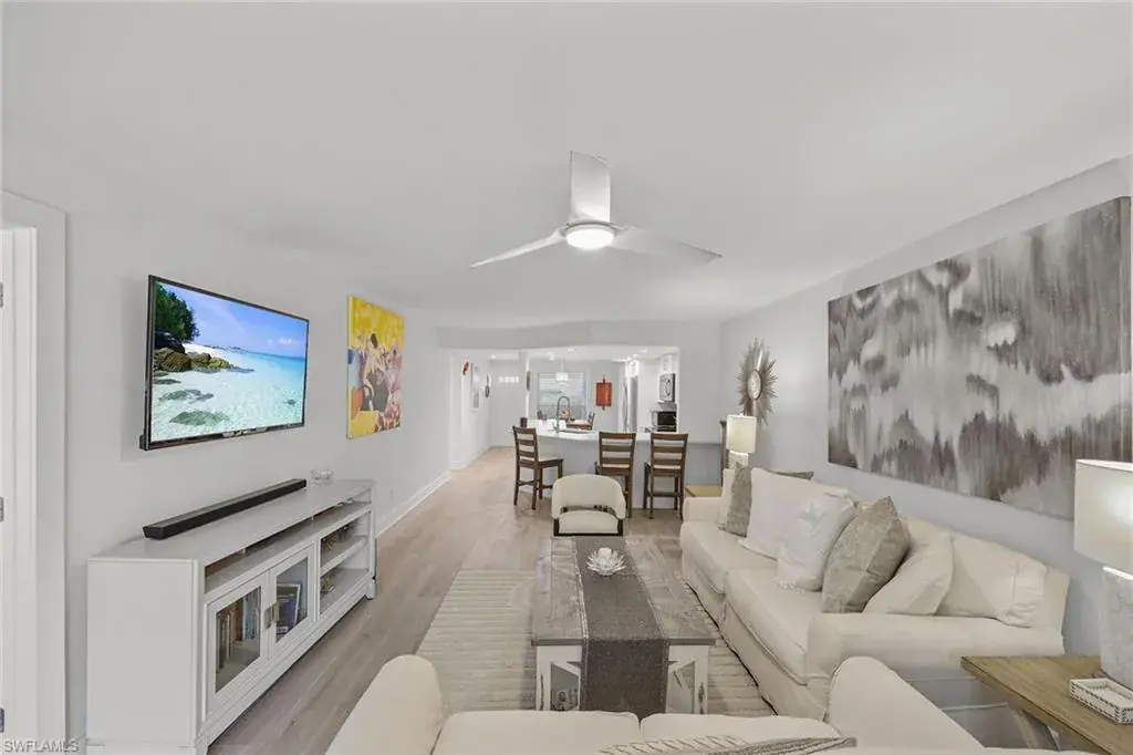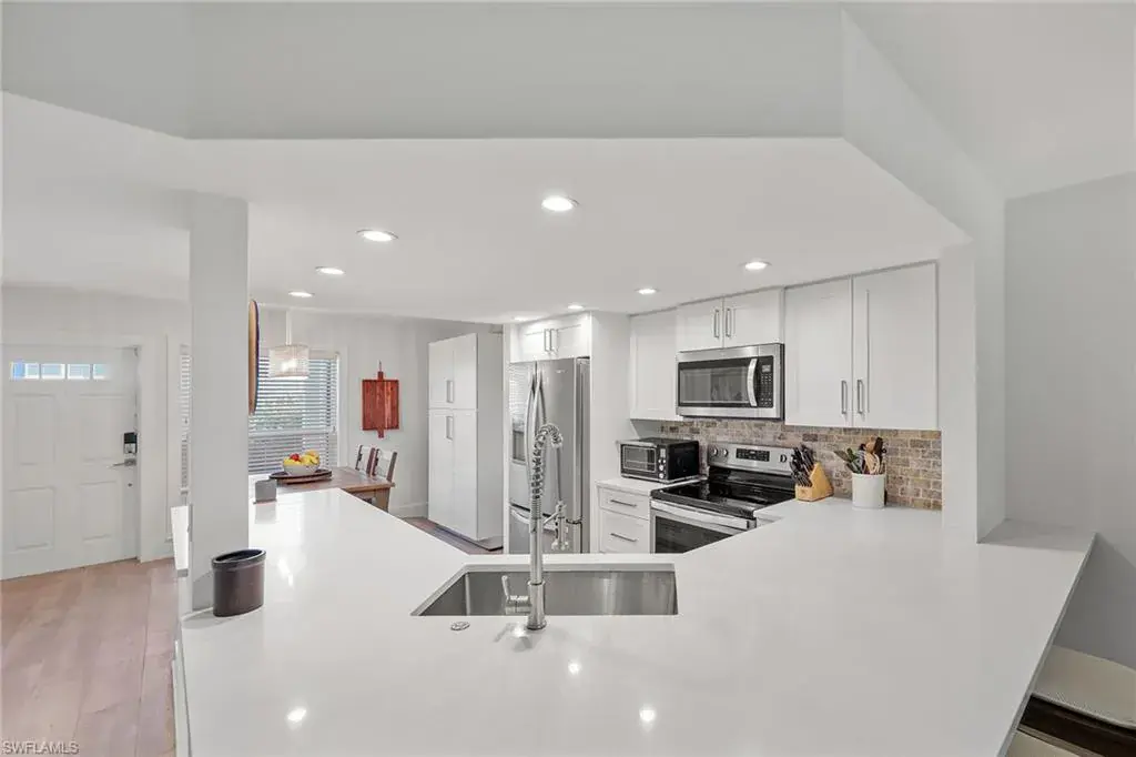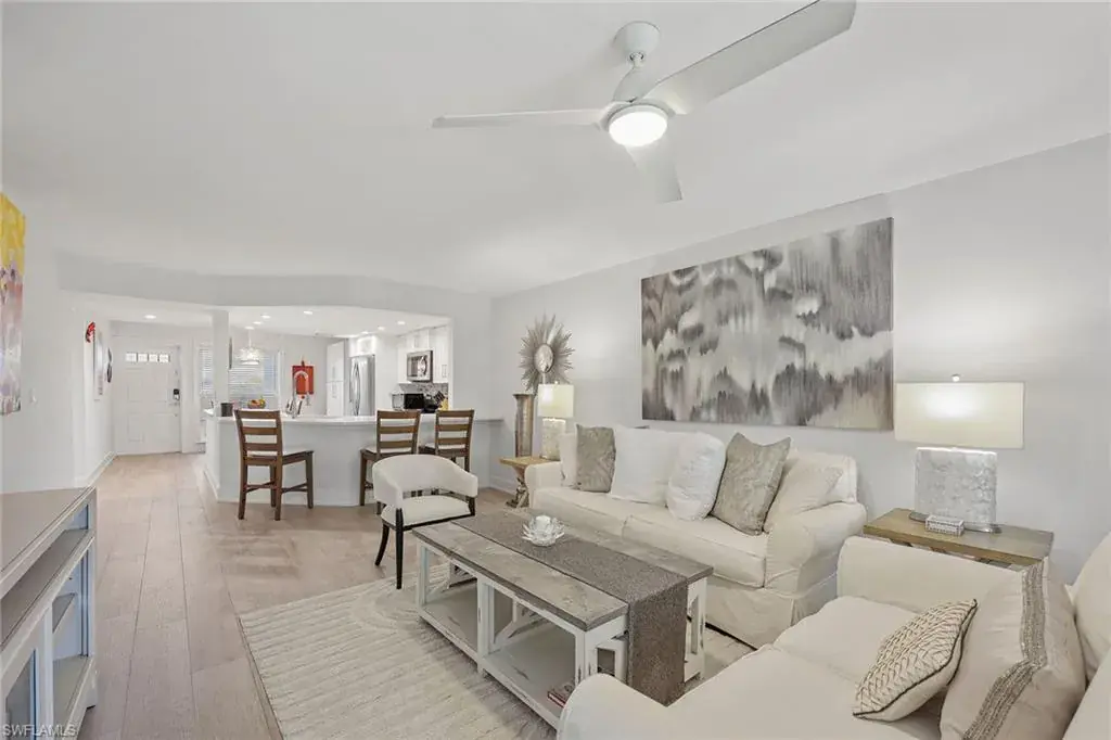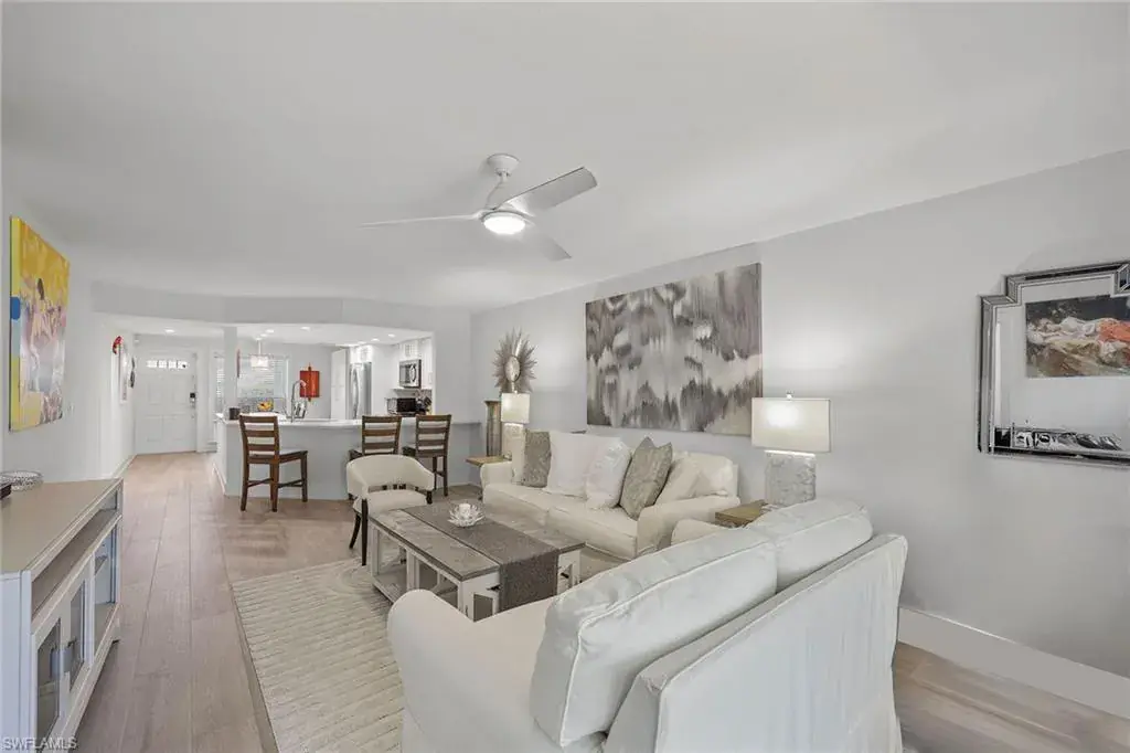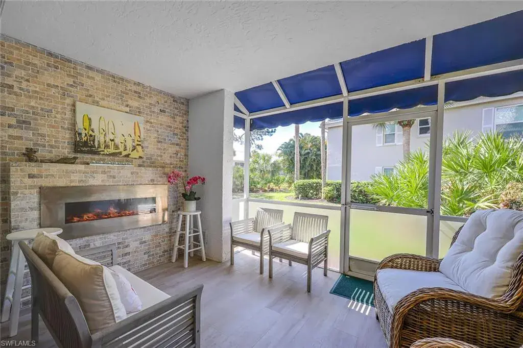Completely remodeled and ideally located west of U.S. 41. This light-filled two-bedroom, two-bath home in the gated Pavilion Club offers upscale coastal living just blocks from Naples top shopping, dining and entertainment. The open-concept interior features plank tile flooring, white shaker cabinets, quartz countertops and stainless steel appliances. The spacious primary suite includes a walk-in closet, dual vanities and a glass-enclosed walk-in shower. Sliding doors from both the living room and primary bedroom lead to a screened lanai with an outdoor fireplace, overlooking a tropical setting. Enjoy unmatched walkability to Mercato, The Pavilion, Whole Foods, restaurants, movie theaters and a community park. Pavilion Club residents enjoy a community pool and private pedestrian gate to the Pavilion shopping center. Whether you’re seeking a full-time residence, vacation getaway or investment opportunity, this home delivers luxury, location and low-maintenance living—all just minutes from the beach. No flooding during past storms, according to the owner.