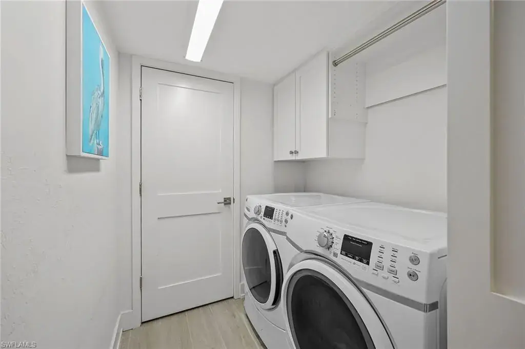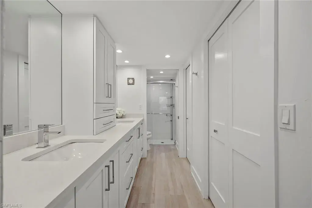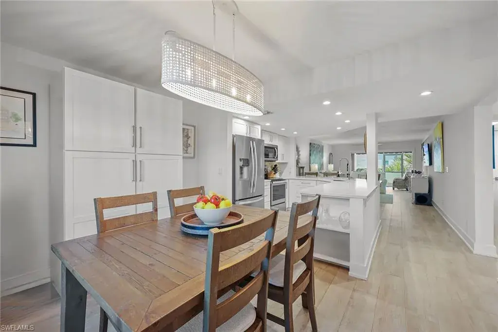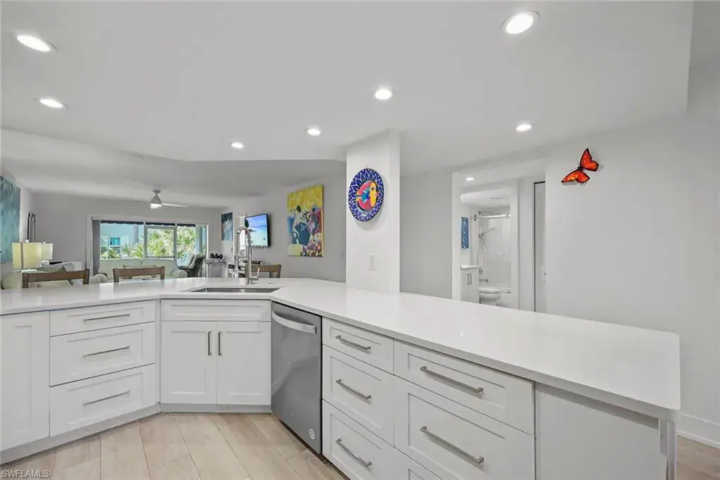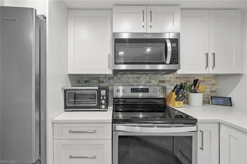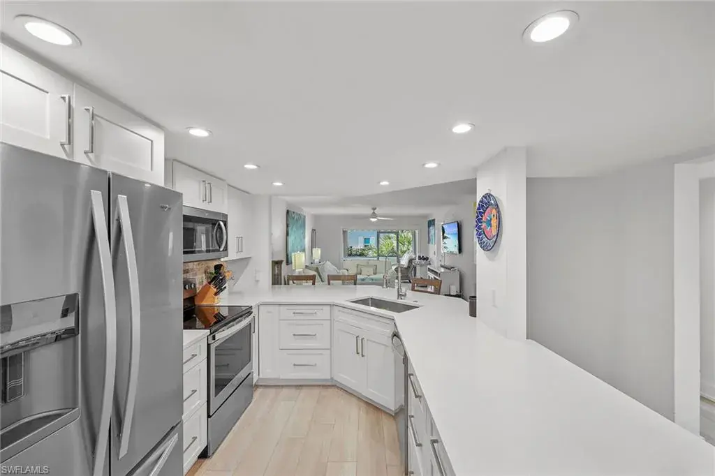 Completely remodeled and ideally located west of U.S. 41. This light-filled two-bedroom, two-bath home in the gated Pavilion Club offers upscale coastal living just blocks from Naples top shopping, dining and entertainment. The open-concept interior features plank tile flooring, white shaker cabinets, quartz countertops and stainless steel appliances. The spacious primary suite includes a walk-in closet, dual vanities and a glass-enclosed walk-in shower. Sliding doors from both the living room and primary bedroom lead to a screened lanai with an outdoor fireplace, overlooking a tropical setting. Enjoy unmatched walkability to Mercato, The Pavilion, Whole Foods, restaurants, movie theaters and a community park. Pavilion Club residents enjoy a community pool and private pedestrian gate to the Pavilion shopping center. Whether you’re seeking a full-time residence, vacation getaway or investment opportunity, this home delivers luxury, location and low-maintenance living—all just minutes from the beach. No flooding during past storms, according to the owner.