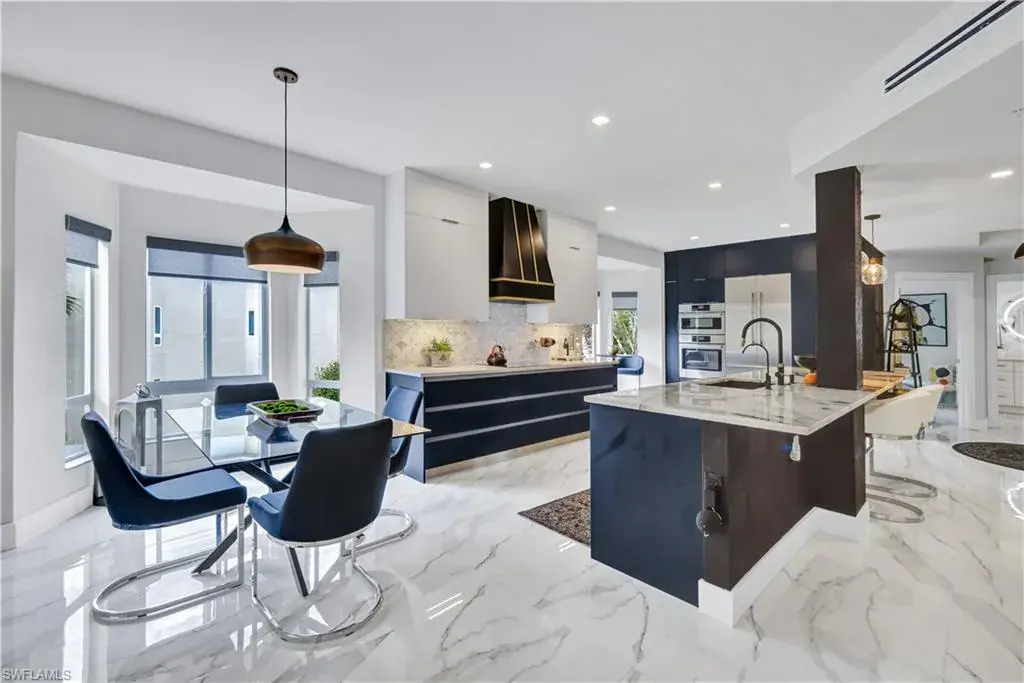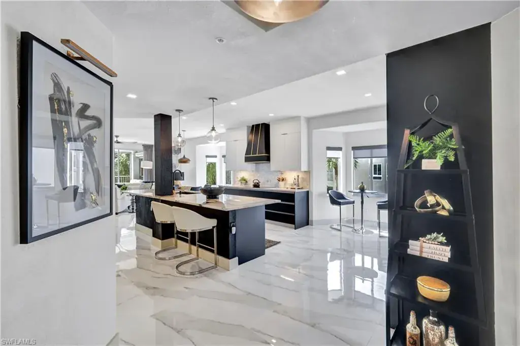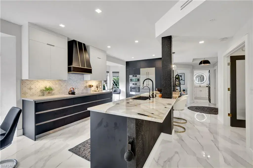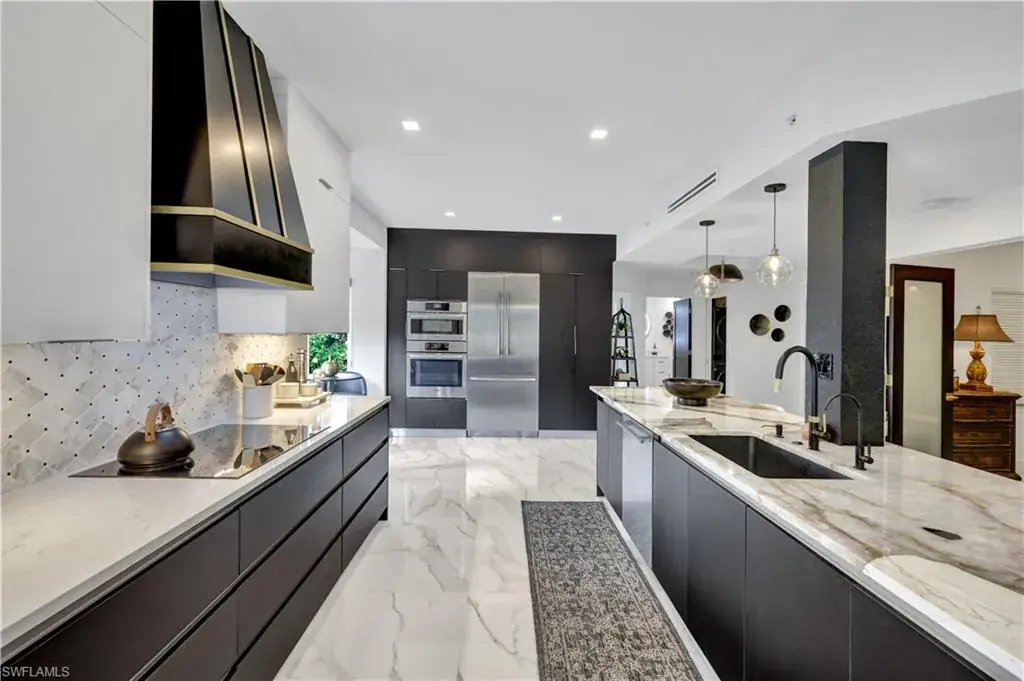 A STUNNINGLY BEAUTIFUL RENOVATION! Remastered end unit featuring top of the line craftsmanship, materials, & fixtures. Open expanded kitchen with gorgeous Quartz countertops, custom drawer inserts, high end cabinetry & appliances with names like Thermador, Bosch, & Sub Zero make entertaining a chef’s delight. Large porcelain tile throughout, walk in showers, Ove toilet/bidet, dimmable back lit mirrors complete the chic bathrooms. An electric fireplace sets the mood for this very private chic home that invites afternoon sunlight through 2 bay windows. Renovated 2021. Pebble Creek is a well managed community within Pelican Bay that is directly across from the North Tram for easy beach access. It’s halite is a beautiful amenity area offering fitness, 2 pools, spa and more. Pet friendly, gated and everyone has their own private garage.