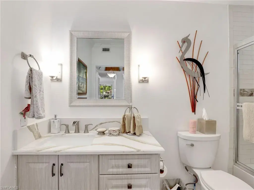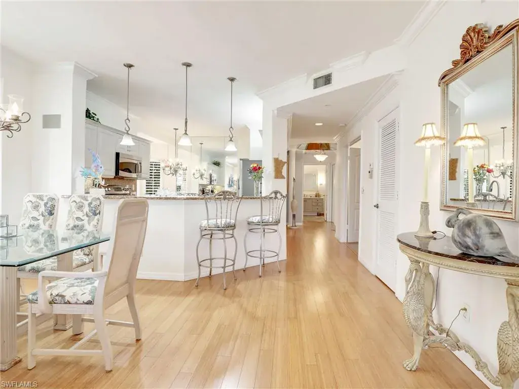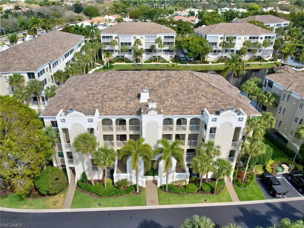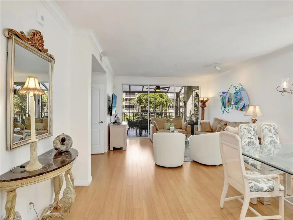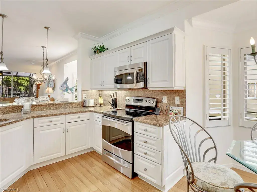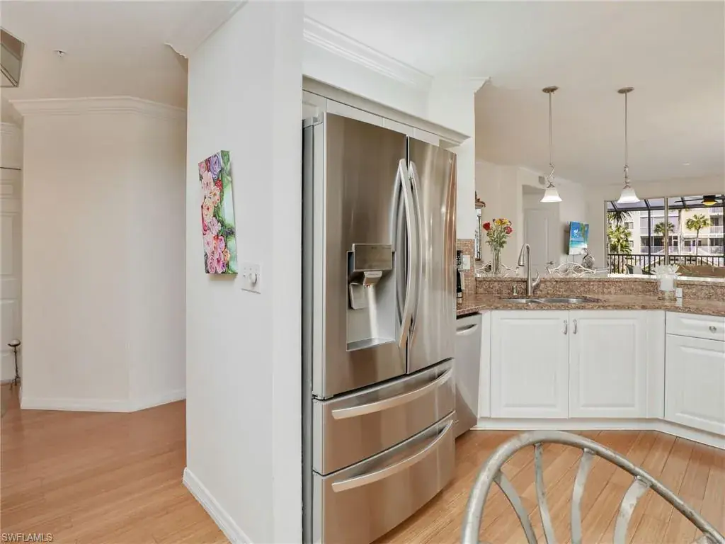 3bd 2 ba end unit condo, with a beautiful lake view. Condo has been tastefully redone, FEATURES BAMBOO WOOD FLOORS WITH CROWN MOLDING throughout. Kitchen has stainless appliances and a dining area .Built-in Cabinets in 3rd bedroom . Guest bath totally redone 1 year ago, tile floors, quartz countertops, shower and tub have new tiles, primary bath redone beautiful tiles and siletone countertops. Attached single-car garage close to elevator and large oversize lanai. Pebble creek has an island with 2 pools, gazebo, sauna spa, barbecues, clubhouse and a workout room. Pelican Bay has 3 miles of beach, access with trams or walk through the mangroves to the beach. Beach restaurants, attendants on the beach, tennis, pickleball. bocce, and attended fitness center.