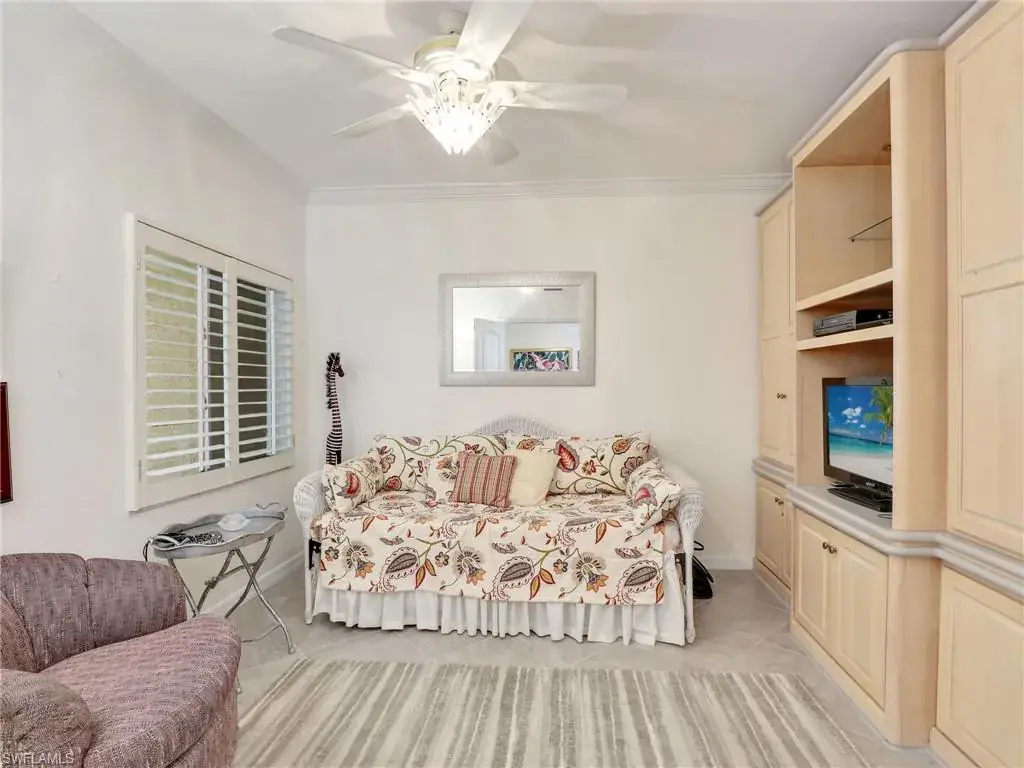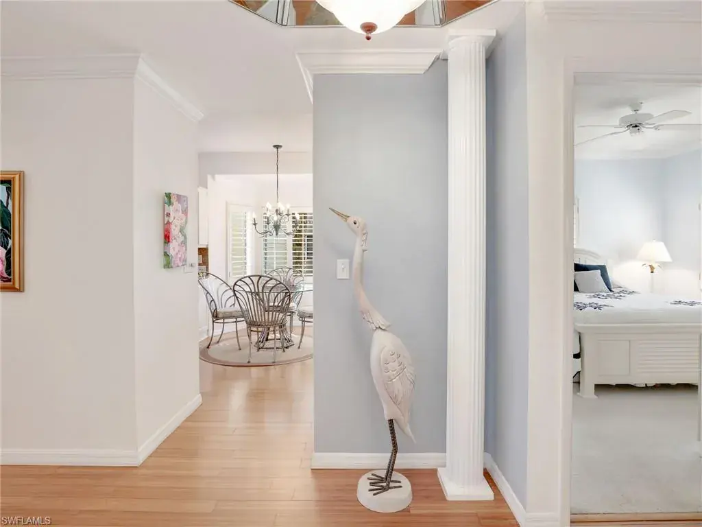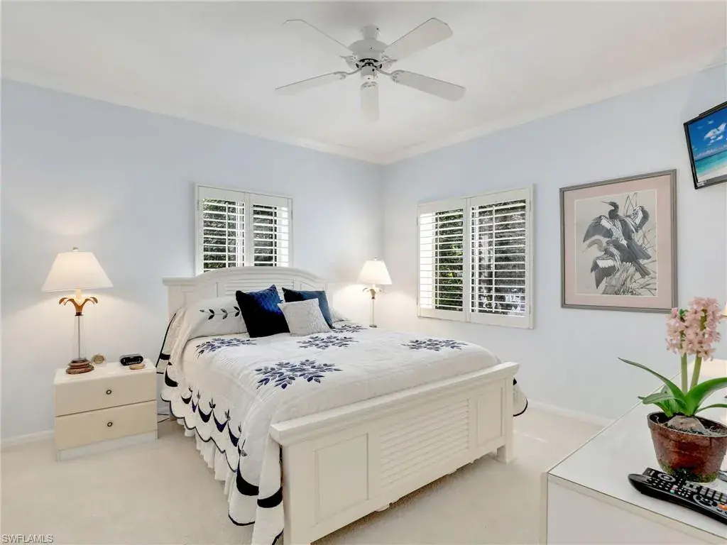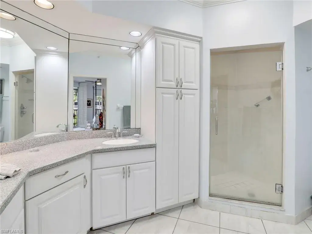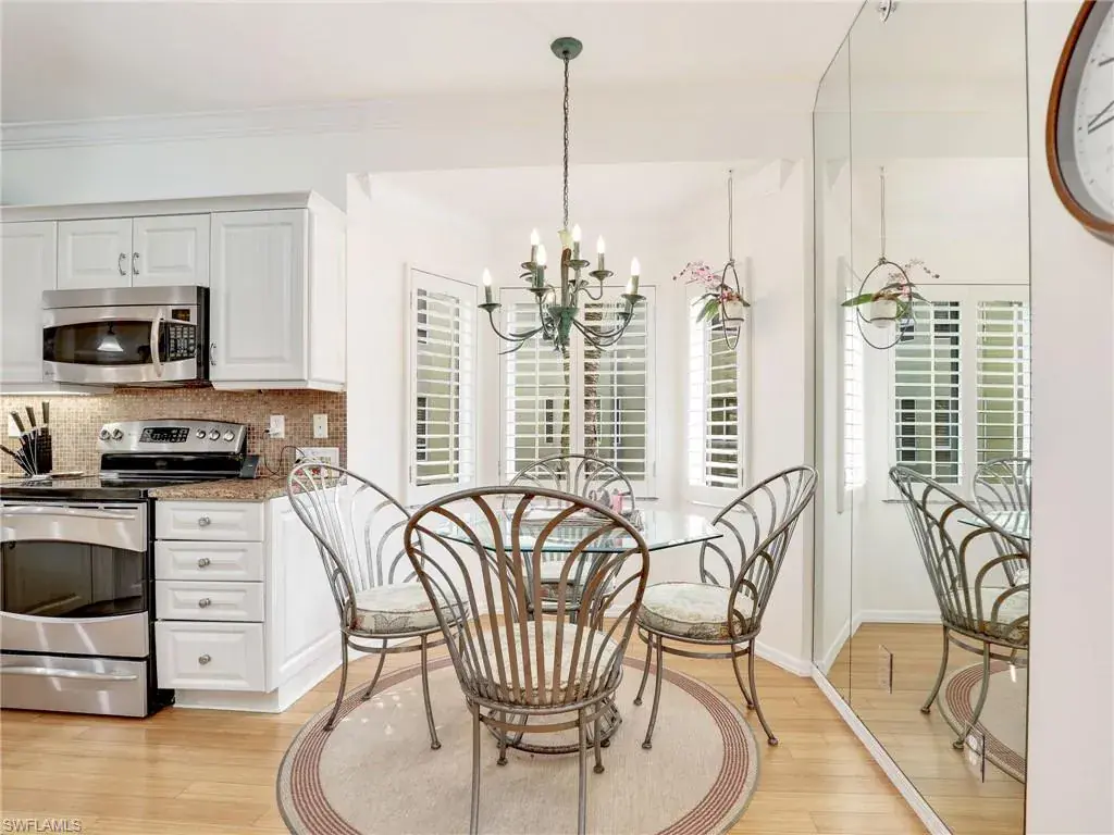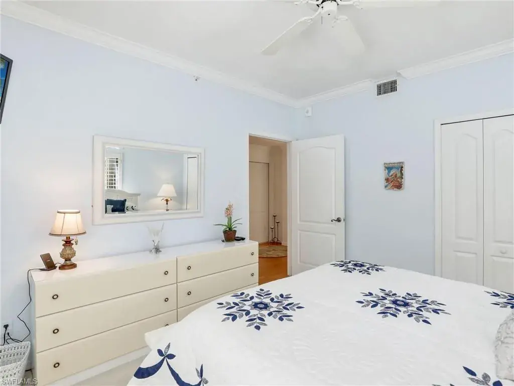3bd 2 ba end unit condo, with a beautiful lake view. Condo has been tastefully redone, FEATURES BAMBOO WOOD FLOORS WITH CROWN MOLDING throughout. Kitchen has stainless appliances and a dining area .Built-in Cabinets in 3rd bedroom . Guest bath totally redone 1 year ago, tile floors, quartz countertops, shower and tub have new tiles, primary bath redone beautiful tiles and siletone countertops. Attached single-car garage close to elevator and large oversize lanai. Pebble creek has an island with 2 pools, gazebo, sauna spa, barbecues, clubhouse and a workout room. Pelican Bay has 3 miles of beach, access with trams or walk through the mangroves to the beach. Beach restaurants, attendants on the beach, tennis, pickleball. bocce, and attended fitness center.