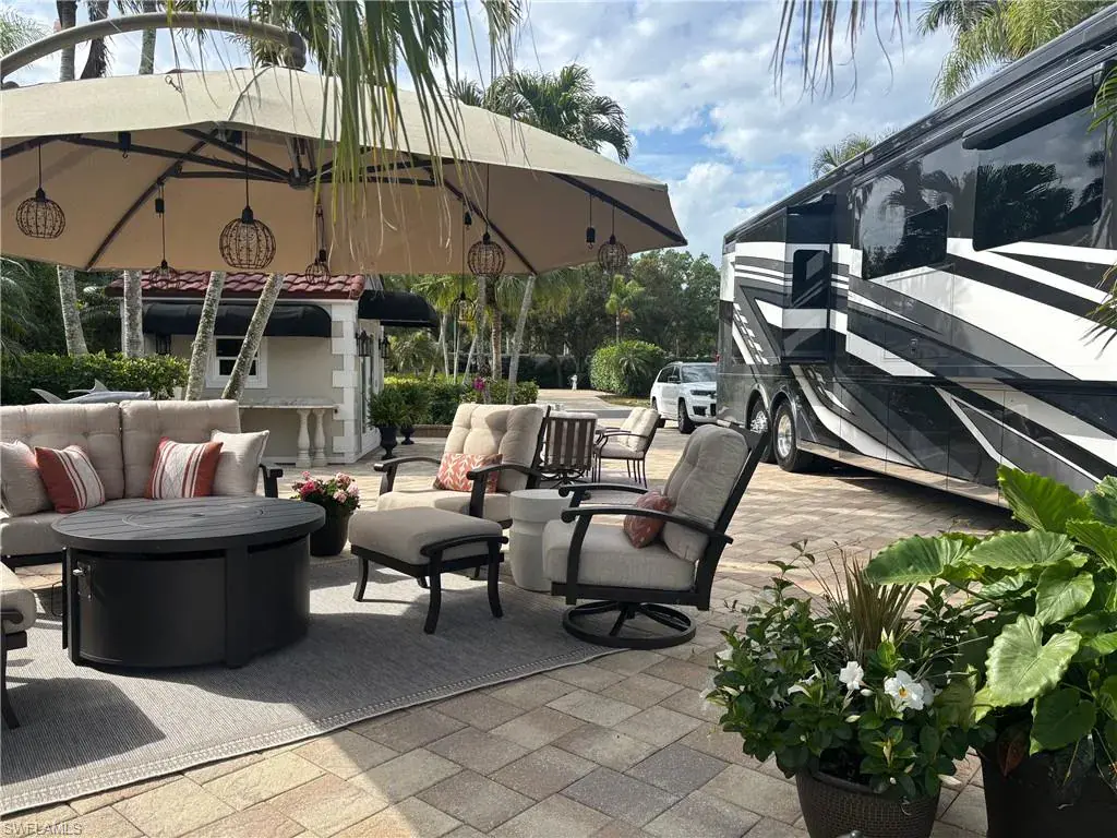 Embrace the perfect blend of serenity and luxury with this exceptional pull-in, north facing, lakefront property located in Pelican Lake Motorcoach Resort. This property has many upgrades including: the meticulously designed outdoor living space that offers a spacious paved pad and raised patio ideal for entertaining or unwinding beneath swaying palms and lush topical landscaping, recently renovated interior and exterior 10×10 coachhouse, and custom landscape lighting This site is located only 8 sites east of the centrally located clubhouse and amenity area. The property has plenty of space for your class A motorhome, two vehicles, a golf cart while still having plenty of out door area for living and entertaining. Enjoy the morning sun and afternoon shade while enjoying your morning coffee or evening happy hour with your neighbors! Move-in ready with new furniture and new grill!
