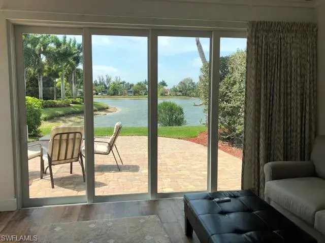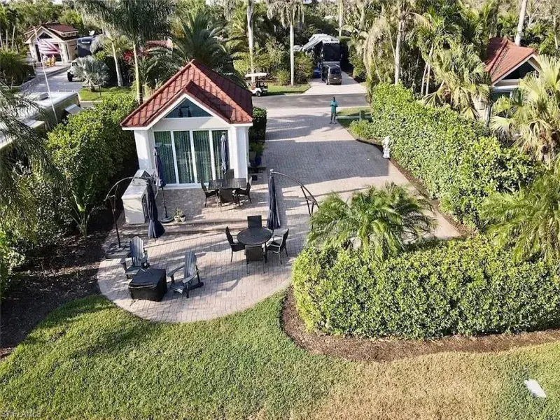 Centered around a stylish patio table with four chairs, this area is perfect for al fresco dining or enjoying a morning coffee. The surrounding greenery, including palm trees and various potted plants, adds a touch of nature’s tranquility to the space.