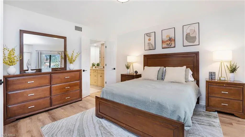 Discover the unit you’ve been waiting for—beautifully updated, improved, and truly move-in ready. Offered turnkey and competitively priced to sell, this home features tasteful, sleek furnishings that are nearly new and barely used. Since 2023, enhancements include luxury vinyl plank flooring, brand-new kitchen appliances, and a new washer and dryer. The primary bathroom boasts a freshly tiled shower with a new sliding glass door. Popcorn ceilings have been removed, and the entire condo has been freshly painted, complemented by new blinds and window treatments. This remarkable first-floor condo is tucked away in Building C, and the screened lanai offers peaceful, lush landscaped views of the courtyard. An additional storage closet on the lanai adds convenience. Impact windows and doors and electronic hurricane shutters for double protection! This Condo is ideally located just minutes from downtown Naples, 5th Avenue shopping and dining, and the stunning white sugar-sand beaches Naples is famous for.