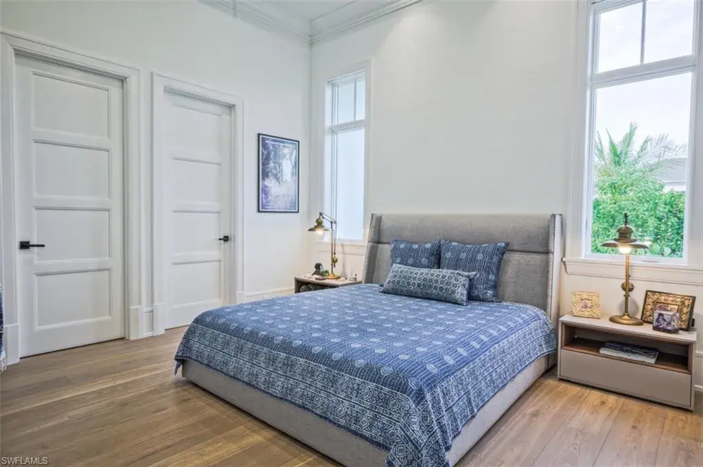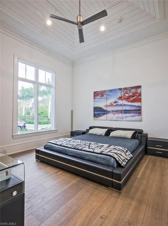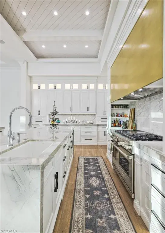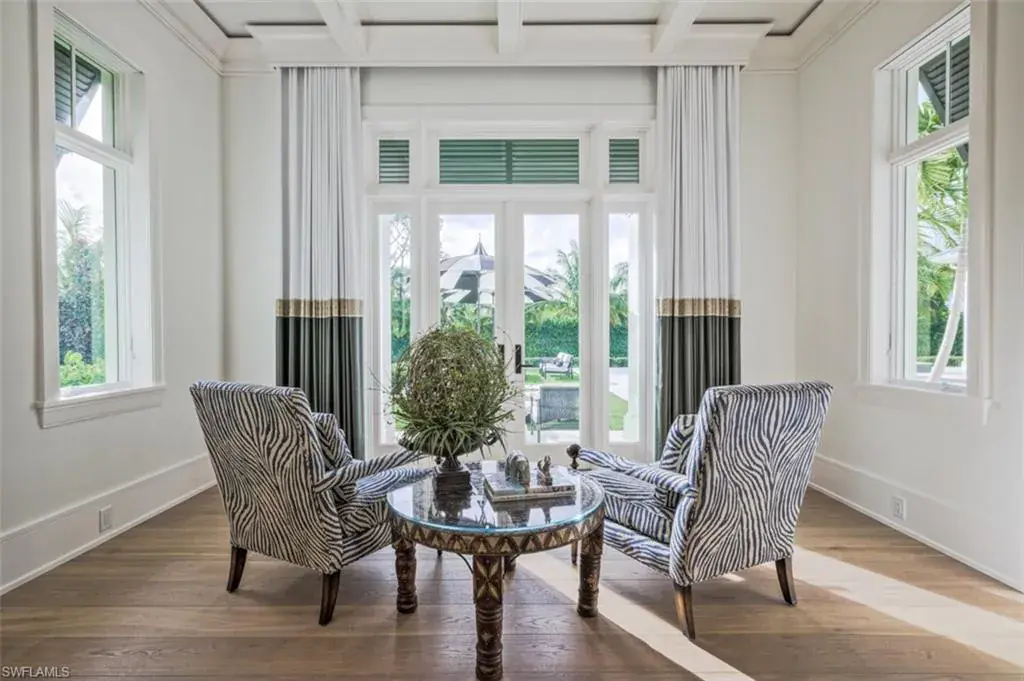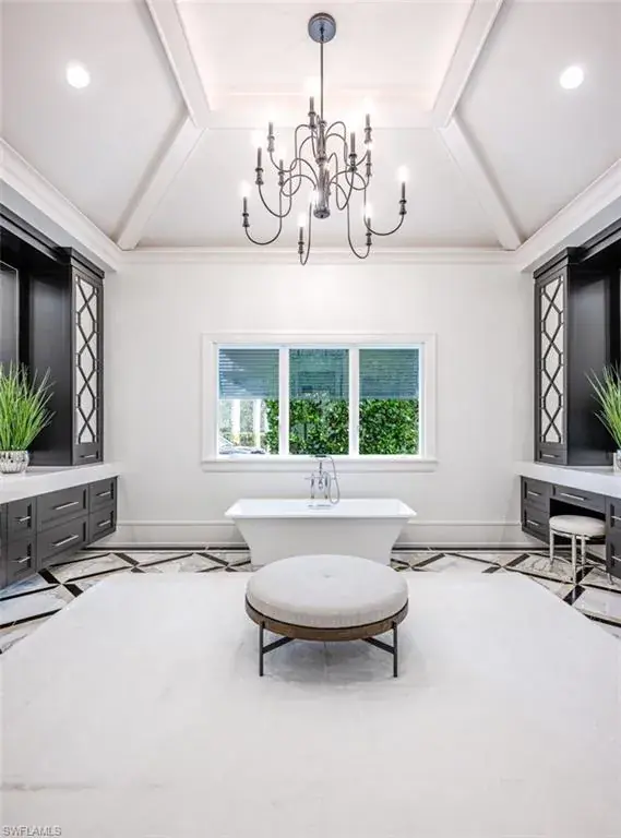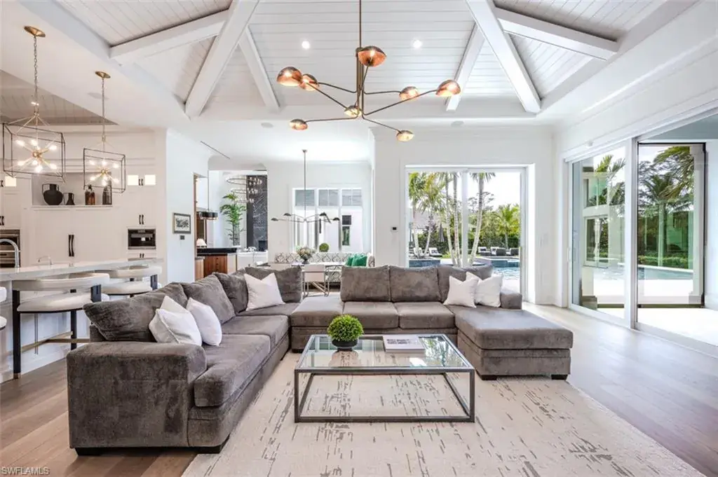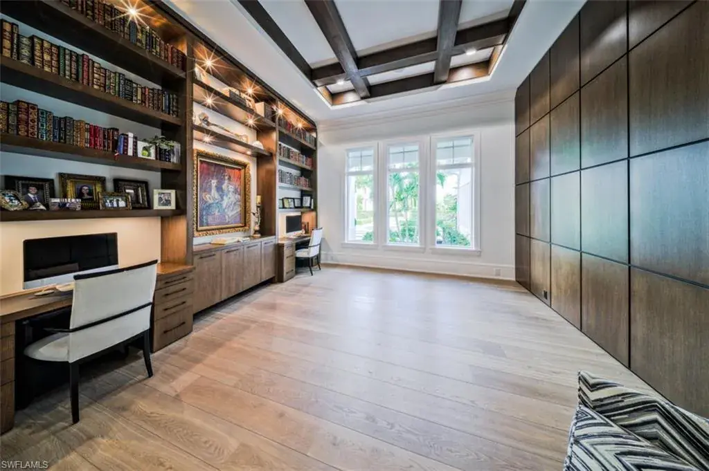 Situated in Pine Ridge, this sprawling single story masterpiece is a paradigm of design and craftsmanship. Boasting over 7,200 sq ft, the residence features 6 bedrooms plus a den, a 6-car garage, all on a 1.31-acre Western exposed lot. Inside, a wood-paneled library, a two-story living room with wood beams, and a full bar create a warm atmosphere. The gourmet kitchen showcases Wolf and Sub-Zero appliances and an elaborate pantry. The master retreat offers luxury and privacy with a private sitting area. Step outside to enjoy a custom-designed 45-foot pool/spa, outdoor living space with screens/shutters, gas fireplace, and a grill/bar area. The home features fine details like wide plank wood flooring, quartz tops, walnut cabinetry, custom closets, temperature controlled wine wall, a Crestron lighting system, auto shades and an auto sliding door. Additional features include an exterior gas fire pit, plenty of green space, home theater, and full bar. Completed in 2021, this home exudes timeless elegance, luxury, and refined living. Don’t miss your chance to own this exceptional residence.
