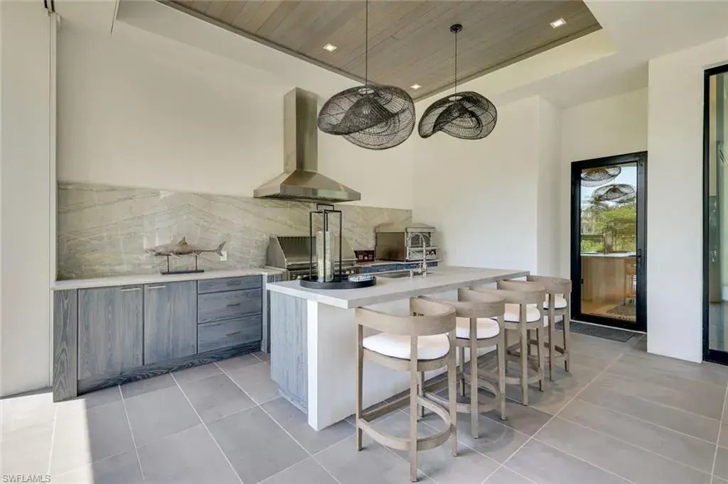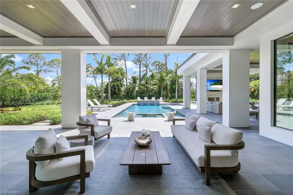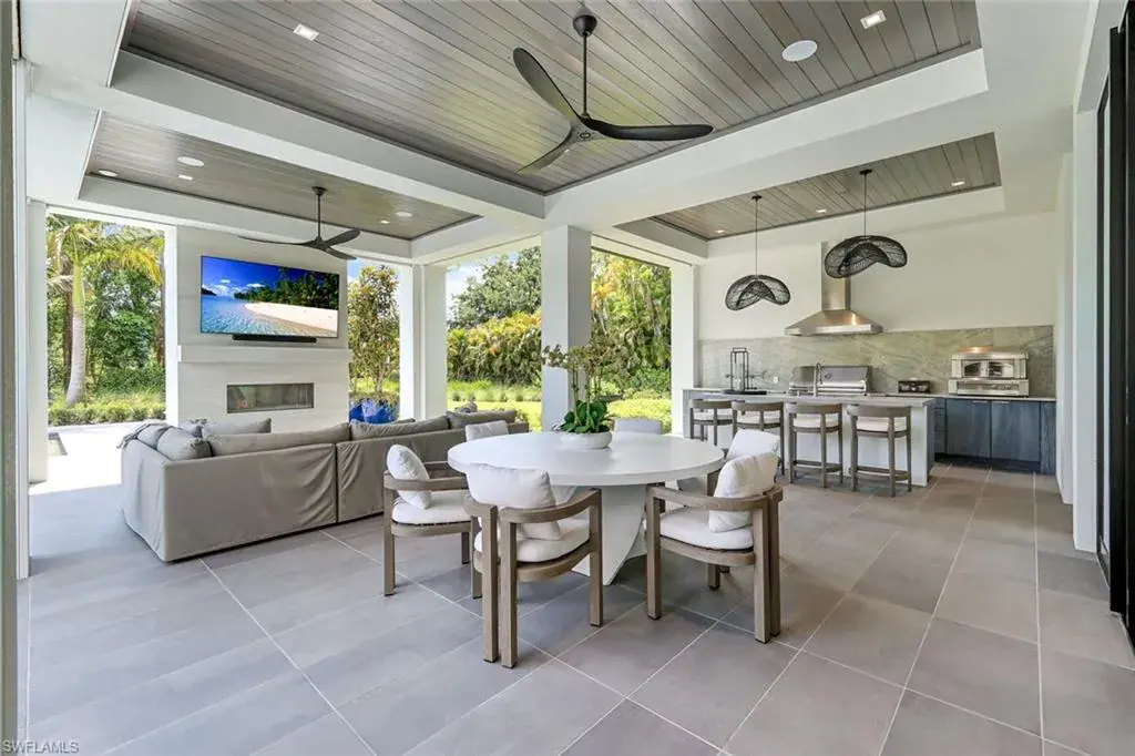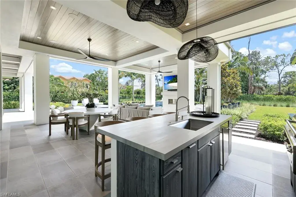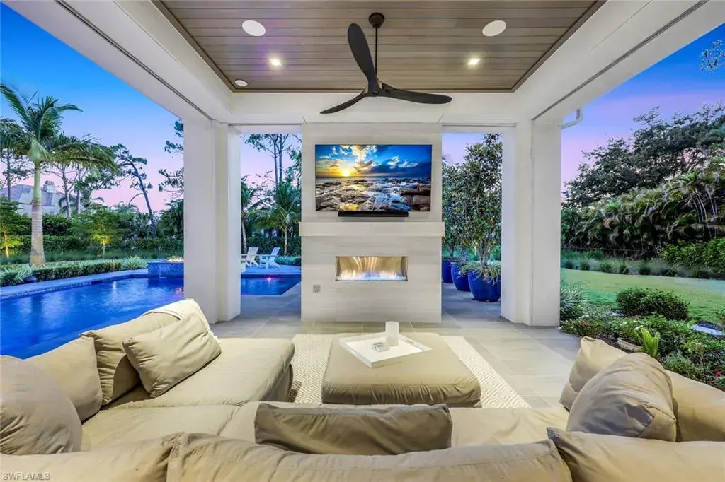 The picturesque, main covered lanai areas include outdoor kitchen, bar, Alfresco grille and pizza oven, dining and two spacious outdoor living areas, linear fireplace which all may be enclosed under automated screens. Outdoor living areas give way to a sprawling heated saltwater pool with soothing scuppers of water flowing from a large linear firepit, sun shelf and spa. Property is elegantly landscaped with the bonus of mango, lime & lemon trees.