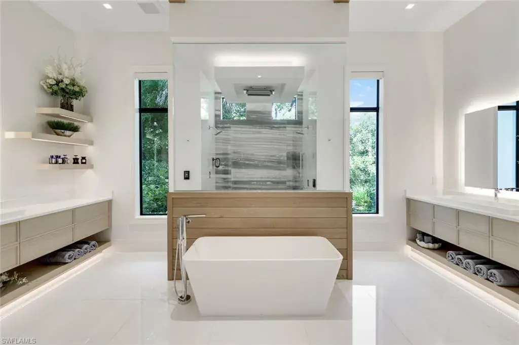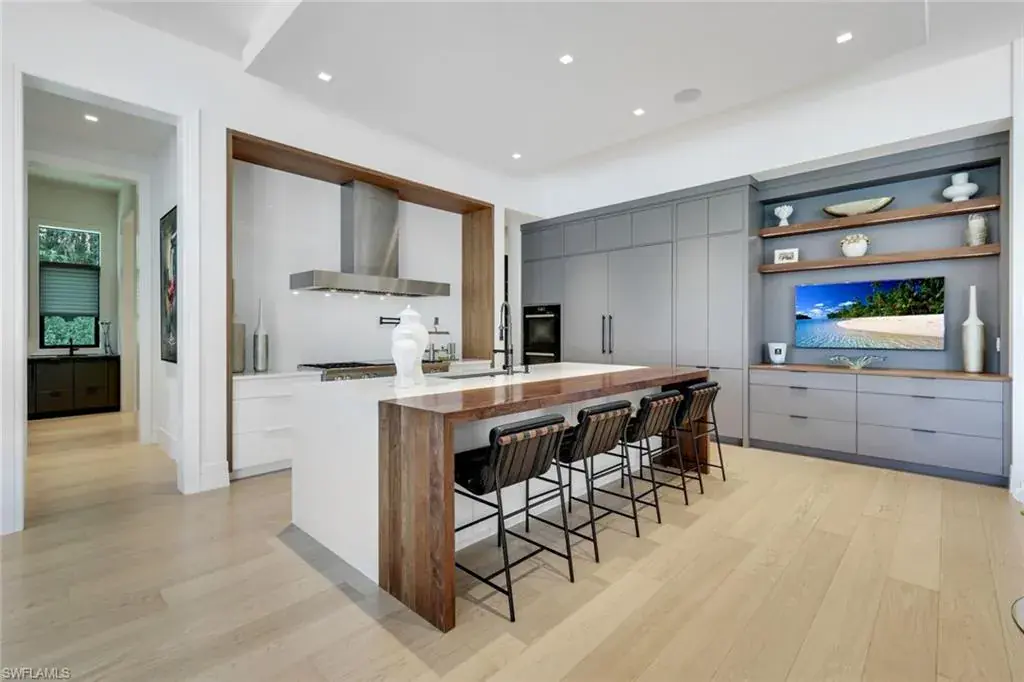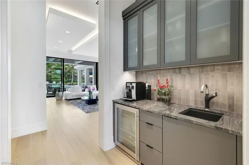 A showcase of modern elegance, this custom two-story residence was thoughtfully crafted with architectural excellence by Boyott Design. Nestled in prestigious Pine Ridge, the home embodies exceptional craftsmanship with premium finishes for a lifestyle of sophisticated comfort. All cabinetry and wood accents customized by Ruffino Cabinetry. Spectacular chef’s kitchen, accompanied by a chic full-service Butler’s pantry. Both offering upscale appliances by Miele, Thermador, Bosch and BlueStar. Well-appointed bar area with 184 bottle dual wine coolers. Additional office wet bar, plus guest station on the second floor. All bedrooms are ensuite with walk in closets. The elegant first floor primary bedroom is private with access to a spacious study, porte-cochere entry with welcome station, and his & her opulent closets. Expansive primary bathroom offers dual sides of amenities providing privacy, plus a digital Kohler Rain Shower/Body Spray System for personalization.