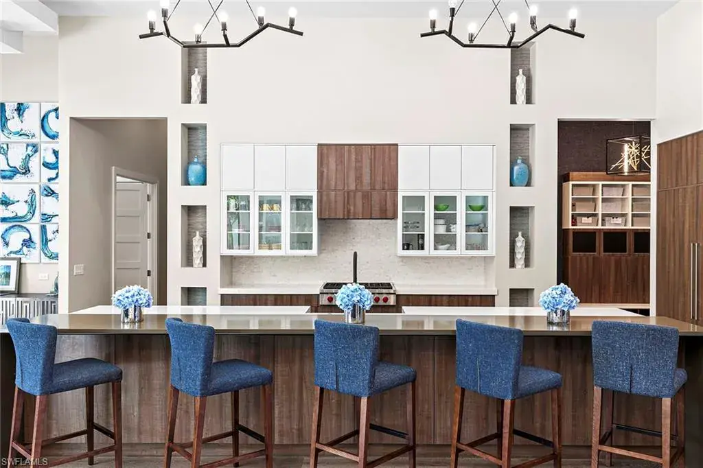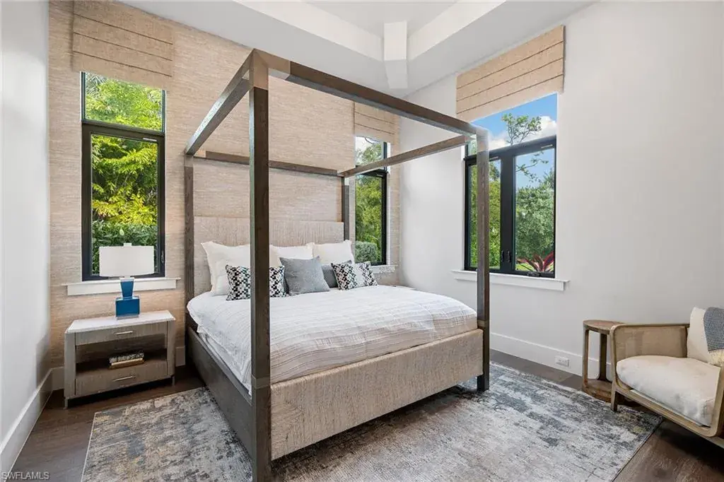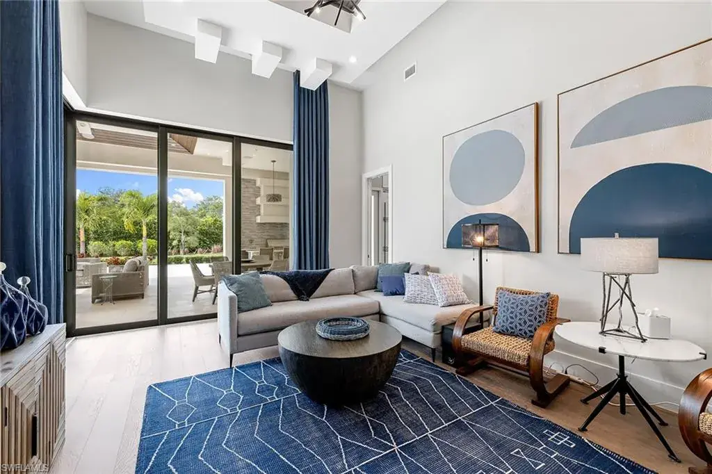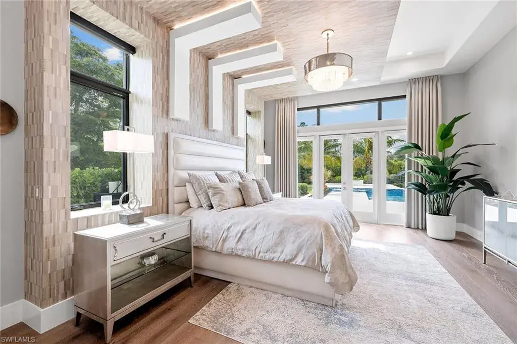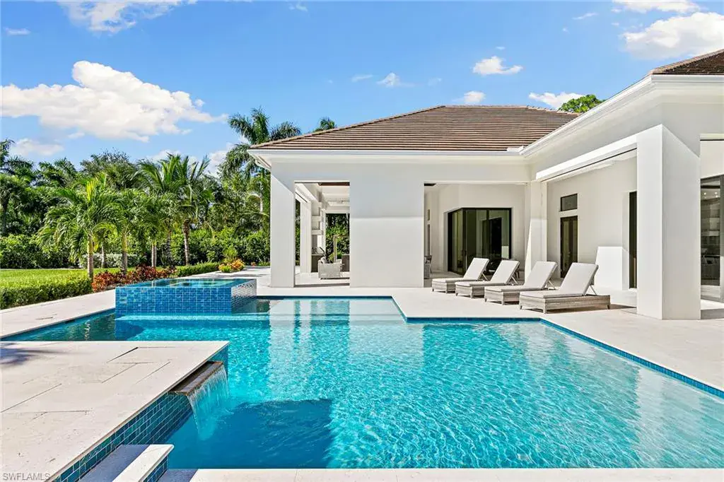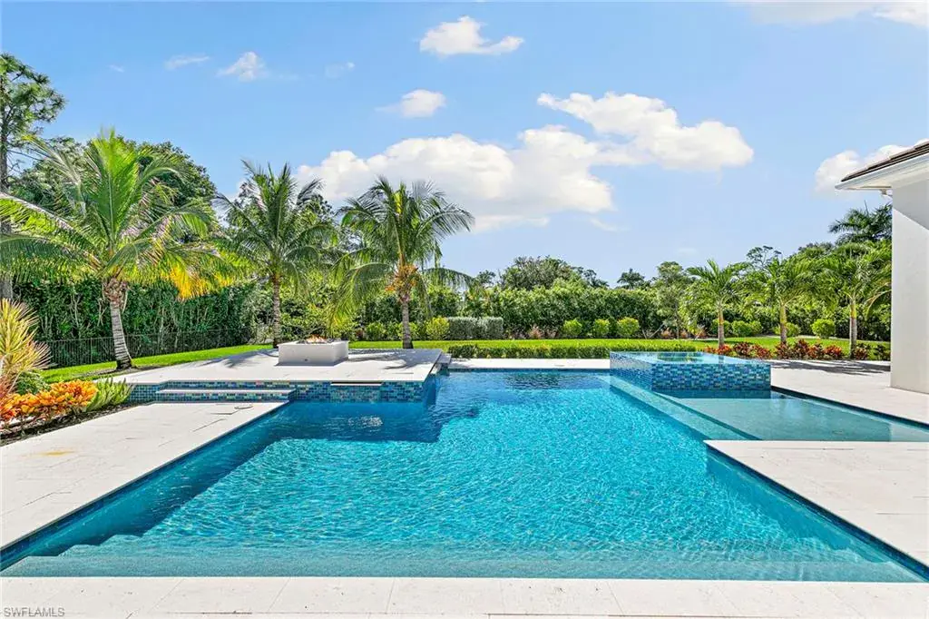 This beautiful contemporary, open-concept home was built in 2021 and sits on a quiet street in Pine Ridge Estate on 1.19 acres. The Stock Custom, single-story home, is just under 5,000 square feet and features four bedrooms with en suites plus a bonus room and study, as well as a chef’s kitchen, butler’s pantry and an enclosed glass wine room. The expansive outdoor area faces southwest and is ideal for entertaining with additional summer kitchen and bar, and multiple lounge areas that overlook the pool and spa. The residence is complete with a double two-car garage and is conveniently just a short distance to Waterside Shops, Mercato and white-sand beaches.