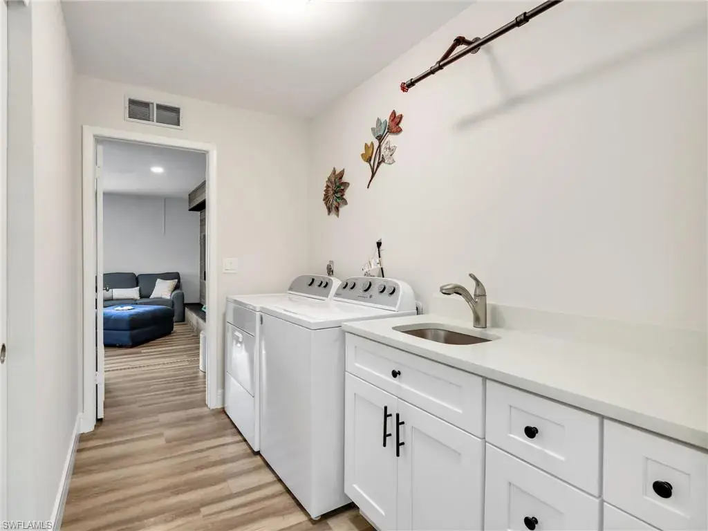 No detail was overlooked in this complete interior transformation. The home features new luxury vinyl plank flooring with updated baseboards, a freshly painted interior and exterior, and modern quartz countertops with custom cabinetry in both the kitchen and bathrooms. Bathrooms showcase beautiful new tile showers with frameless glass enclosures, complemented by upgraded fixtures, hardware, and lighting throughout. Additional enhancements include new window coverings, 2022 kitchen appliances, 2022 washer and dryer, A/C system, and beautiful landscaping for added curb appeal.