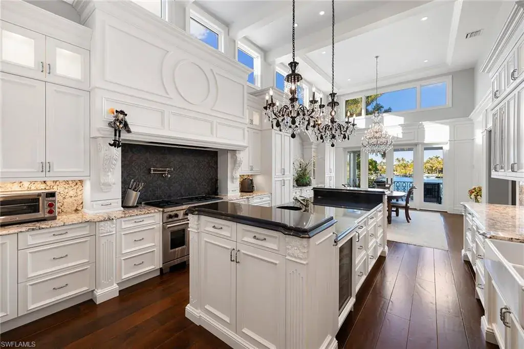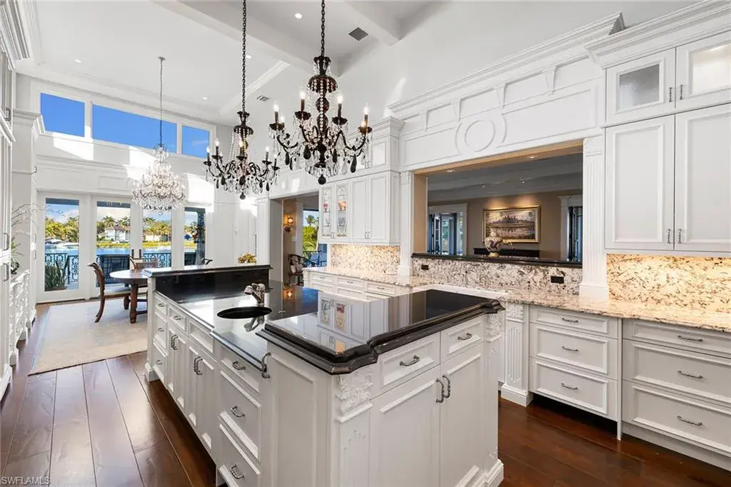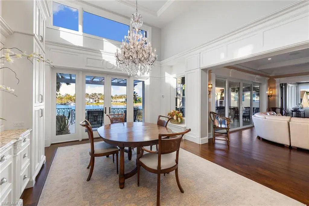 Indulge in luxurious waterfront living at this exceptional estate on the serene Cutlass Cove. With stunning wide water views, this property features a 60-foot permanent dock, ideal for boating enthusiasts and provides quick access to the gulf through nearby Gordon Pass. Car lovers will appreciate the expansive garage, offering space for six-plus vehicles and a dedicated workshop. Designed for durability, the home sits at a high elevation. The saltwater pool and spa were recently retiled and upgraded with new equipment in 2023. Set on a spacious, beautifully landscaped lot with enhanced lighting, this property creates a peaceful retreat day and night. It also includes a deeded membership to the Cutlass Cove Beach Club, granting access to a private gulf beach just moments away at 3990 Gordon Drive. The upper level offers a quiet sitting room and guest suites, ensuring comfort and privacy for visitors. This is a rare chance to own a premier estate in Cutlass Cove, combining luxury, convenience and the ultimate waterfront lifestyle. Property offers eligibility for Full Port Royal membership.