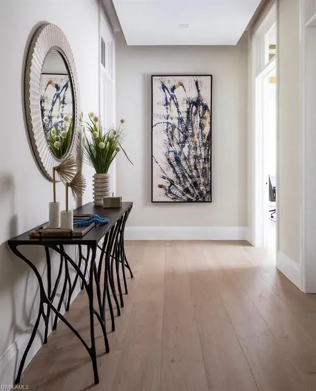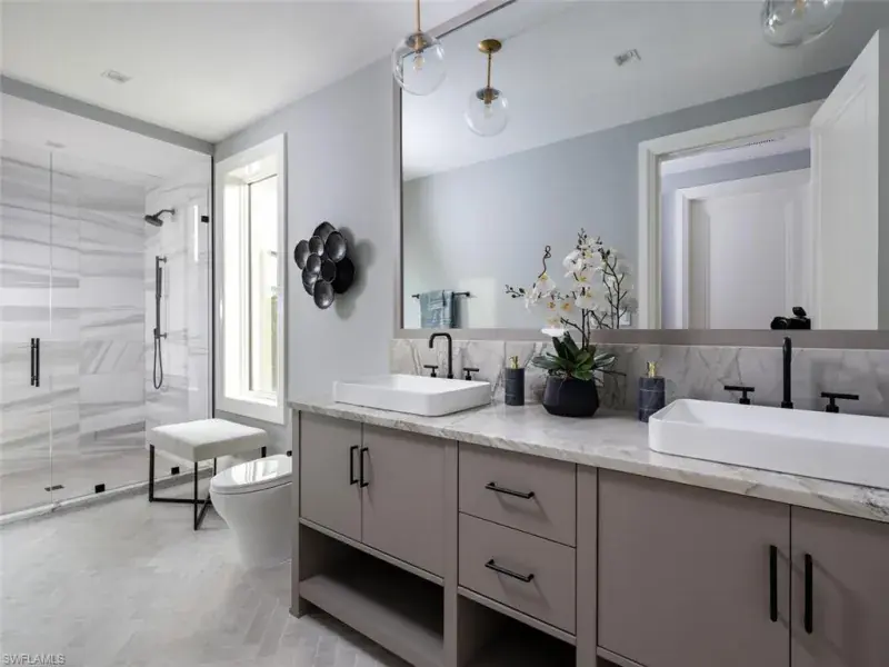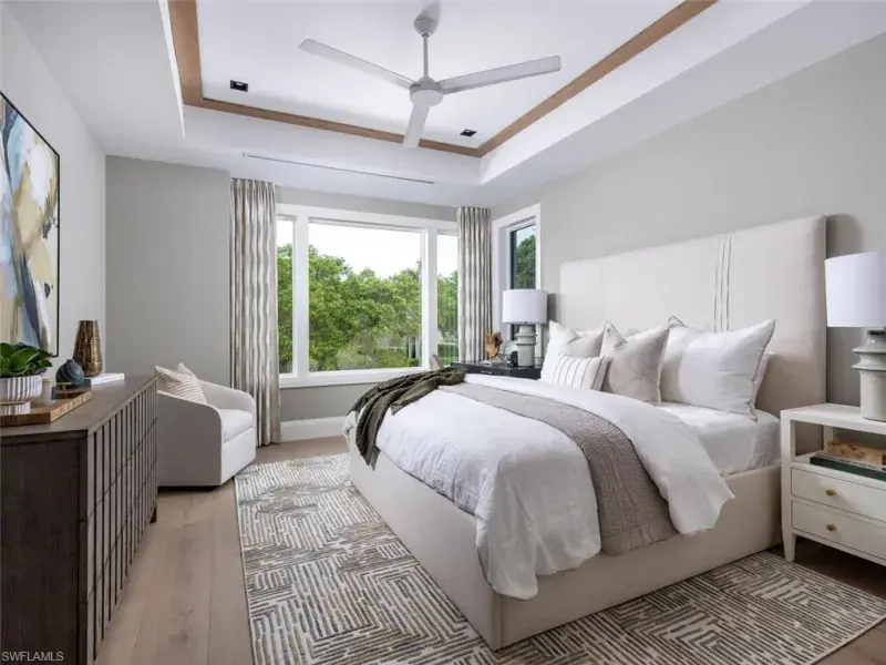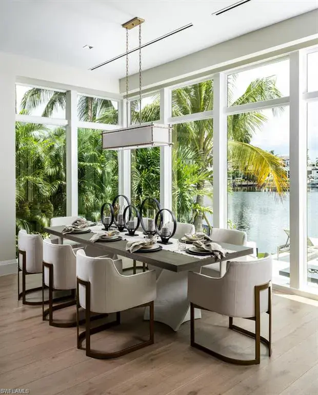 This stunning new construction home in the prestigious Port Royal neighborhood blends modern elegance with serene waterfront views of Hidden Bay. Crafted by Kukk Architecture & Design and built by Wilbrett Construction, it features exquisite interiors by Adelyn Charles Interiors and offers a sophisticated yet relaxed living experience. The floor plan balances spacious communal areas with private retreats. The primary suite on the main floor boasts posh walk-in closets, a spa-like bath, and an executive study. Four guest ensuites on the upper floor and a large bonus room with a wet bar and a second laundry area ensure comfort. Guests will enjoy dolphin sightings and boat views from the open-air balcony. Premium finishes abound, including quality bespoke cabinetry, European hardwood floors, and top-of-the-line Wolfe, Sub-Zero, and Miele appliances. Built with superior techniques, the home features full concrete construction, Andersen impact windows and doors, an elevator from the garage level, remote-controlled screens and shutters, and a whole-house generator. Car enthusiasts will appreciate the oversized three-car garage with room for lifts and an additional bay for a low-speed vehicle. The resort-style infinity pool, spa, covered lanai, summer kitchen, firepit, and lounge area create a perfect outdoor haven. Eligibility for an exclusive