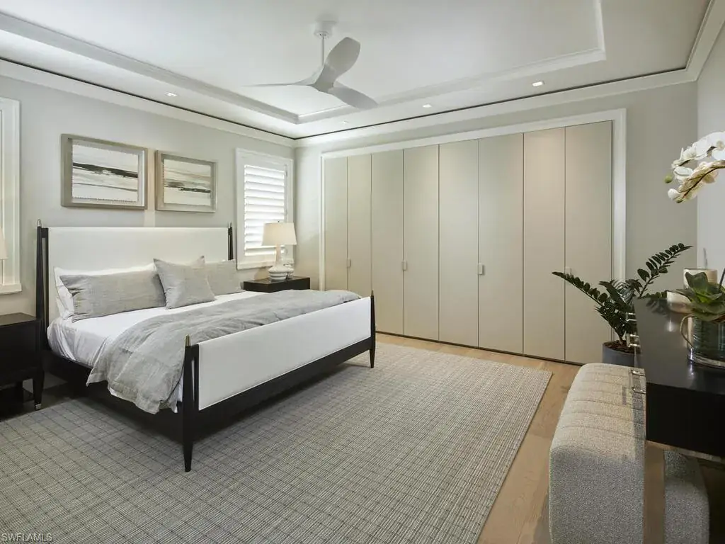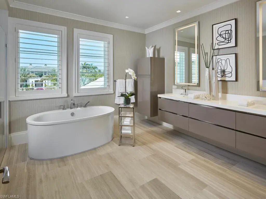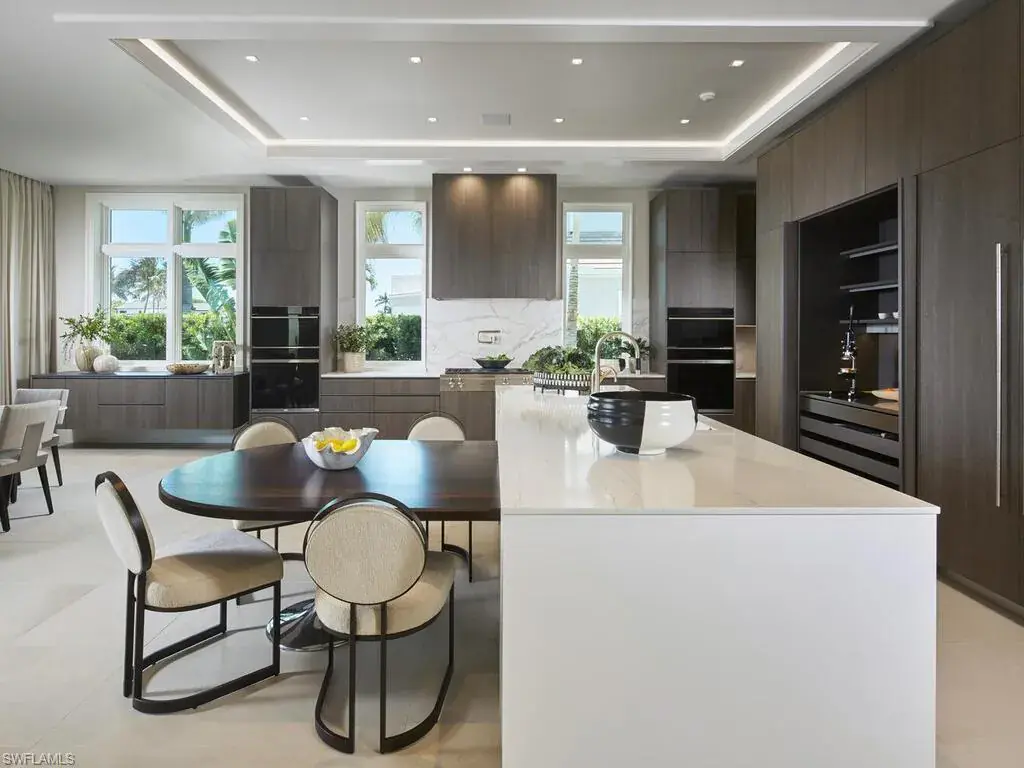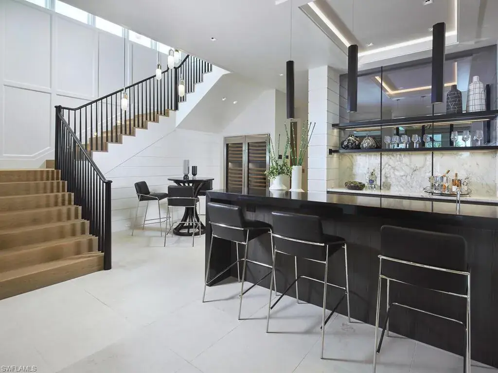 London Bay redefines luxury and encapsulates the essence of Naples’ exclusive Port Royal lifestyle in this stunning waterfront estate, which boasts 107 feet of Hidden Bay shoreline and direct access to the Gulf of Mexico. The estate’s architecture, designed by the acclaimed Kukk Architecture & Design, makes a bold statement and includes all the necessary amenities for stylish entertaining. Interior design, furnishings, finishes, and custom selections by Romanza Interior Design create a unique palette that balances elegance and effortless living. The soft contemporary aesthetic features limestone floors in the main living areas and pewter white oak wood flooring in the primary suite, study, and throughout the second floor. The open floor plan captivates with expansive living spaces, all offering beautiful bay views. Pocketing Weiland lift-and-slide doors seamlessly extend the spacious great room, kitchen, and dining area to both covered and open-air alfresco living spaces with uninterrupted flush flooring. The kitchen is tailored with Poliform cabinetry and an oversized island, a Galley workstation sink, and a built-in table for casual dining. The elegant primary suite includes an impressive gallery and a boutique-style oversized Poliform walk-in closet with custom Casali doors. Featuring luxurious dual baths connected by a shared shower, this light-filled suite boasts walls and ceilings adorned with Venetian plaster and floor-to-ceiling glass leads to a tranquil outdoor retreat. The second floor offers a VIP suite and three spacious en-suite guest rooms, as well as a dedicated exercise studio and a second laundry room that encircle a well-appointed loft. The loft features a morning kitchen and sliding glass doors that open to a bay-facing balcony. The covered lanai provides outdoor living, dining, and a large well-equipped kitchen for entertaining. Water cascades from the raised spa into the infinity edge pool’s sun shelf, which is connected by stepping stones leading to a sunning deck and a secluded lounge with a fire table. The estate also includes the conveniences of an air-conditioned three-car garage, elevator, and a generator. Eligible for Port Royal membership.