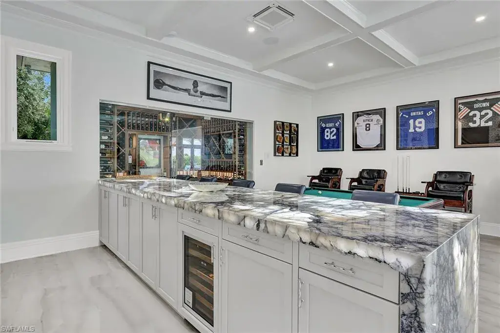 Welcome to an extraordinary opportunity to live the ultimate luxury lifestyle in Talis Park, where an exclusive full golf membership is immediately available, allowing you to skip the waitlist and begin enjoying world-class amenities from day one. Set on one of the community’s most coveted lots, this unparalleled estate is ideally on a secluded 0.5-acre, south-facing cul-de-sac lot. The residence is a masterpiece of design and sophistication, offering an expansive floor plan with two lavish primary suites and four additional bedroom suites, each with a beautifully remodeled ensuite bath. A private casita provides an ideal, independent retreat for guests. Convenience and peace of mind are paramount, with an in-home elevator for easy access to all levels and impact glass windows and doors for ultimate protection. For the car enthusiast, the air-conditioned five-car garage offers abundant space for vehicles and storage. Go outside into your private oasis, where breathtaking views of the pristine 15th hole and a sparkling lake create a serene backdrop. This outdoor sanctuary is an entertainer’s dream, complete with a fully equipped outdoor kitchen, a stunning saltwater pool and spa, a cozy gas fire pit and dramatic fire bowls. Inside, the home is appointed with extraordinary features, including electric and gas fireplaces, a bar lounge with a backlit quartz bar, a wine dispenser and a stunning 1,100-bottle temperature-controlled wine room. A recent 2023 roof adds a layer of security and value to this exceptional property. Talis Park offers a refined, active lifestyle with a spectacular 18-hole Pete Dye-designed golf course and an array of amenities including pickleball, tennis, bocce, multiple dining options, a state-of-the-art fitness center, and a luxurious spa. You’ll also find scenic trails for recreation and a dog park. This ideal location places you just minutes from pristine beaches, fine dining, upscale shopping and RSW International Airport. This one-of-a-kind estate leaves nothing to be desired, offering a unique and refined living experience. Outstanding value, priced under appraised value, so don’t miss your opportunity to own this remarkable residence.