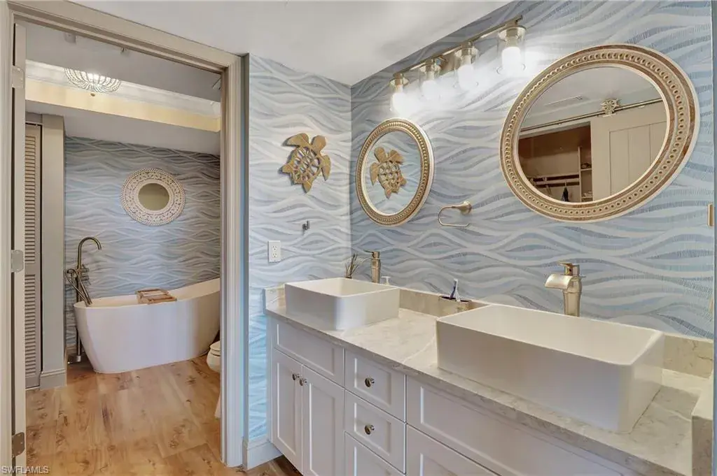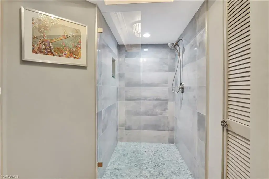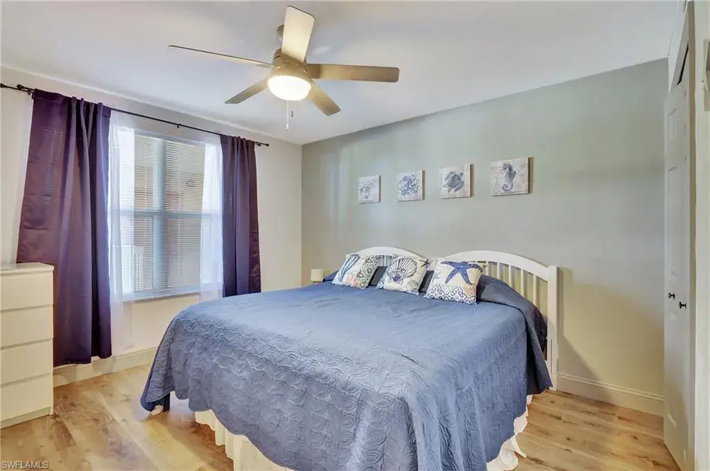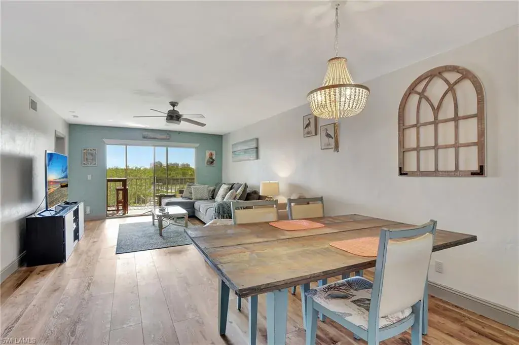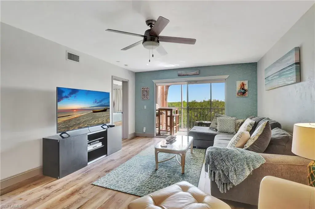 FACING WEST!! VIEWS & SUNSET SKIES from your lanai, living area and master bedroom. Boat Lovers Dream. This Quality renovated 2 bedroom, 2 bath Condo was done a year ago, kitchen wall removed, over-sized quartz counters, extended to backsplash, additional bar/cabinets added with wine refrig., plus stainless appliances. The (Luxury vinyl) wide wood grain floors flow throughout. Lighting, fans & all door handles offer a stylish modern Decor. Master bath has separate dual sinks, a custom soaking tub, glass enclosed custom shower & even added a linen closet. Guest bath has glass enclosed walk-in shower. A/C replaced, tankless water heater, electric hurricane shutter. THIS BLDG HAS LOWEST HOA IN WIGGINS BAY & ready for a new paint color. Come enjoy and have Income too. Seasonal renter for Jan 3 – April 3 at $19K. This condo is within steps of the Tarpon Cove Beach & Racquet Club with amenities to enjoy. Restaurant, Tiki bar, tennis, fitness, boat taxi to beach, resort pool, bocce and loads of social events, private membership , ask about details/costs.
