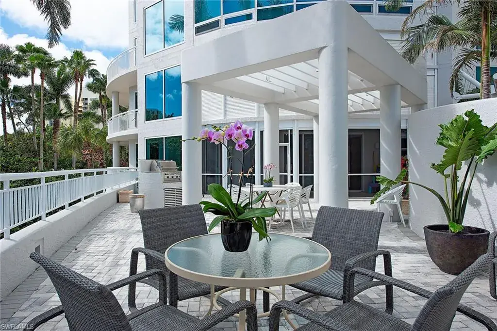 Tropical, lush landscaping greets you from the moment you enter this light-filled second-floor residence. A deeded 1,600-square-foot open-air terrace, equipped with a gas grill, inspires endless possibilities for creating your exclusive outdoor oasis. Easily access the pool, beach and garage parking spaces from your private gate, which is also ideal for taking your pet for a walk without going through the building. These special features offer a unique blend of luxurious high-rise living and the feel of a single-family home. Spanning over 3,300 square feet, this desirable floor plan includes three bedrooms and 3.5 baths, 10-foot ceilings and two screened and shuttered lanais. Provence is gated and offers world-class amenities, including 24-hour security, fitness center, tennis courts, three guest suites, a pool overlooking the Gulf and is directly across from Venetian Village.
