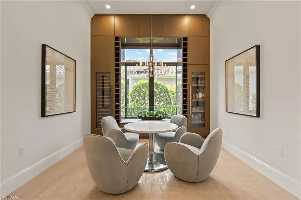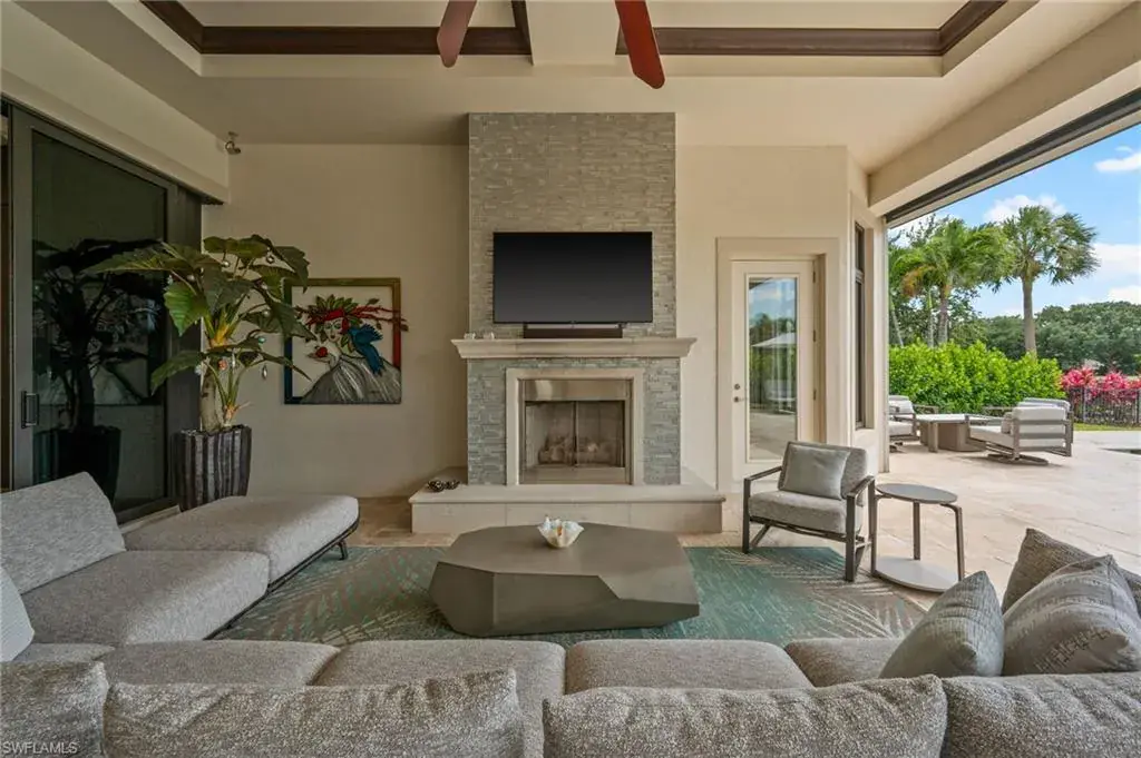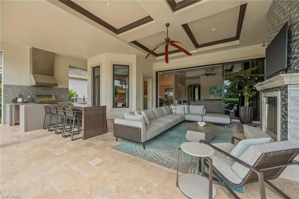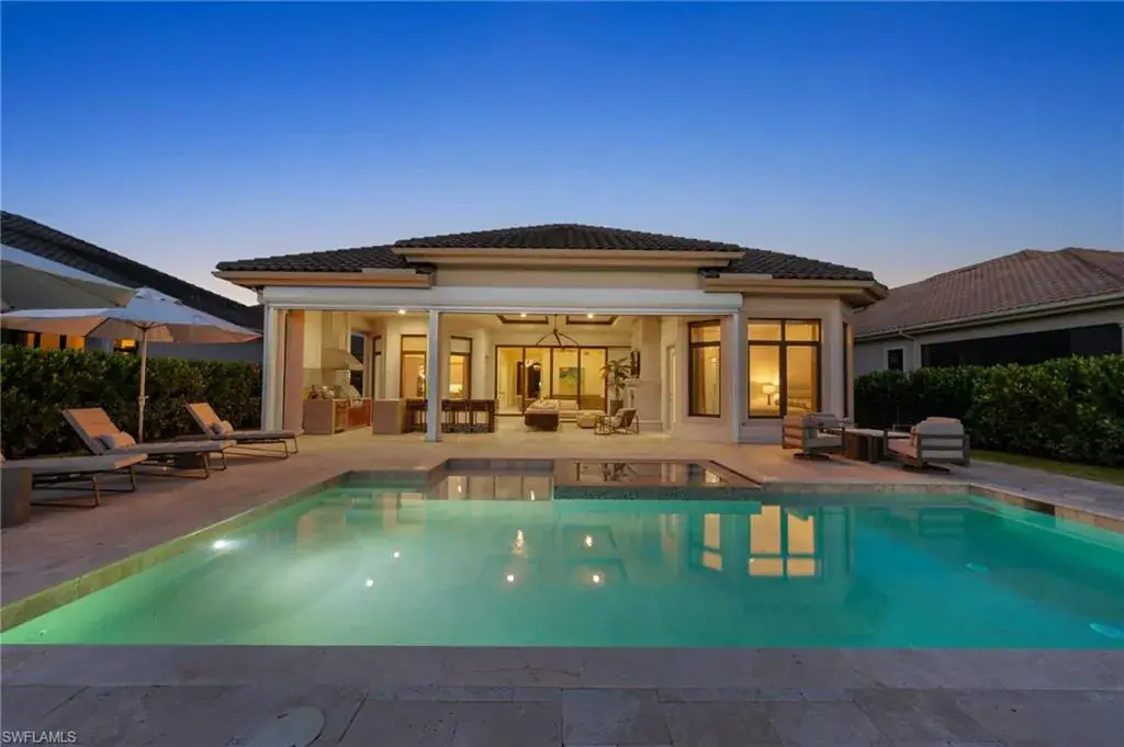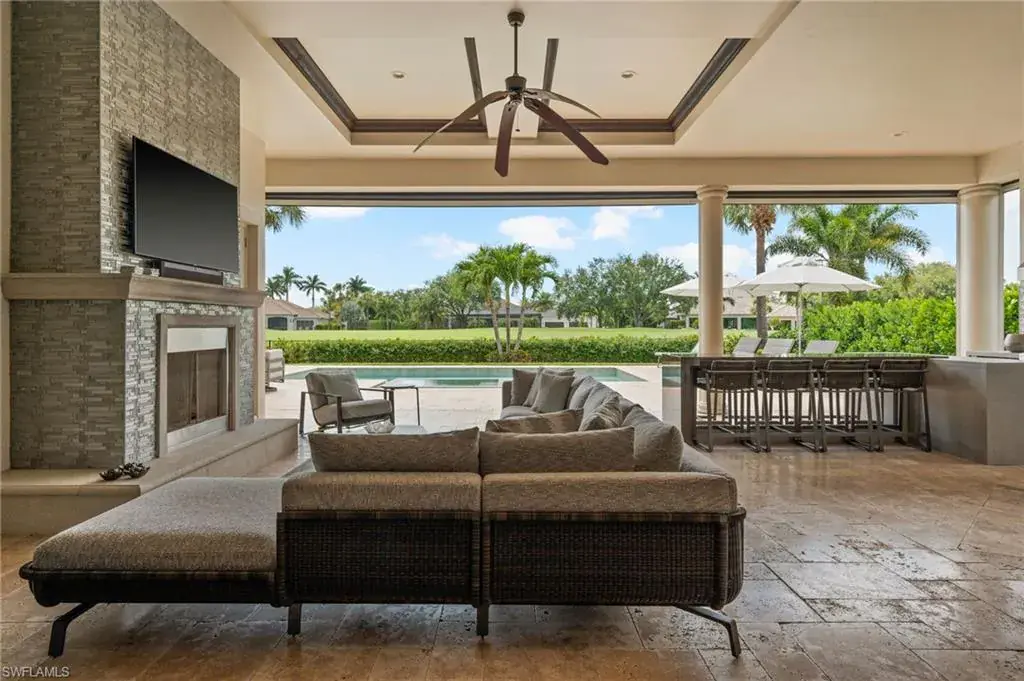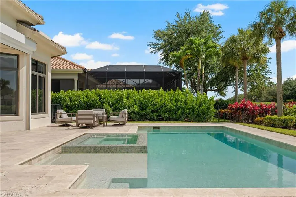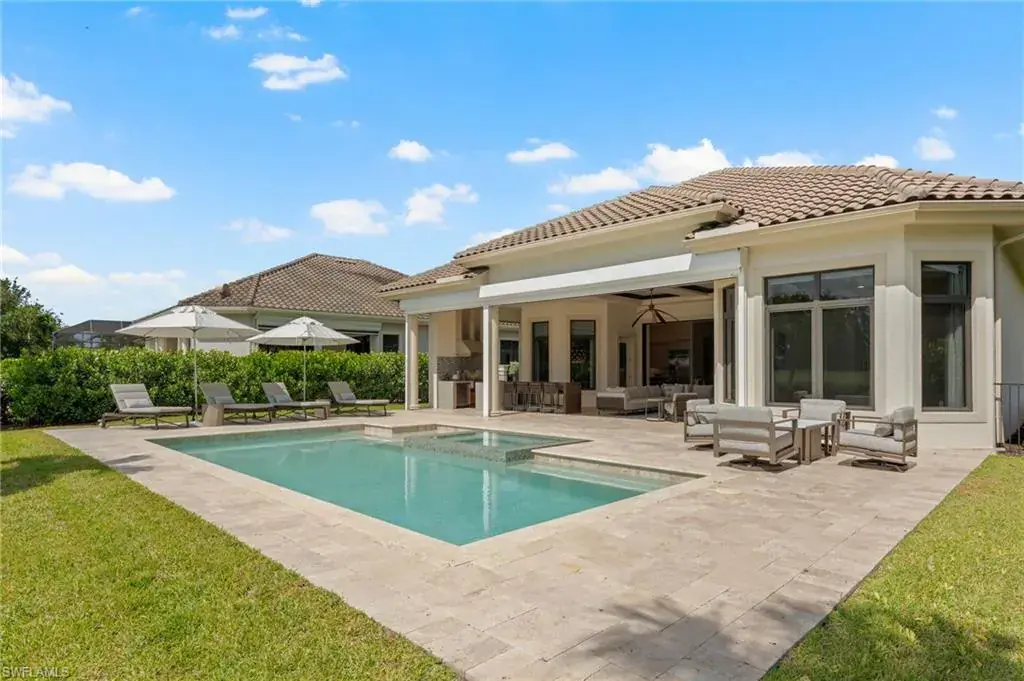IMMEDIATE GOLF AVAILABLE – SKIP THE WAITLIST! Experience the timeless merging of chic elegance and clean lines all within the existing open spaces of this updated villa. Reimagined by Jorge Castillo Interiors/Miami, every detail has been meticulously curated to create a refined, tranquil space that’s both sophisticated and inviting. New floors were added to match the main area flooring so that each room merges effortlessly. The sleek, tailored millwork of the custom built-ins thoughtfully integrated throughout the home offers both aesthetic appeal and practical storage. The split floor plan features an open great room with gathering and dining areas as well as a gourmet kitchen boasting a large new island plus stainless steel appliances. The high design continues with a go-to wine room/game room anchored by built-in wine coolers. The primary suite has been redesigned with two re-styled walk-in closets, new shower tile and shower glass, new faucets and an enviable view. Many new designer light fixtures and fans are featured throughout as well as a renovated, air-conditioned 3-car garage with new epoxy flooring and insulated ceiling and doors. Take it outside for amazing sunset views from an expansive lanai that is the envy of the area. All new retractable screens, new tile surrounds for fireplace and grill backsplash, new cabinetry and waterfall countertops with a separate new counter for al fresco dining. Surrounded by new landscaping and open golf course views, there is no need to go inside!