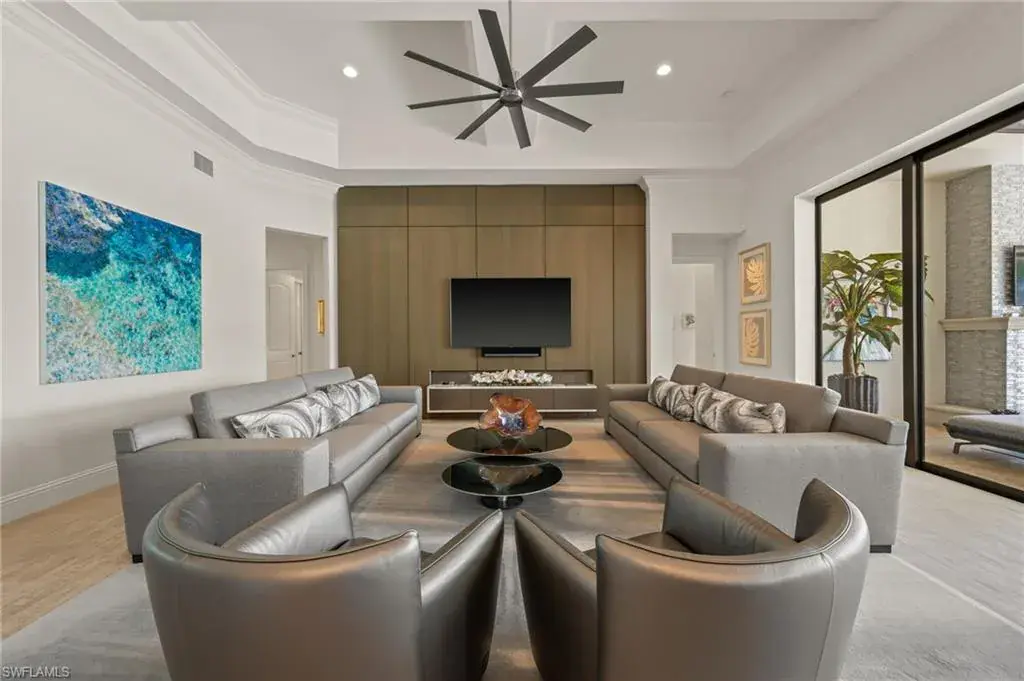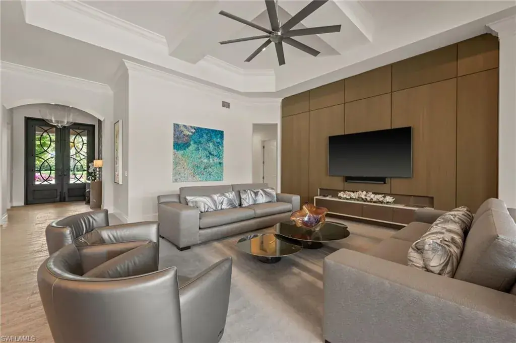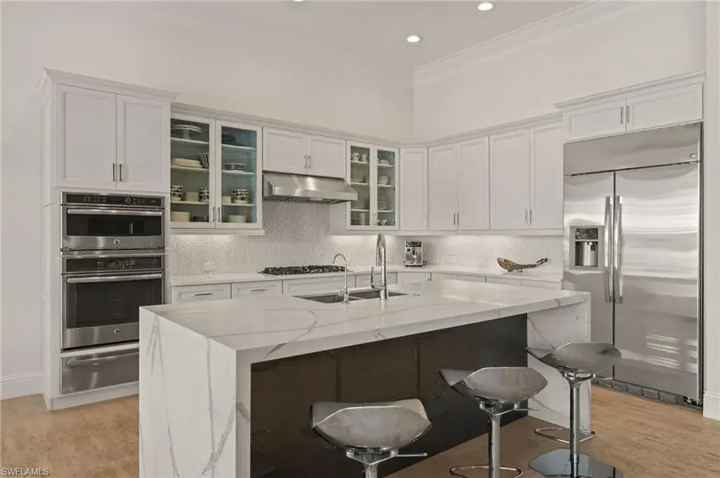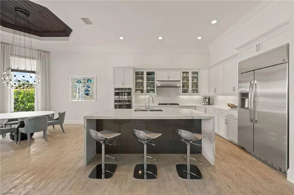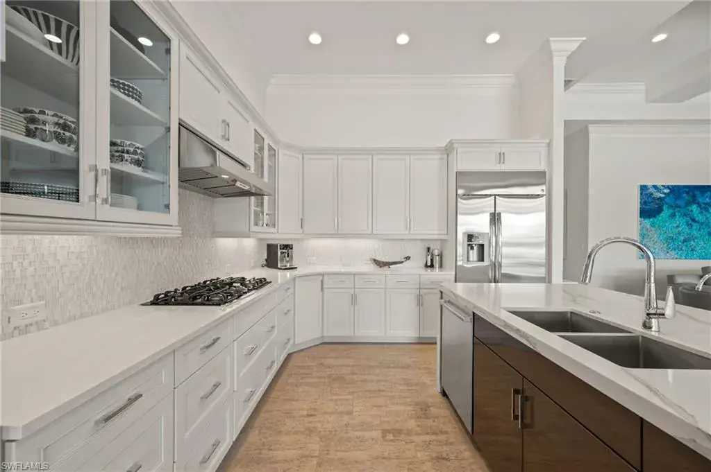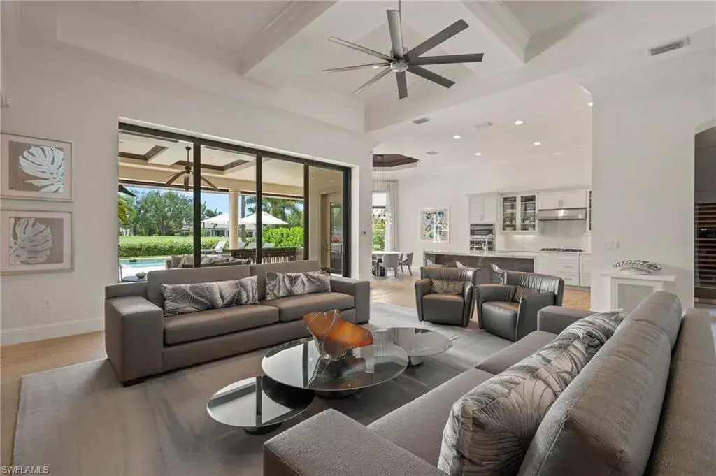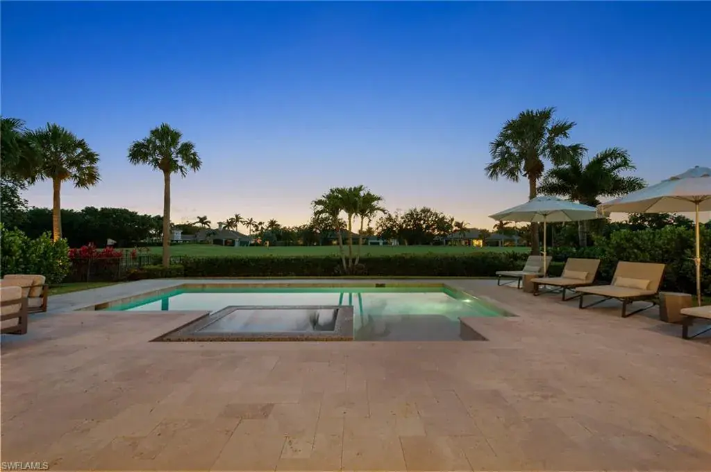 IMMEDIATE GOLF AVAILABLE – SKIP THE WAITLIST! Experience the timeless merging of chic elegance and clean lines all within the existing open spaces of this updated villa. Reimagined by Jorge Castillo Interiors/Miami, every detail has been meticulously curated to create a refined, tranquil space that’s both sophisticated and inviting. New floors were added to match the main area flooring so that each room merges effortlessly. The sleek, tailored millwork of the custom built-ins thoughtfully integrated throughout the home offers both aesthetic appeal and practical storage. The split floor plan features an open great room with gathering and dining areas as well as a gourmet kitchen boasting a large new island plus stainless steel appliances. The high design continues with a go-to wine room/game room anchored by built-in wine coolers. The primary suite has been redesigned with two re-styled walk-in closets, new shower tile and shower glass, new faucets and an enviable view. Many new designer light fixtures and fans are featured throughout as well as a renovated, air-conditioned 3-car garage with new epoxy flooring and insulated ceiling and doors. Take it outside for amazing sunset views from an expansive lanai that is the envy of the area. All new retractable screens, new tile surrounds for fireplace and grill backsplash, new cabinetry and waterfall countertops with a separate new counter for al fresco dining. Surrounded by new landscaping and open golf course views, there is no need to go inside!