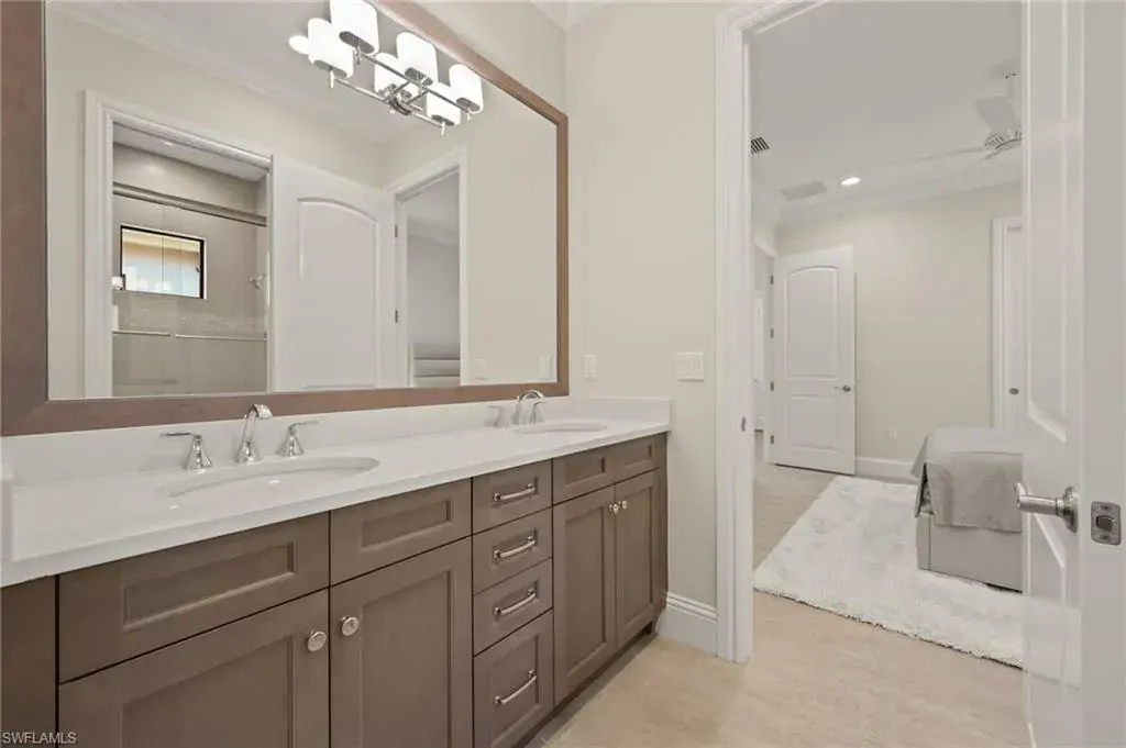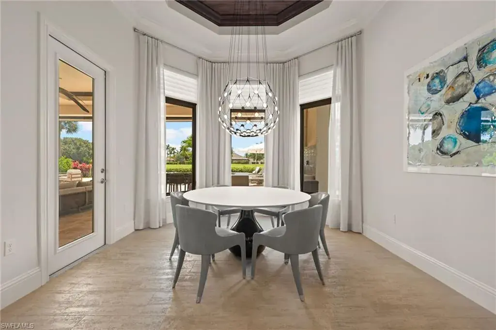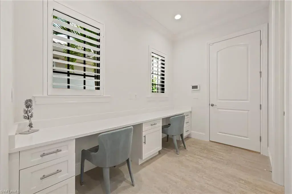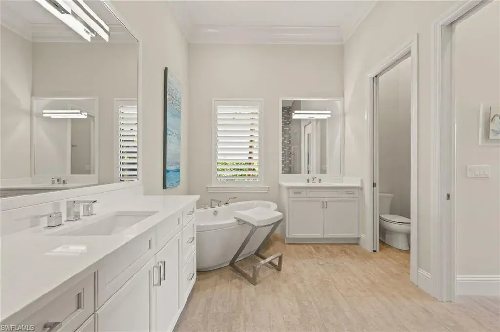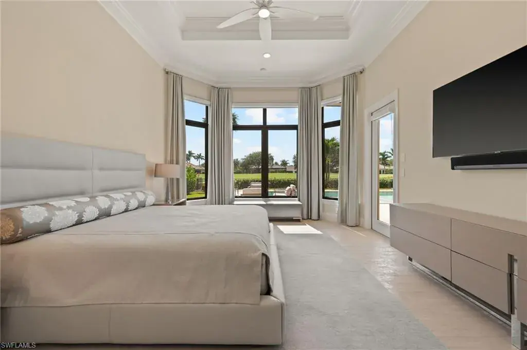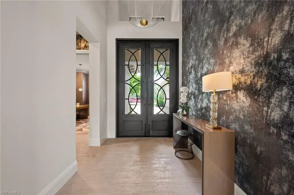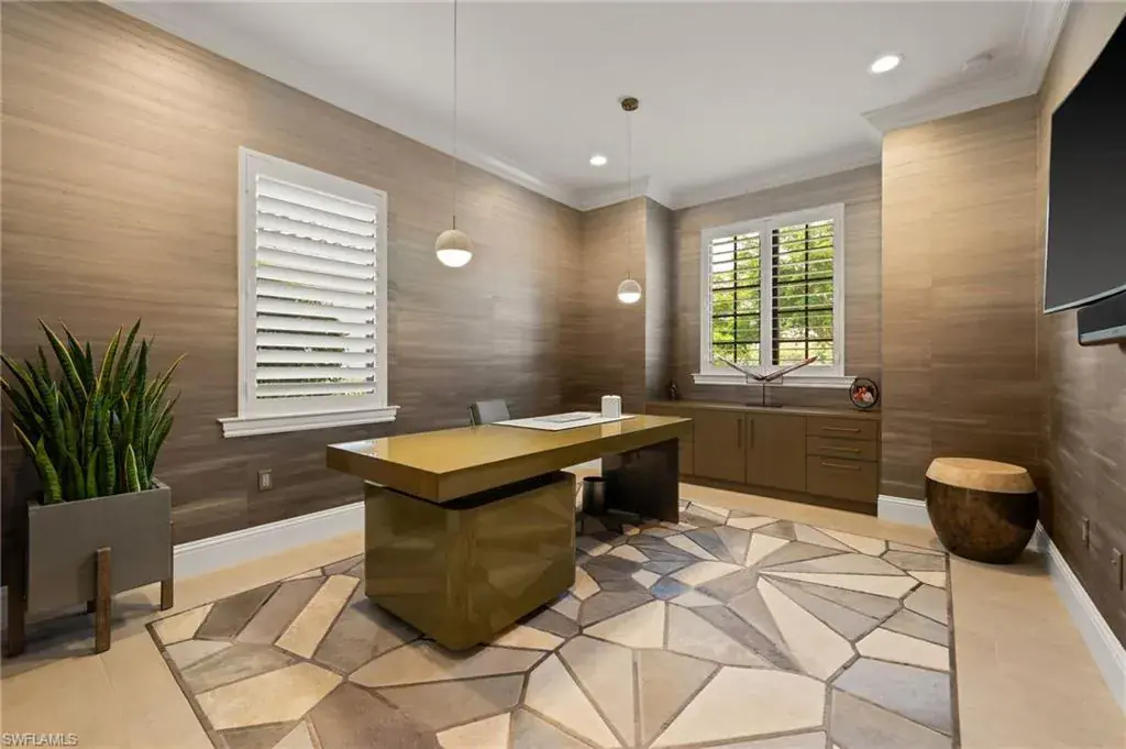 IMMEDIATE GOLF AVAILABLE – SKIP THE WAITLIST! Experience the timeless merging of chic elegance and clean lines all within the existing open spaces of this updated villa. Reimagined by Jorge Castillo Interiors/Miami, every detail has been meticulously curated to create a refined, tranquil space that’s both sophisticated and inviting. New floors were added to match the main area flooring so that each room merges effortlessly. The sleek, tailored millwork of the custom built-ins thoughtfully integrated throughout the home offers both aesthetic appeal and practical storage. The split floor plan features an open great room with gathering and dining areas as well as a gourmet kitchen boasting a large new island plus stainless steel appliances. The high design continues with a go-to wine room/game room anchored by built-in wine coolers. The primary suite has been redesigned with two re-styled walk-in closets, new shower tile and shower glass, new faucets and an enviable view. Many new designer light fixtures and fans are featured throughout as well as a renovated, air-conditioned 3-car garage with new epoxy flooring and insulated ceiling and doors. Take it outside for amazing sunset views from an expansive lanai that is the envy of the area. All new retractable screens, new tile surrounds for fireplace and grill backsplash, new cabinetry and waterfall countertops with a separate new counter for al fresco dining. Surrounded by new landscaping and open golf course views, there is no need to go inside!