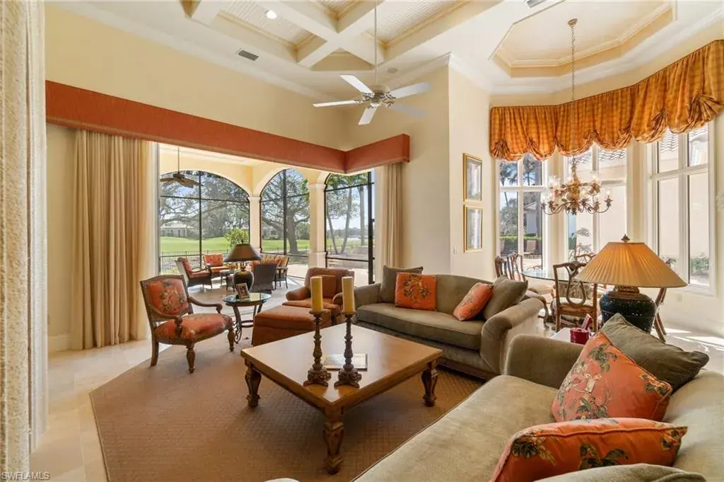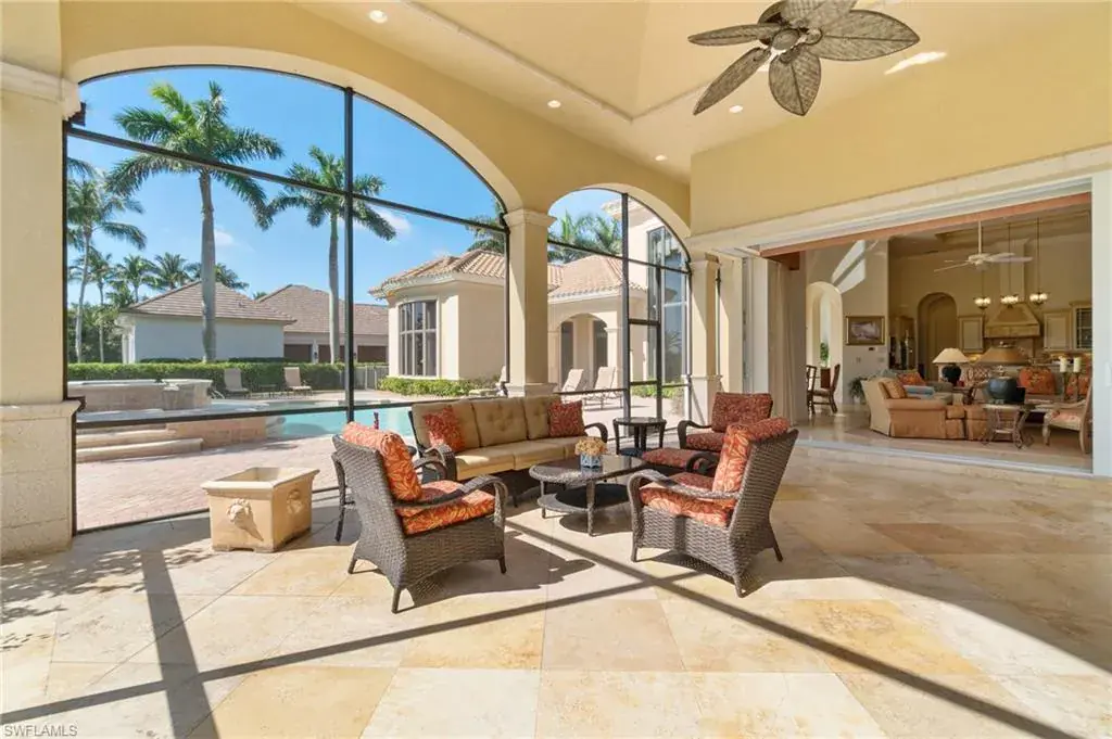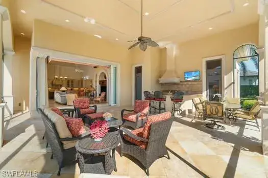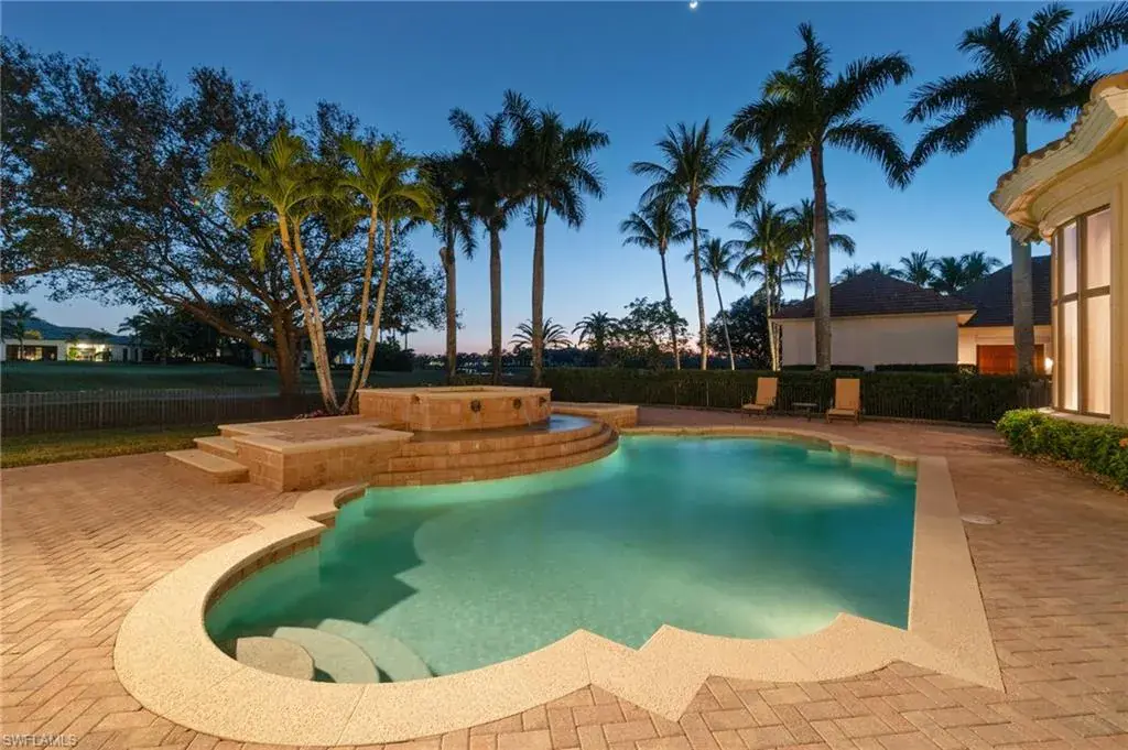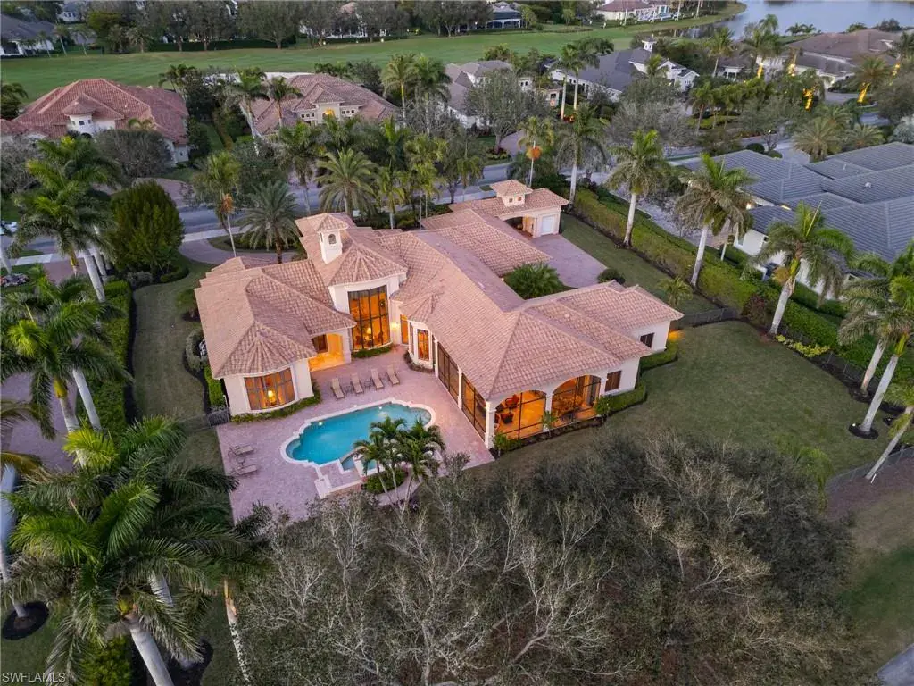 OPTIONAL TRANSFERRABLE GOLF MEMBERSHIP AVAILABLE FOR IMMEDIATE GOLF. Welcome to this stunning home located in the prestigious community of Quail West in Naples, Florida. Quail West is one of the premier golf course communities in Southwest Florida, with 2 golf courses, 8 tennis courts and 4 pickle ball courts, plus much more. As you step onto the property, you are greeted by lush landscaping that enhances the home’s curb appeal. This luxurious 4BR+Den home offers FANTASTIC REAR VIEWS OF THE GOLF COURSE AND LAKE and is the epitome easy living in Florida. Located on the 10th hole of the Lakes course, this southern exposure setting makes for breath taking sunset views over the 42′ pool with spa. Upon entering the home through the 12′ high wood doors you are greeted with an elegant and spacious interior, with high ceilings and large windows that flood the home with natural light, creating a bright and welcoming ambiance, not to mention the amazing views. Everything is top-of-the-line with custom cabinetry and finishings. The master suite is a true sanctuary with a morning coffee bar, luxurious en-suite bathroom with 2 separate commode areas, bidet, double shower, jetted tub and generous closet space. Additional en-suite bedrooms are spacious and thoughtfully designed, accommodating family and guests comfortably. The gourmet kitchen is a chef’s dream, complete with modern appliances, 2 dishwashers, 2 sinks, warming draw, built-in miele coffee maker, ppt-filler, butlers pantry, ample counter space and a breakfast bar which is perfect for entertaining guests and culinary enthusiasts. The wine room is centrally located off the dining room, kitchen and living room with wet bar. Library is tastefully done with Brazilian cherry flooring, wood built-ins and custom ceiling. The living area opens to an expansive patio that is ideal for alfresco dining, lounging, or simply soaking in the beautiful Florida sunsets. Outdoor kitchen/lanai has built-in gas grill, bar refrigerator and sink with screened in area. 3-car attached over-sized garage plus a detached golf cart garage connected by a porte-cochere in the court yard. Underground propane tank for cooking and heating the pool/spa. 5900 Burnham Rd is a rare find that promises to elevate your living experience on one of the most desirable streets within Quail West with both golf and water views and located in Collier county. Close to the club house, golf and all the amenities that Quail West has to offer. This home offers easy access to Naples’ renowned beaches, shopping, dining, and cultural attractions. Whether you’re seeking an active lifestyle or a peaceful retreat, Quail West has it all. This is a home is being sold furnished with designer furniture, so don’t miss this opportunity to own a slice of paradise in Naples! Discover the endless possibilities that await you at this remarkable property.