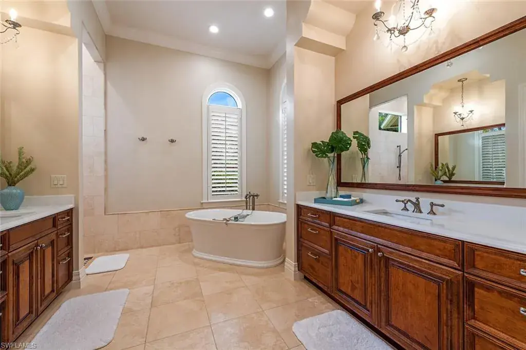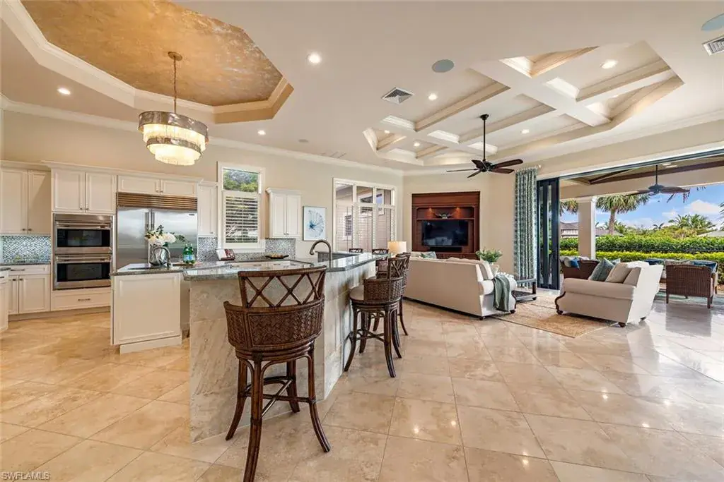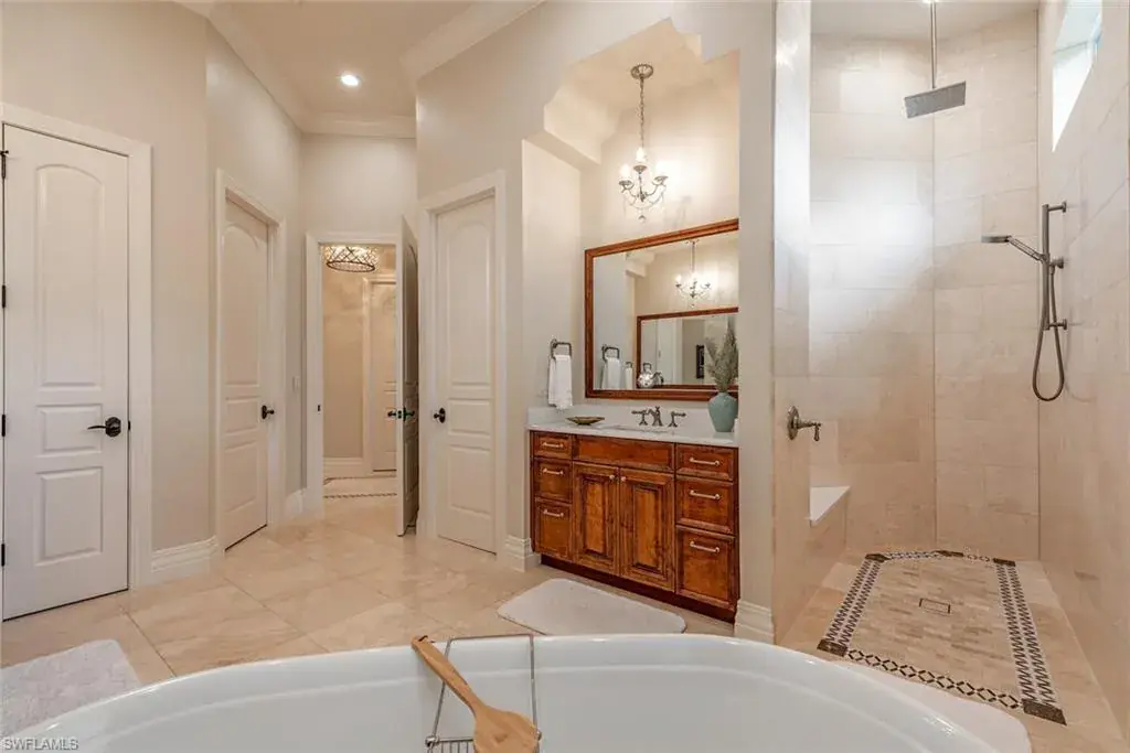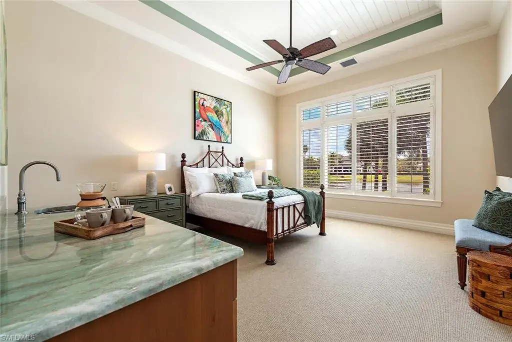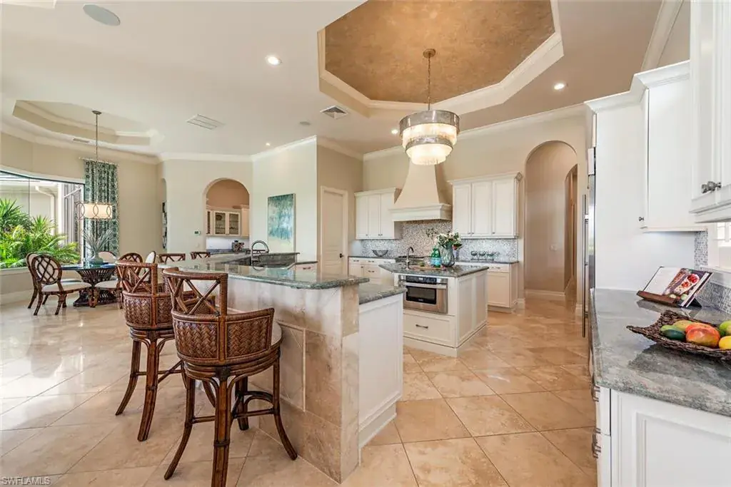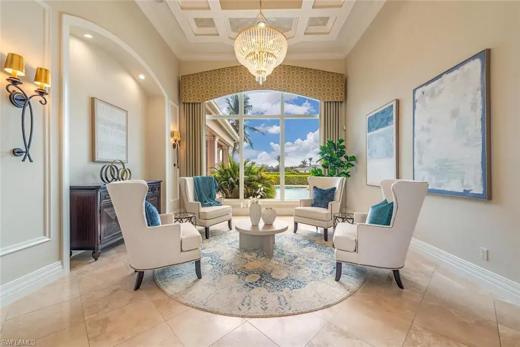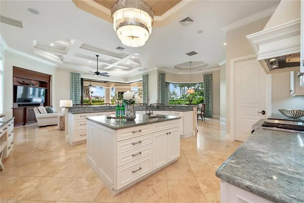 Transferrable House Membership included and Quail West’s new Resident Golf Member-in-Waiting Membership category is available and waitlist is short. Experience unmatched luxury living in this estate home built by McGarvey Custom Homes in 2013, nestled within the prestigious enclave of Quail West. Occupying a expansive 0.82-acre lot on a quiet street, this residence offers captivating water views and spans 4,758 square feet of living space on a single level. This spacious home includes 5 bedrooms with walk-in closets and 5 en-suite bathrooms, a study, nearly 850 square feet of outdoor covered lanai living space, air-conditioned garage parking for 4 cars and a fabulous custom pool and spa. The gourmet kitchen is open to the indoor and outdoor living areas and features a Wolf gas cooktop, double wall ovens, Sub-Zero refrigerator, a pantry, an island with a prep sink, a large bar for ample seating. The adjacent butler’s pantry offers a wine cooler, beverage fridge, ice maker and prep sink. Designed for year-round enjoyment, the expansive covered lanai features an outdoor gas fireplace, a beautifully crafted ceiling, a top-tier full outdoor kitchen with a 36” Wolf grill, Sub-Zero fridge, prep sink and bar for your guests. Motorized screens and shutters around the lanai provide protection from the elements, while the heated pool and spa provide the perfect space for relaxation and southern exposure sun-soaked lounging. The spacious primary suite offers a sitting area with a bay window, a tray ceiling, 2 custom walk-in closets and a spa-inspired bath. One of the 5 bedroom suites is a separate casita ideal for guests, accessed through the lanai and featuring lake views, a wet-bar, fridge and spacious bathroom with dual sinks. Highlights include soaring ceiling heights of 12’9 to 14’9 feet, floor-to-ceiling living room windows with pool and water views, a zero-corner pocket slider in the family room for seamless indoor-outdoor living, impact glass windows and doors throughout and a whole house generator. Other features include extensive crown molding, custom ceiling details, solid 8’ tall doors, in-ceiling speakers and wood planation shutters. Quail West offers a captivating lifestyle in an exquisite community with 36-holes of pristine Arthur Hills-designed championship golf, a 100,000 SF grand clubhouse that’s the hub of social activities with multiple dining options, an indoor lagoon-style Junior Olympic-sized pool and a rejuvenating full-service spa. The sports center area offers 8 clay hydro tennis courts, 4 pickleball courts, 4 bocce courts and a 2-story fitness & wellness building.