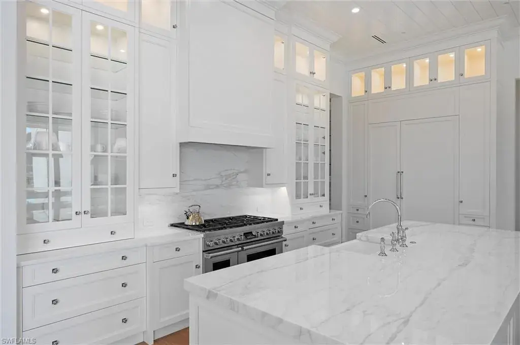The chef’s kitchen is a masterpiece, featuring marble countertops protected by TuffSkin, dual dishwashers, and top-of-the-line Sub-Zero appliances. Custom cabinetry by Design Works ensures seamless storage and beauty throughout the home.