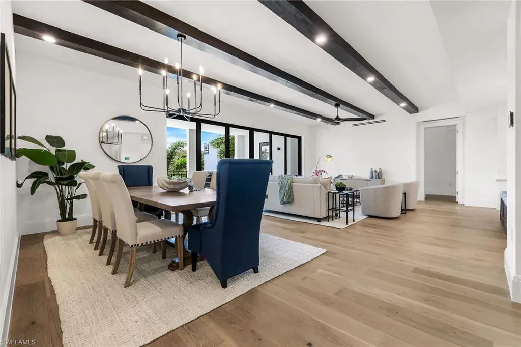 Inside, an open-concept floor plan blends style and functionality with soaring beamed ceilings, designer lighting, and Legno Bastone wide-plank wood flooring, creating a warm yet sophisticated ambiance. The gourmet kitchen is a chef’s paradise, equipped with top-of-the-line Sub-Zero, Wolf, and Miele appliances, exquisite quartz countertops, a gas cooktop, Sub-Zero wine refrigerator, and premium Dornbracht, Franke, and Toto fixtures. Each bathroom has been custom designed with luxury finishes that reflect the home’s refined coastal aesthetic.