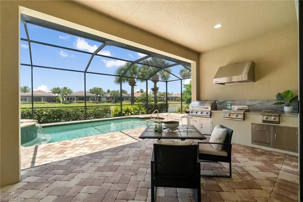 Flooring throughout the home was chosen with both looks and durability in mind: oversized, 20 inch tile runs on the diagonal through the main living areas, and warm wood-look planks add a cozy touch elsewhere — even on the stairs. Crown molding in every room adds a subtle, upscale finish, while built-in speaker wiring and a central vacuum system offer added convenience. This home was built by WCI, known for their quality and attention to detail, this home offers peace of mind along with everyday luxury, while the Portofino Model is 1 of ONLY 3 of it’s kind in the entire community! The home also features impact-rated windows and doors throughout, and a FULL-HOUSE GAS GENERATOR was recently added — connected directly to the main panel to keep the first floor powered when needed. Outside, the backyard is built for entertaining. The builder-installed outdoor kitchen is fully equipped and ready for everything from laid-back weekends to lively gatherings.