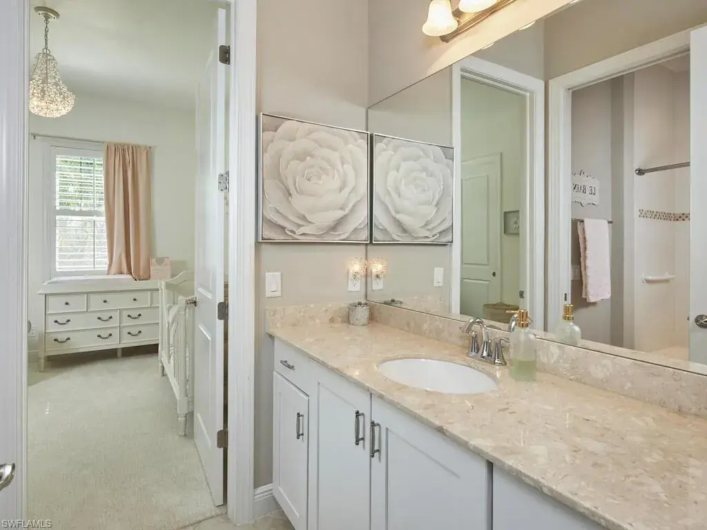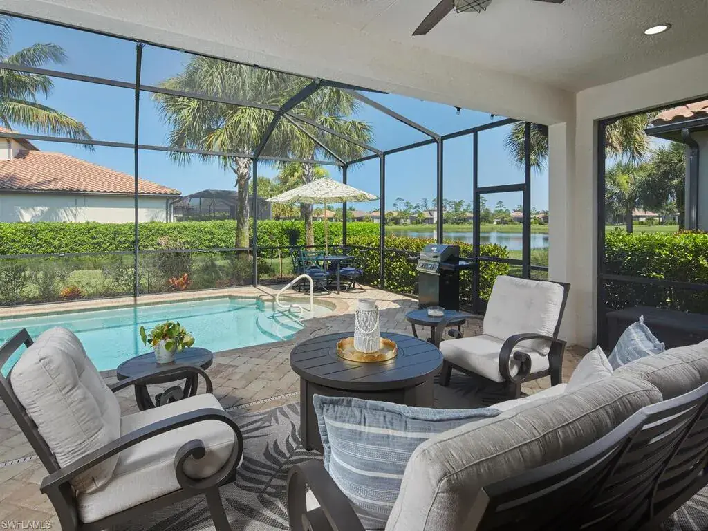 Exceptional 3 bedroom plus den, 2 and a half bath home located within gated Raffia Preserve! Built by WCI, this Heron Model home features luxurious finishes throughout, a desirable open floor plan, and ample natural light. Recent upgrades to this meticulously maintained home include plantation shutters, custom electric shades in the living room, luxury vinyl flooring in the main living space, new carpet in the bedrooms, new pendant light fixtures, and more. The gorgeous kitchen features beautiful white cabinetry, large center island, granite counters, and stainless-steel appliances. The master suite is a private retreat with spa-like ensuite bath offering dual vanities and stunning walk-in shower. The additional 2 guest bedrooms and den provide ample space for friends and family. The interior flows seamlessly out to the large, screened lanai boasting large pool, newly sealed patio pavers, updated surrounding landscaping, and lake views. This is the perfect place to relax and unwind while enjoying the beautiful Florida sunshine poolside. The gated community of Raffia Preserve offers many fine amenities including clubhouse with fitness center, resort-style pool, basketball courts, playgrounds, walking trails, and more. Enjoy a prime location near all Naples has to offer.