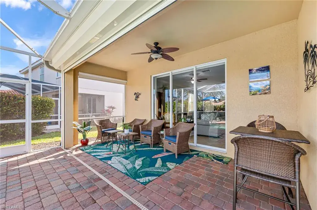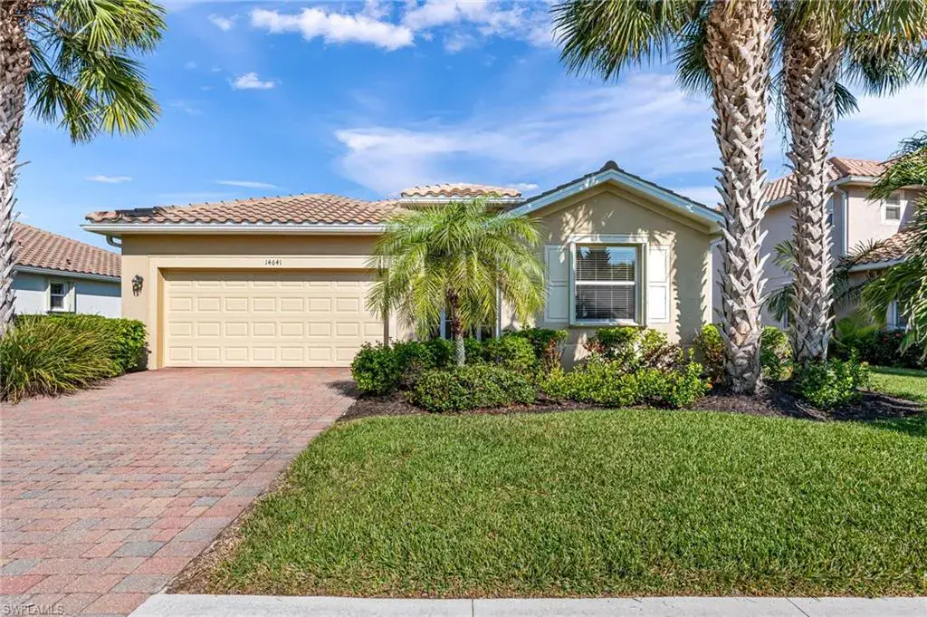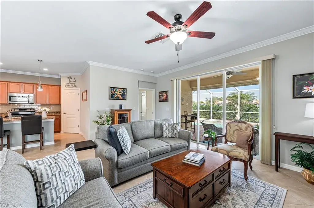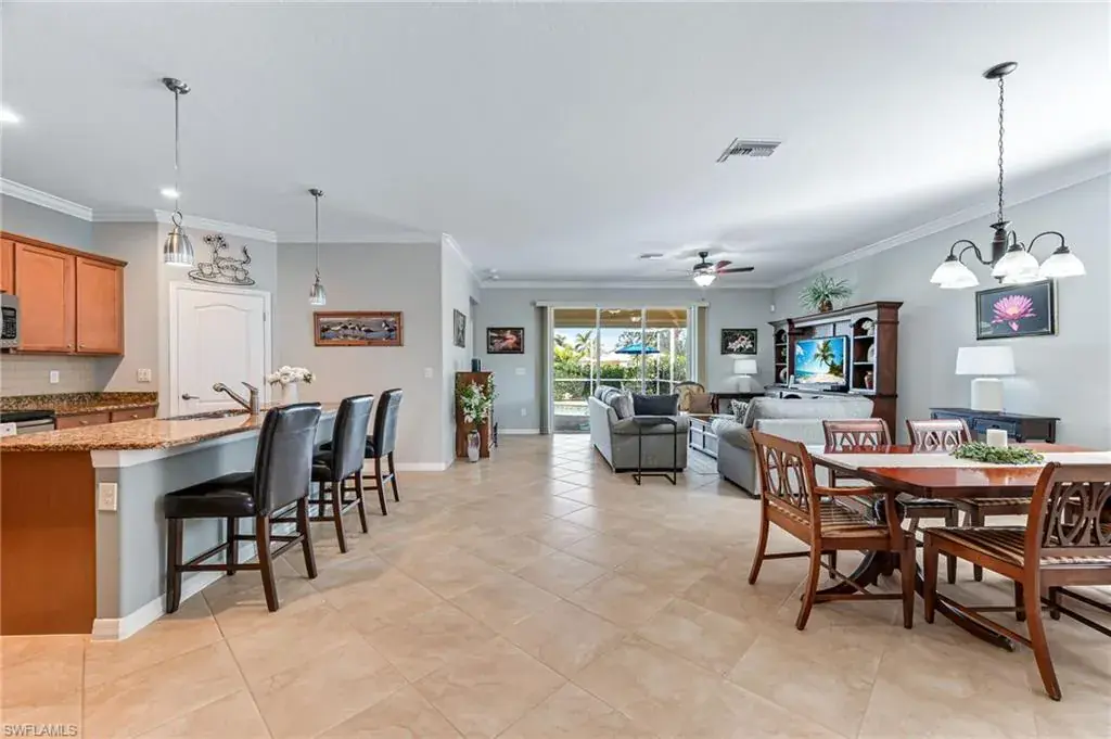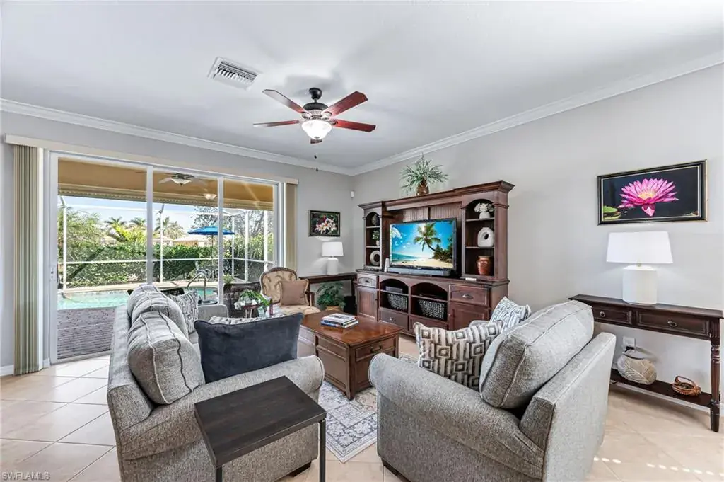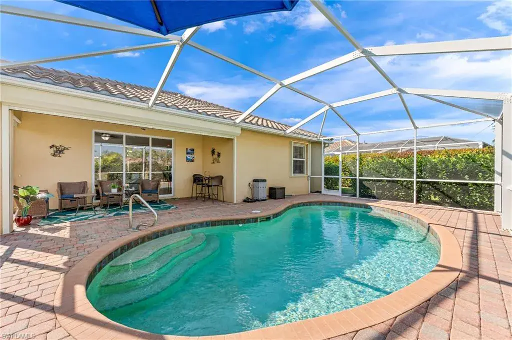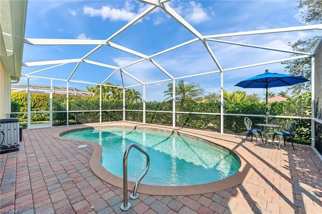 This beautifully maintained 4 Bed 3 Bath single story home with 2 car garage and pool with a water view is located in Reflection Lakes of Naples. LOW HOA FEES! Trevi floor plan with tile flooring through out and the spacious kitchen with GE appliances is open to both family and dining rooms, delivering the ideal layout for socializing and entertaining. Crown molding in the living and Primary Bed and Bath. Ceiling fans in all bedrooms and the family room. The extended lanai is perfect for enjoying the laid-back Florida lifestyle. Solar heated pool with solar pool cover included. Screened in front entry. Mounted accordion hurricane shutters on all windows and electric motorized shutters for the front and side of the lanai under-roof. Interlock kit in the electrical box with power inlet on lanai to allow access to included Duramax portable generator. Overhead storage with pull down ladder in the garage. Water Heater 2 yrs new! Remainder of Next Plumbing 10 yr Gold Protection Plan included – purchased in 2021. Google nest video doorbell security camera. Reflection Lakes of Naples offers a Clubhouse with Ball Room, Fitness Center, Card/Meeting Room, Library, Billiard Room, Resort Pool and Spa, Kid’s Splash Pool, Bocce Ball, and Pavilion.