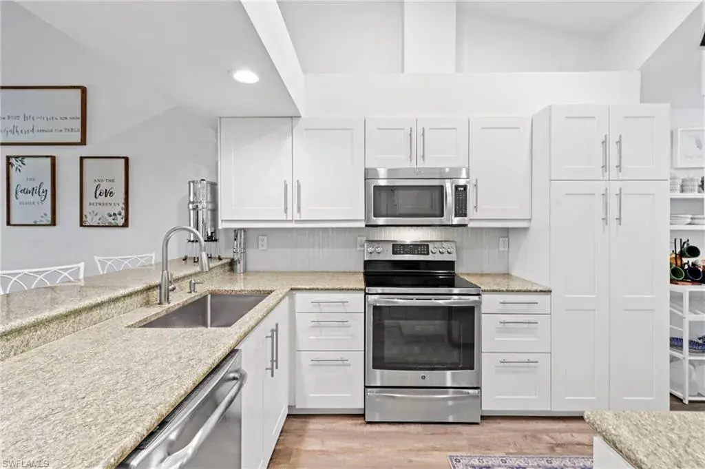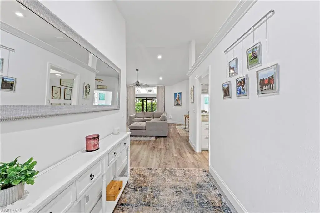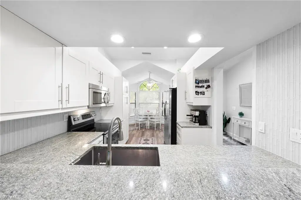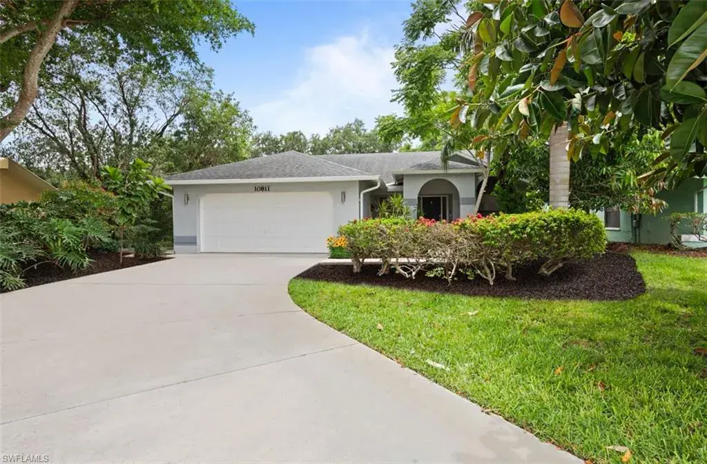 Discover this stunningly renovated 3-bedroom, 2-bath residence, complete with a DEN or private office space. This home features stylish vinyl flooring, along with marble finishes in the bathrooms. The master suite is a highlight, offering an en-suite bath and a generous walk-in closet. The modern eat-in kitchen is designed for culinary enthusiasts, equipped with stainless steel appliances, beautiful granite countertops, and a chic glass backsplash. Natural light floods the spacious living room through sliding glass doors that lead to an enclosed lanai, which boasts skylights for added brightness. Additional features include a sizable 2-car garage, 2023 AC, and an extended driveway for extra parking. Situated in a peaceful cul-de-sac within the Regent Park community in North Naples, this property provides convenient access to I-75 and comes with low HOA fees. Enjoy community perks like a swimming pool and tennis courts. Located in the esteemed Pelican Marsh school district, this home is also a short drive from numerous shopping, dining, and beach destinations. Seize the opportunity to make this exquisite home your own!