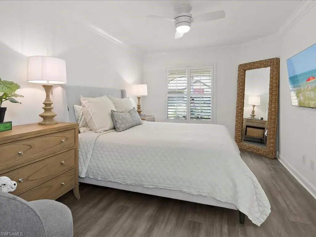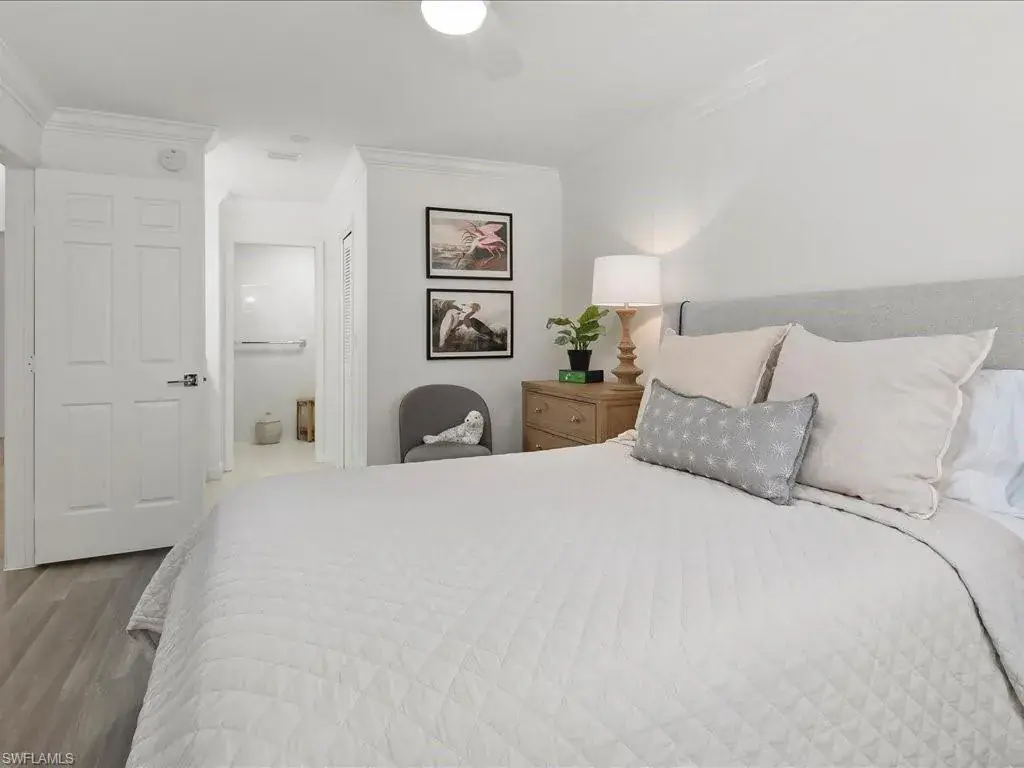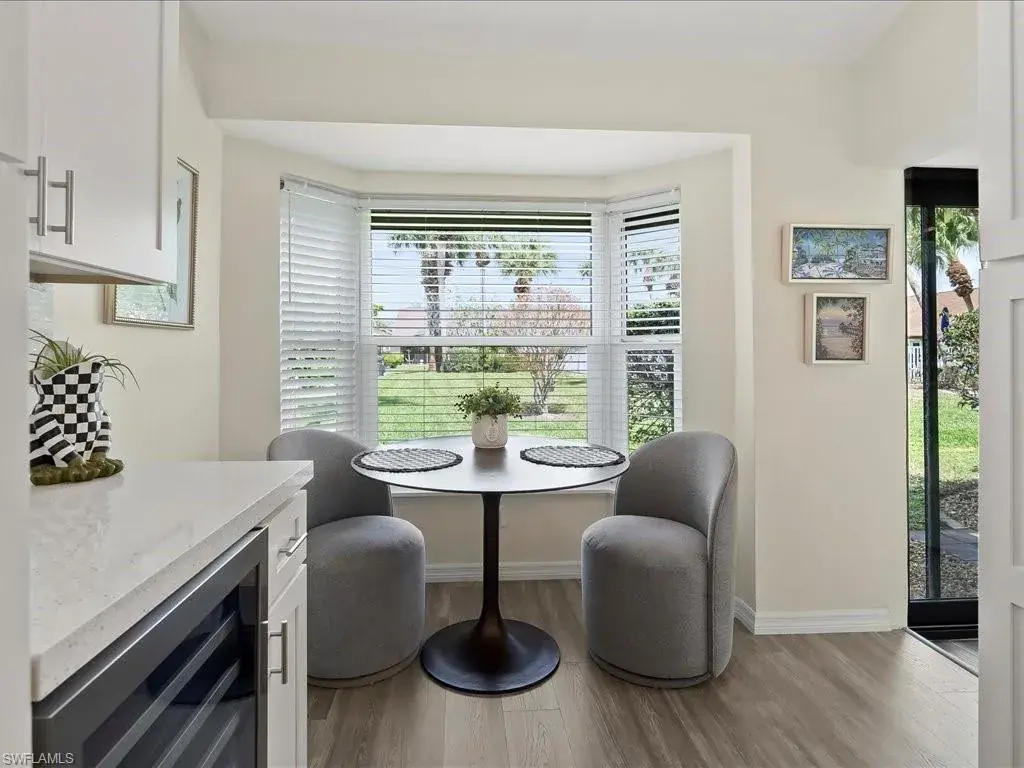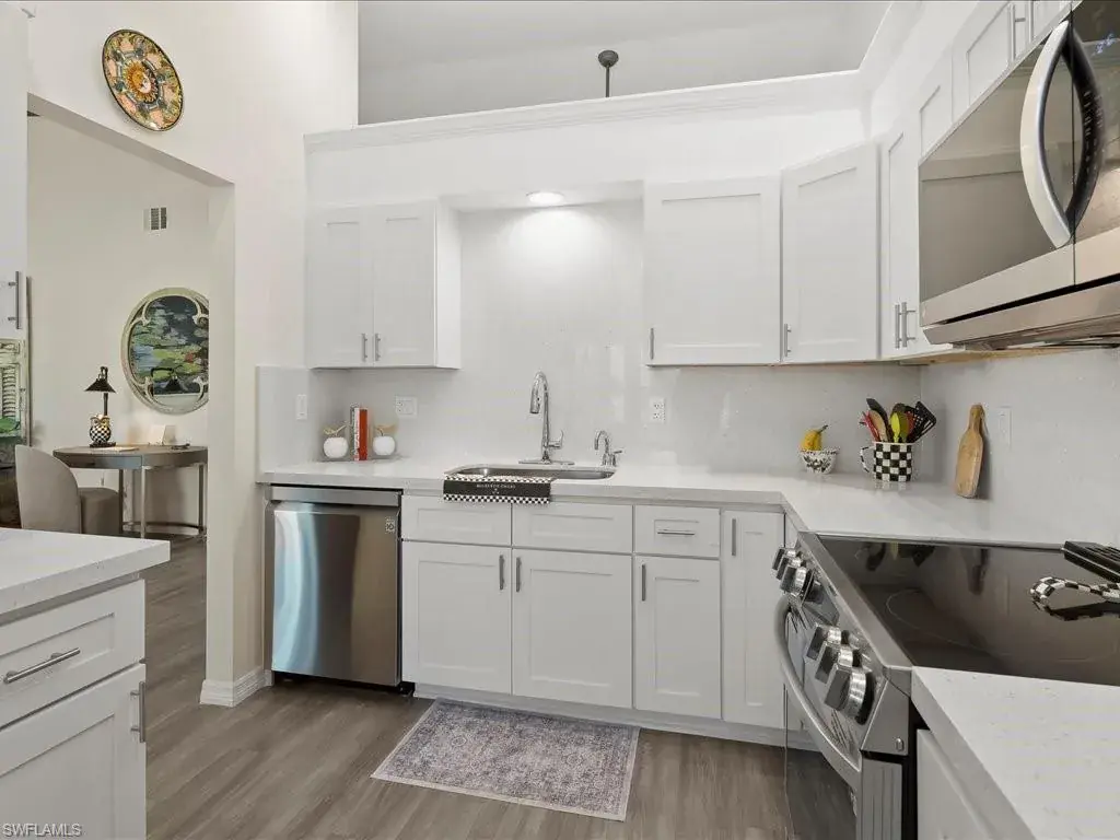SPECTACULAR NORTH NAPLES VILLA HOME. Very few properties in this complex have had this level of custom upgrades and improvements throughout. This one has the WOW factor! Move-in ready END UNIT. Great room floor plan with soaring ceilings. Beautiful high-end, custom kitchen with Quartz counter tops, wine cooler, instant hot faucet and good cabinet and pantry space. Flexible floor plan. THE REAR LANAI WAS ENCLOSED WITH GLASS SLIDERS which provides additional air-conditioned living space. There is also a den which is currently set-up as a sitting room but could serve as an office, formal dining area if need be. Both bathrooms are stunning as well. The primary shower has an easy access entry with no lip or ledge to step over. All windows and sliders are protected with electric hurricane shutters and the HVAC and water heater were last replaced in 2022. Recent improvements in the last year include luxury vinyl plank flooring throughout, new tile flooring plus a new sliding glass door on the rear lanai, blown-in attic insulation and more. This property lives like a single-family home without all the maintenance. The HOA fee includes water, sewer, insurance on the building, roofs (last replaced 2018,) exterior paint, lawn care, irrigation, reserves, and professional management. Also, extra storage, covered parking (carport space,) access to three heated pools plus tennis courts, pet friendly, not a 55+ complex and not located in a flood zone. Owner barbeque grills allowed as well. All this and more in a prime North Naples location close to everything! To purchase another villa in the complex, renovate it and come anywhere close to the same level of improvements and finishes of this property without spending more money would be impossible – not to mention the time/money/hassle factor. Must see to appreciate.