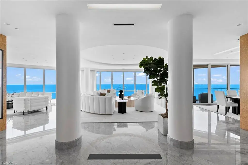 Embrace an unrivaled lifestyle that surpasses all expectations. Indulge in the ultimate luxury experience in the Regent at Park Shore. Extraordinary 12,000-square-foot penthouse offers breathtaking 360-degree views from the gulf to the bay from every room. Renowned designer Naomi Leff has meticulously designed this penthouse, seamlessly blending style and functionality. Floor-to-ceiling walls of windows showcase the stunning surroundings and views, while modern ceiling details and Tamo Japanese Ash accents add a touch of drama. Marble and bamboo floors enhance the ambiance throughout. The kitchen seamlessly connects with the great room and balcony, perfect for entertaining along with the adjoining media room. With five bedrooms, five full and two half-baths, and a serene primary suite with southern vistas, every inch of this property has been thoughtfully designed to engage in an exceptional living experience. With awe-inspiring views, meticulous design and top-notch amenities, this penthouse sets a new standard for luxurious living. Plus, this penthouse includes a private, three-car garage. Regent offers high-level security, first-class amenities and is near Venetian Village.