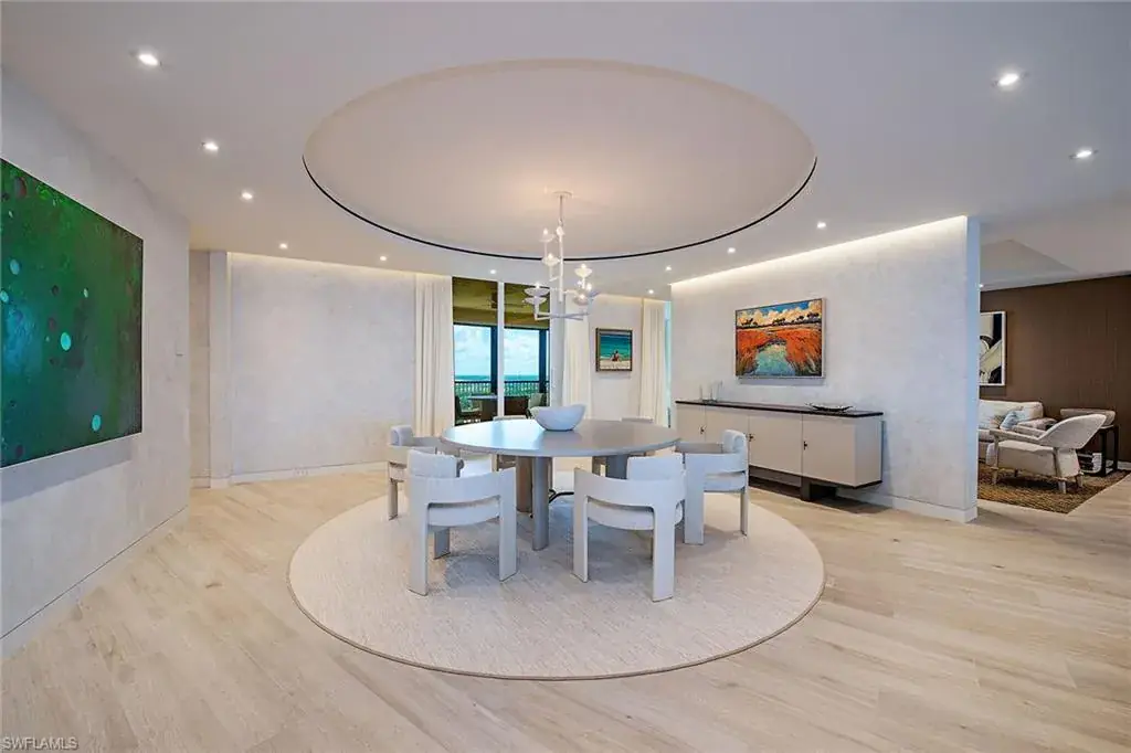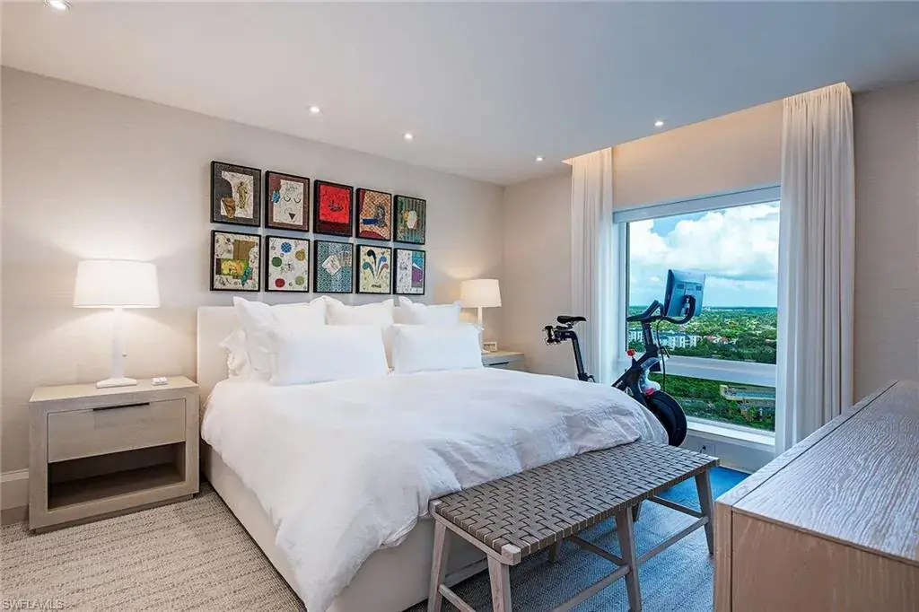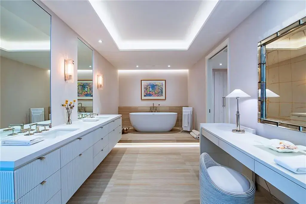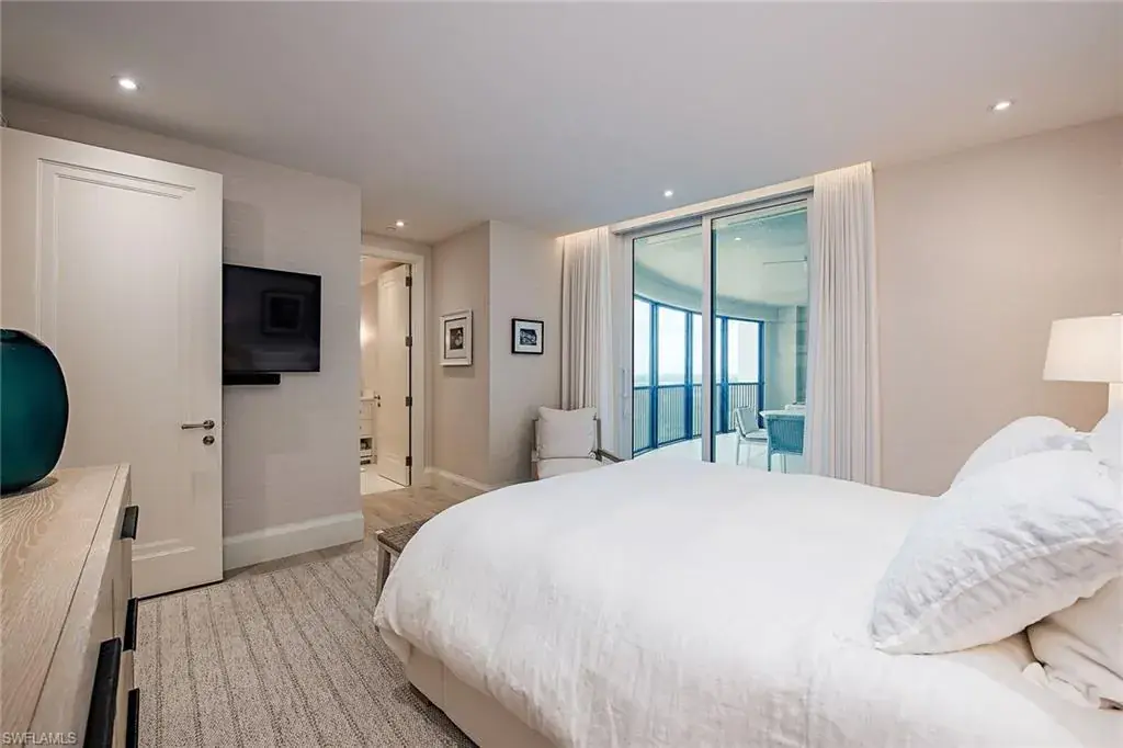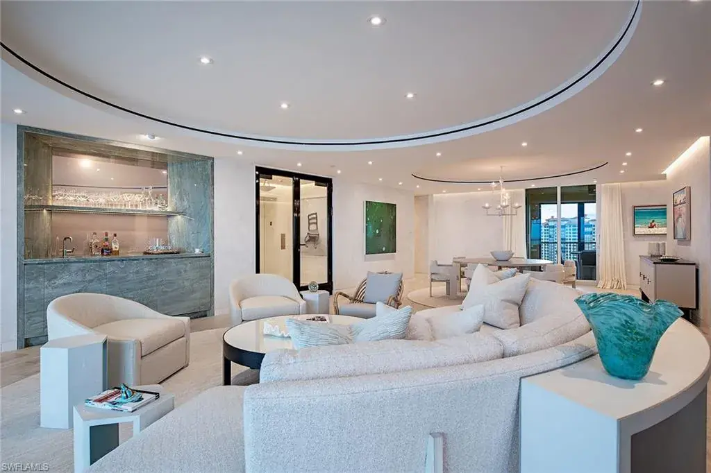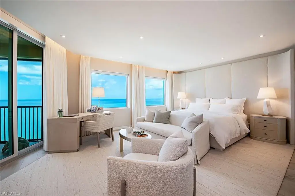 Exquisite, fully furnished three-bedroom plus den/family room, 3.5-bath beachfront residence offering nearly 3,400 square feet of masterfully remodeled space. Every detail has been curated to perfection from designer en-suite baths with custom-lit niches and recessed porcelain baseboards to a stunning emerald quartzite bar and caned kitchen cabinetry topped with natural stone. Custom LED lighting flows throughout, including hidden drapery lighting and under-tub glow. Elevated ceilings with integrated HVAC, floor-to-ceiling solid doors, impact windows/doors, and a smart home system ensure seamless luxury and comfort. Faux-finished living spaces, custom wall coverings in bedrooms, bespoke furnishings, and fully built-out closets elevate the experience. Automated blinds, storm shutters and custom millwork complete this architectural gem. Building amenities have also been stunningly renovated and include a beachfront pool/spa, fitness center, elegant social and board rooms, and direct beach access. Bay Colony Beach & Tennis clubs included. Not included, but available, is opportunity for an immediate golf membership to the Estates at Bay Colony Golf Club.