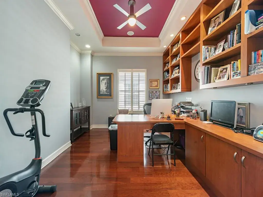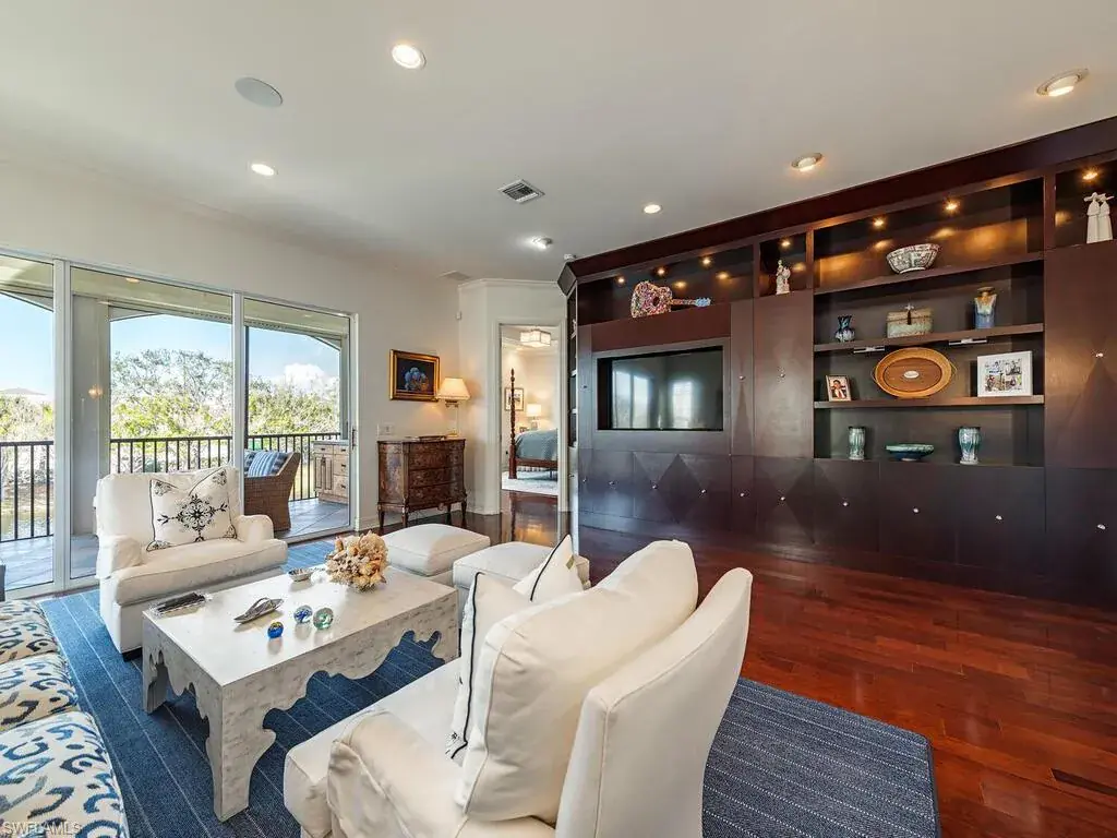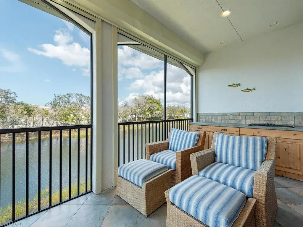 This second-floor coach home has three bedrooms with office and three full baths. Updated kitchen with granite and stainless-steel appliances. The kitchen is open to the great room and lanai for socializing with family and guests. Note the 10-foot-high ceilings that add to the spacious feeling of this coach home. A private two-car garage is on the ground floor, and a private elevator takes you upstairs. Enjoy a beautiful view of the fountain, lake and wildlife from the screened lanai. Lanai has a built-in electric grill, too. A new air conditioner in 2023 will keep you cool inside or enjoy the community pool and spa just a short distance away. All exterior maintenance is covered in the Reserve II association dues. A new roof was installed in 2022 with no assessments. The gated community of Banyan Woods has amenities that include a community fitness center, a clubhouse, playground, basketball court, and lined for a PICKELBALL COURT! Great location within minutes to gulf beaches, great dining and shopping. Come for the season, stay for a lifestyle.