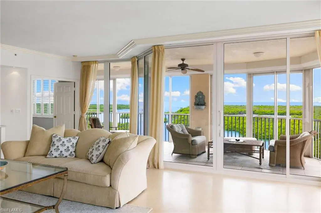 Expansive walls of glass draw your eye to the horizon, where boats drift toward the Gulf and the evening sky fills the home with soft, golden light. The open great-room design flows seamlessly into the dining and kitchen areas, creating an ideal setting for both entertaining and relaxation. The primary suite serves as a private sanctuary, framed by panoramic Gulf and bay views with direct access to the lanai for morning coffee or quiet evenings overlooking the water. A private den and two en suite guest rooms provide exceptional comfort for family and guests.