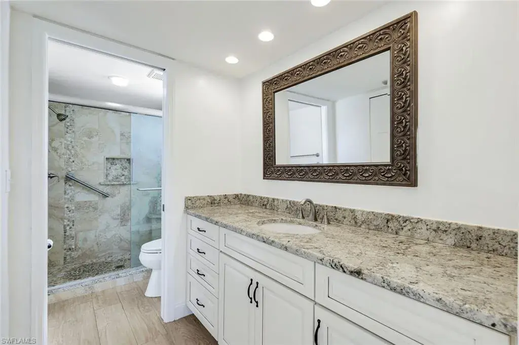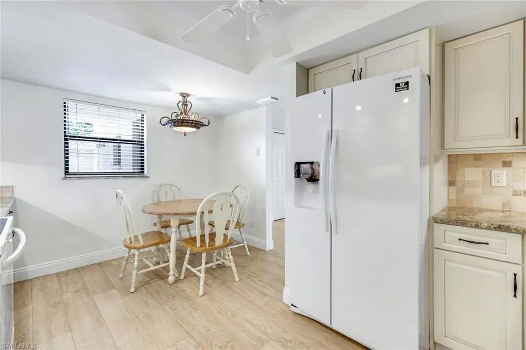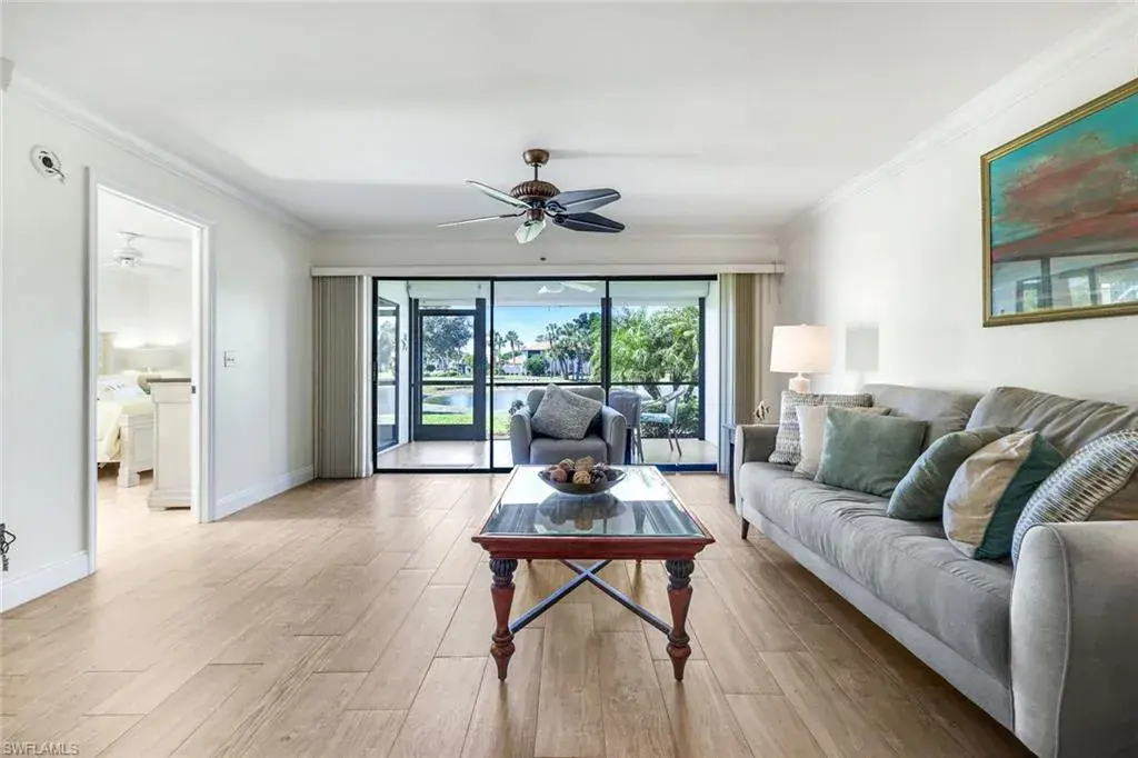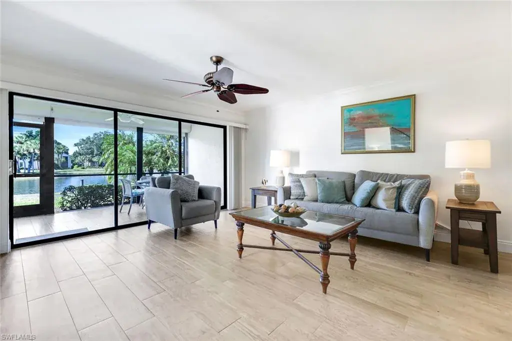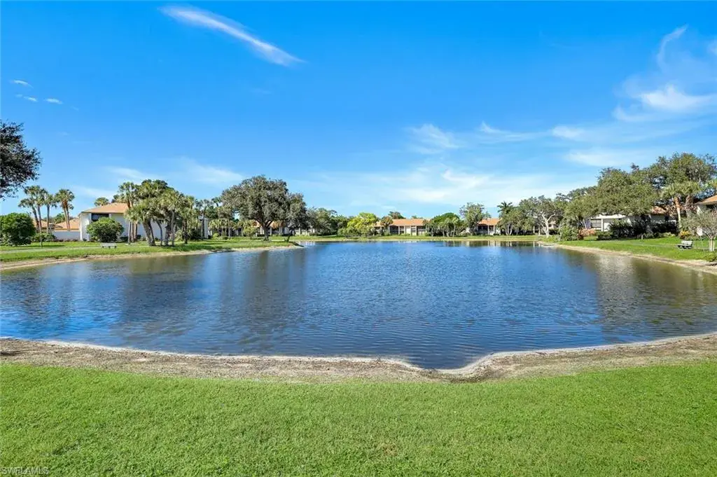 This move-in ready, turnkey furnished first-floor end unit offers beautiful lake views and a light, airy 3-bedroom, 2-bath layout designed for effortless living. A custom-installed closet now transforms the den into a true third bedroom—adding flexibility for guests, a home office, or hobby space. Wood-style tile flooring flows throughout for easy maintenance, while the eat-in kitchen features granite countertops, ample cabinetry, and a breakfast bar ideal for casual dining. The split-bedroom floor plan ensures privacy, and the primary suite offers an en-suite bath and generous closet space. Additional highlights include an in-unit laundry room with wash tub, side-by-side washer and dryer, and a detached one-car garage just steps from the front door. Lovingly maintained and ready for immediate enjoyment, this residence invites you to start living the Naples lifestyle from day one. The Retreat at Waterside offers resort-style amenities including a community pool, tennis courts, and scenic walking and biking trails—all within a secure, guard-gated community. Ideally located west of 41 and just minutes from world-class beaches, Delnor-Wiggins Pass State Park, and the upscale dining and shopping at Mercato, this lakefront condo perfectly blends comfort, convenience, and coastal charm.