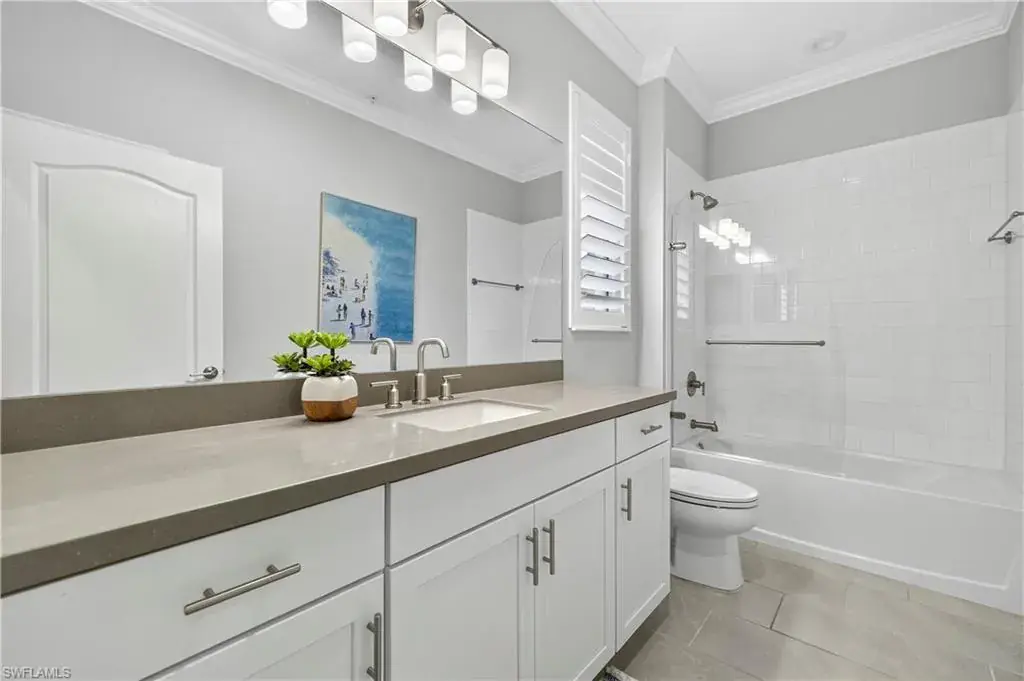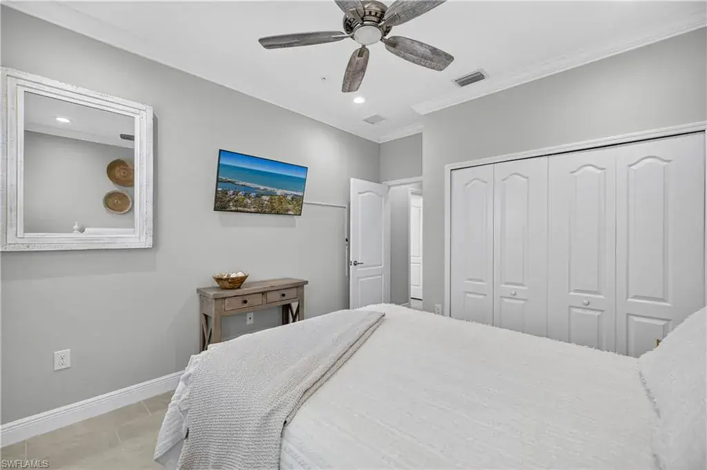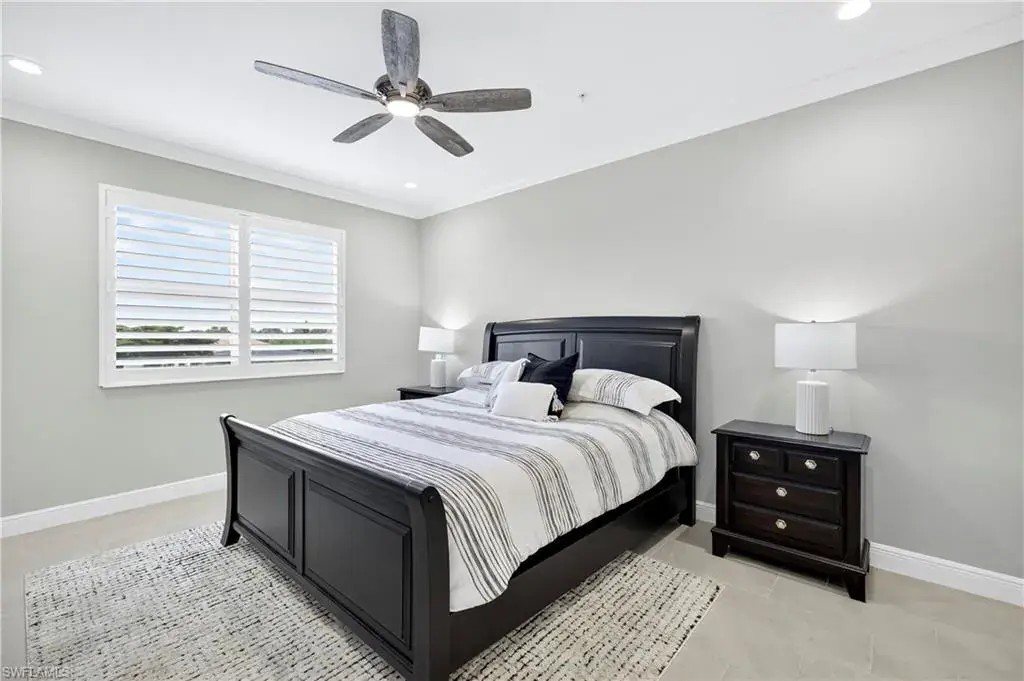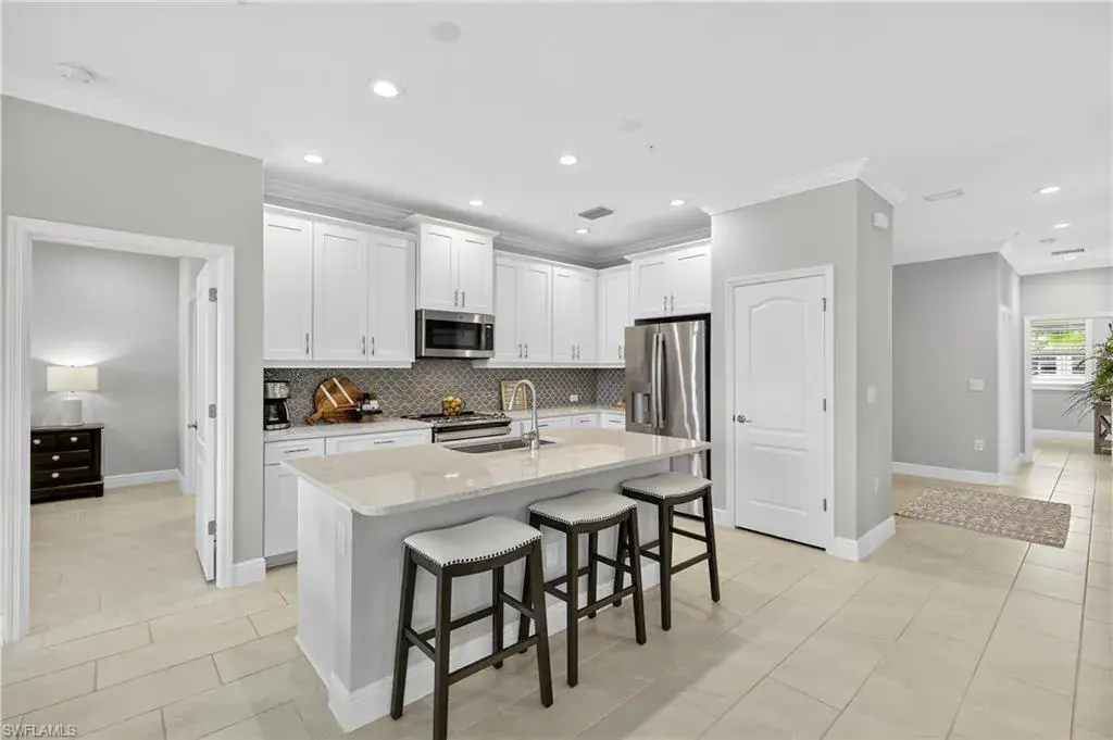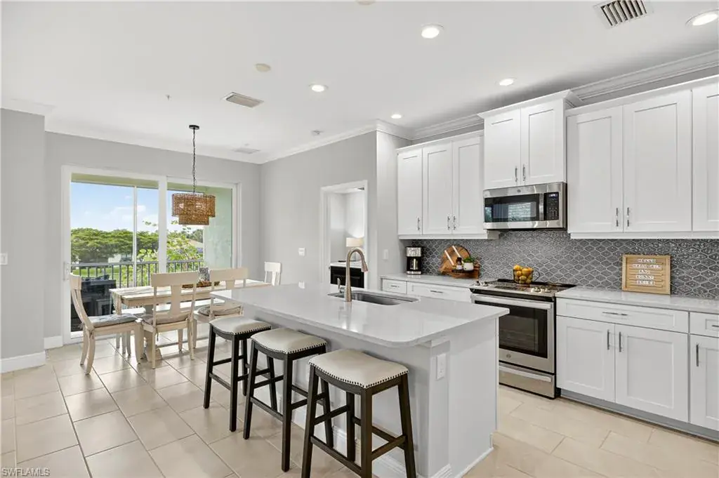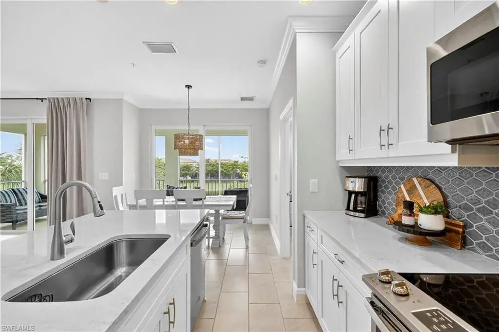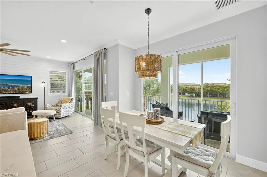 Welcome to sunny SW Florida and this large bright condo that you have been waiting for. This modern 3 BR, 2 BA END UNIT condo is bright and airy and offers a wonderful blend of comfort and elegance. With views of a large lake, this second floor unit is a wonderful place to live. The rooms are a very good size (primary has large walk-in closet) with impact windows and doors and crown molding in a contemporary design with volume ceilings. The updated kitchen is a great place for the aspiring chef. The unit comes TURNKEY furnished with an attached 1 car garage. Relax on the screened lanai that overlooks the lake. Richmond Park is minutes away from shopping, the beaches, medical facilities and restaurants. It is a short drive to SW Florida International Airport. Schedule your showing today. You won’t be disappointed.