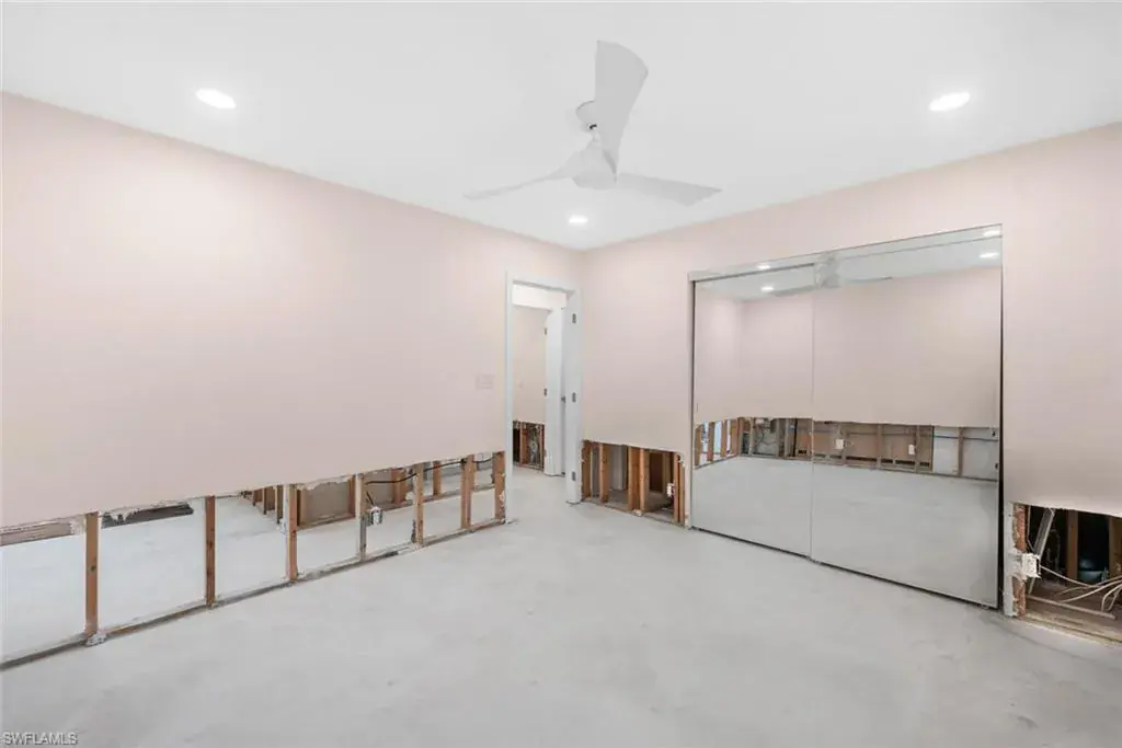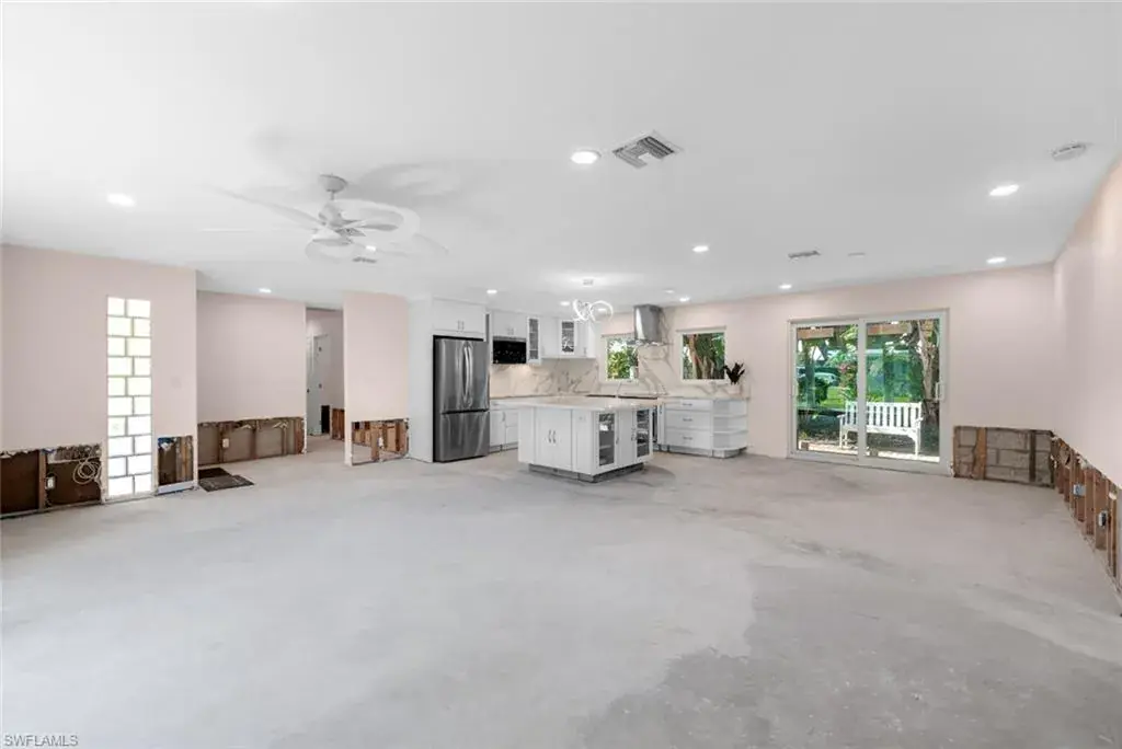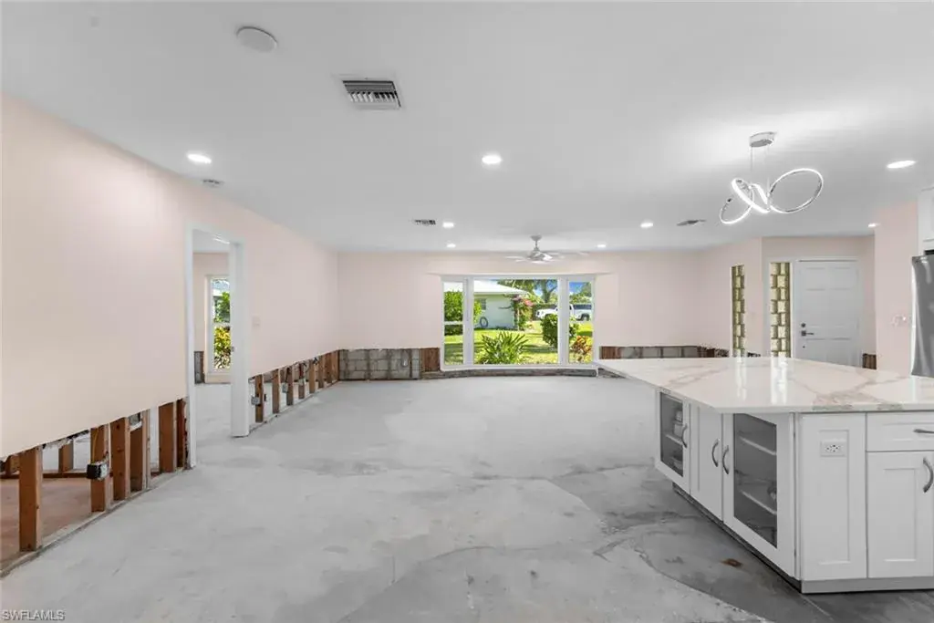 The living room overlooks the luscious extra-large lawn through a large bay window. All windows were replaced in 2020 with Window World high-impact hurricane glass graded and they have hurricane shutters. Screened double-panel sliding door CGI Santinel 4025 opens to the back patio. The back garden includes an avocado tree. The living room is an open concept design that includes a large island with cabinets and L-shaped kitchen. The prime suite has two separate walk-in closets, and a double sink in the prime bathroom. The second bedroom features a full-wall length closet with mirror sliding doors. New ceiling fans (Fanimation MAD8530MW, Minka Air Pinup F862L-WHF) installed throughout the house. The garage is extra wide allowing for a second washing station.