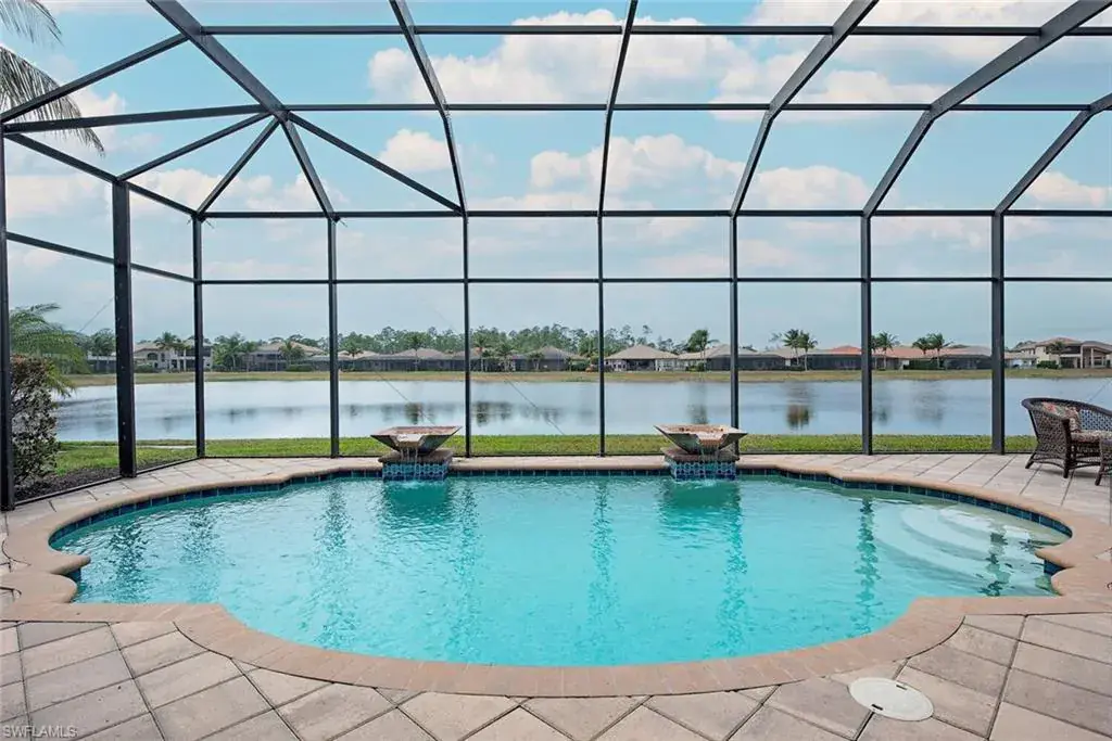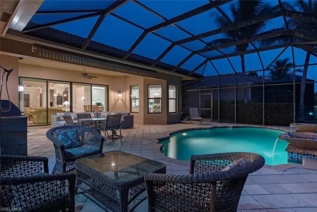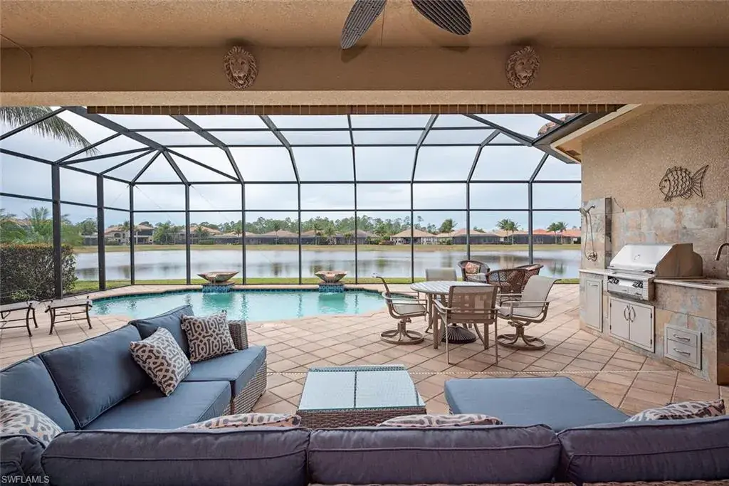 Every day feels like a vacation in this exceptional Florida home. As you enter the private, gated courtyard and step through the double entry doors, you’ll be greeted by breathtaking views of the serene lake. Watch the sunset paint the sky in vibrant shades of tangerine, magenta, and azure from your screened lanai — the perfect setting for alfresco dining, with a nearby outdoor kitchen with Alfresco grill. Spend your days basking in the sun by the sparkling pool, and rinse off afterward with the convenient outdoor shower. This coveted Carlyle floor plan is a true entertainer’s dream, with an open layout that seamlessly connects the wet bar (complete with a wine fridge), great room, dining area, and gourmet kitchen to the outdoors. The chef’s kitchen is a masterpiece, boasting a center island, abundant white cabinetry, a transom window, ambient lighting, a vented Monogram hood, custom granite countertops, and stunning glass tile backsplash. Enjoy the lake view from the peaceful primary suite, which features a spa-like bathroom and two custom walk-in closets. Two private guest suites are thoughtfully positioned on opposite sides of the home, each with walk-in closets and full bathrooms. There is also a “pool bath” conveniently located off the great room. The versatile Club Room, with its beautiful millwork on the ceiling and feature wall, works perfectly as an office, guest room, or home theater. Luxurious finishes abound throughout the home, including wood flooring, custom wood molding, upgraded sinks, faucets, and toilets, as well as custom granite in the bathrooms. Additional touches such as pocket doors, an electric sunshade on the lanai, designer lighting and fans, and custom window treatments elevate the home’s style. For easy maintenance, a central vacuum system simplifies clean-ups, and the finished laundry room includes ample cabinetry, a long folding counter, and a sink. Impact windows and doors provide peace of mind during storm season. This thoughtfully designed home comes fully furnished, allowing you to move right in and begin enjoying the Naples lifestyle you’ve always dreamed of. Located in the desirable Riverstone community, this vacation-inspired neighborhood is zoned for “A” rated schools. The recreation area offers a fitness center, social hall, resort-style and lap pools, spa, 5 Har-Tru tennis courts, basketball and pickleball courts, a tot lot, and a dedicated activities coordinator who plans a variety of fun events, making it easy to meet new friends and enjoy an active, social lifestyle.