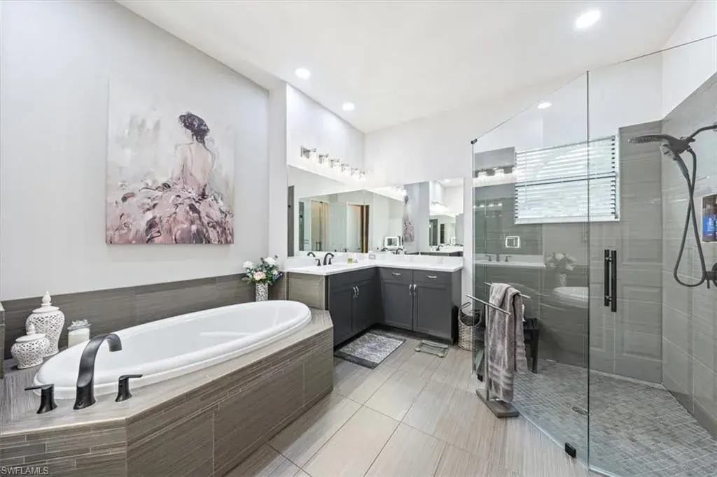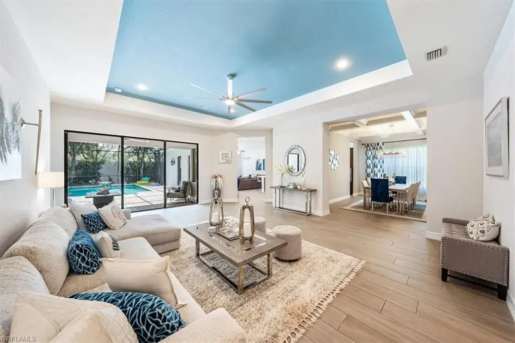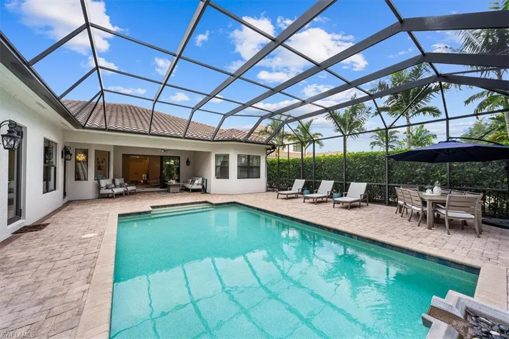 PRICED TO SELL! The largest single-story floor plan in Riverstone… the rare Drake Model! At 3,360 square feet, this sprawling home features 4 large Bedrooms, one in each corner of the home, PLUS a separate Den or Office and 4 Full Bathrooms. The luxurious layout is a perfect blend of elegance, size and comfort. With a split 3-Car Garage and huge horseshoe shaped driveway, there is always ample room for guests. This updated home offers spacious living with meticulous design. The kitchen features quartz countertops, stainless steel appliances, and a reverse osmosis water system. Two separate living areas provide flexibility for gatherings and relaxation, while the large den with bay window offers a private retreat, office, or separate media Room. The master suite boasts a newly remodeled bathroom with walk-in shower, soaking tub, & two walk-in closets. Step outside to your own completely private oasis with a heated pool, enclosed lanai, and beautifully landscaped view. NEW Pool Pump & New A/C Unit July 2025. Located in the active and ever popular Riverstone community, you are a short 10 minute drive to white sandy beaches and have access to some of the best schools and restaurants in Naples. This gated community offers a resort-style pool, lap pool, splash pad, jacuzzi, tiki bar, tennis & pickleball, indoor & outdoor basketball courts, playground, fitness center, activities director, yoga room, billiards game room and 24 hour security. Welcome Home!