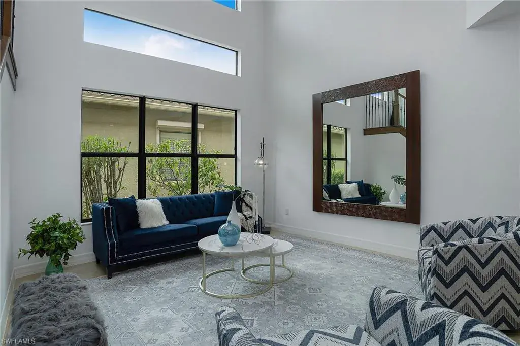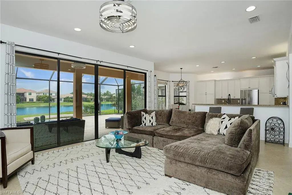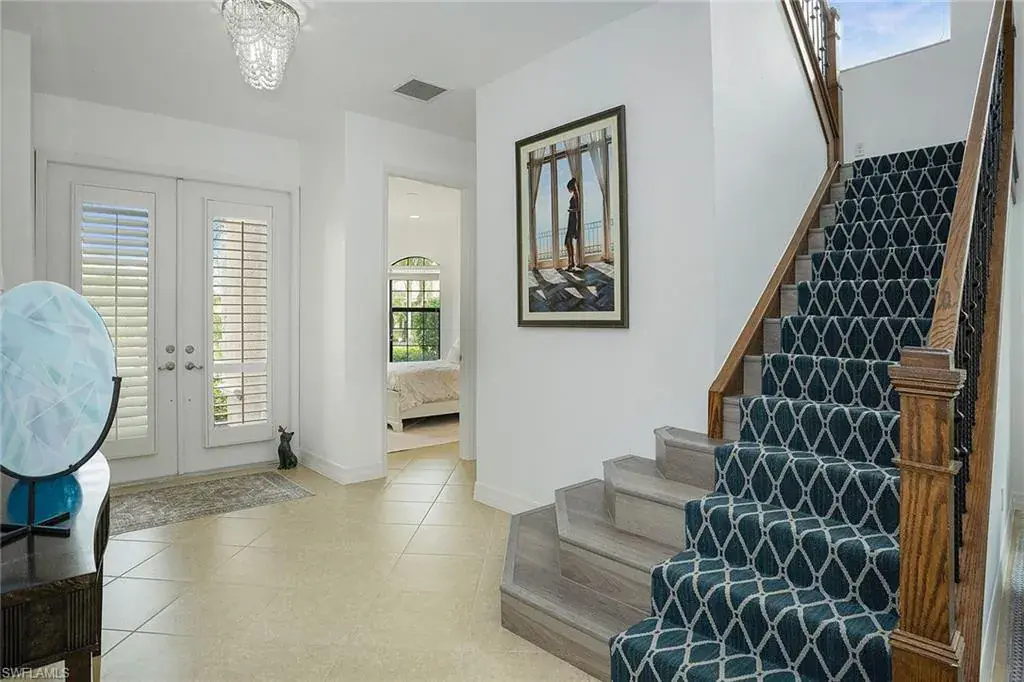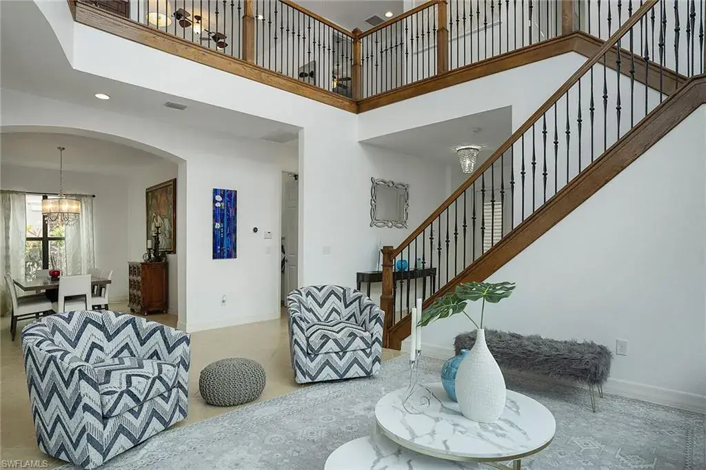 The home also includes a formal dining room for hosting special gatherings. Upstairs, a spacious loft with a wet bar and wine cooler provides the perfect space for entertaining or enjoying cozy movie nights. The luxurious owner’s suite is a private retreat, with French doors opening to a covered veranda offering picturesque lake views. The suite also features two large walk-in closets and a spa-like bathroom with a Roman tub, separate shower, dual private water closets, and plenty of counter space. The first-floor bedroom comes complete with a walk-in closet, making it ideal for guests or use as a home office. The upstairs bedrooms also feature walk-in closets, ensuring ample storage throughout. The outdoor living space is equally impressive, with an extended screened patio perfect for al fresco dining, lounging, or simply enjoying the peaceful water views. There’s also room for a pool, giving you the opportunity to customize the outdoor area to your liking. This home includes a 2-car garage with extra storage. Residents of Riverstone enjoy a resort-style lifestyle, with amenities like a fitness center, social hall, resort and lap pools, spa, tennis courts, basketball and pickleball courts, and more. Situated near top-rated schools and just a short drive from Naples’ finest dining, shopping, and beaches, this home offers the perfect blend of luxury and convenience.