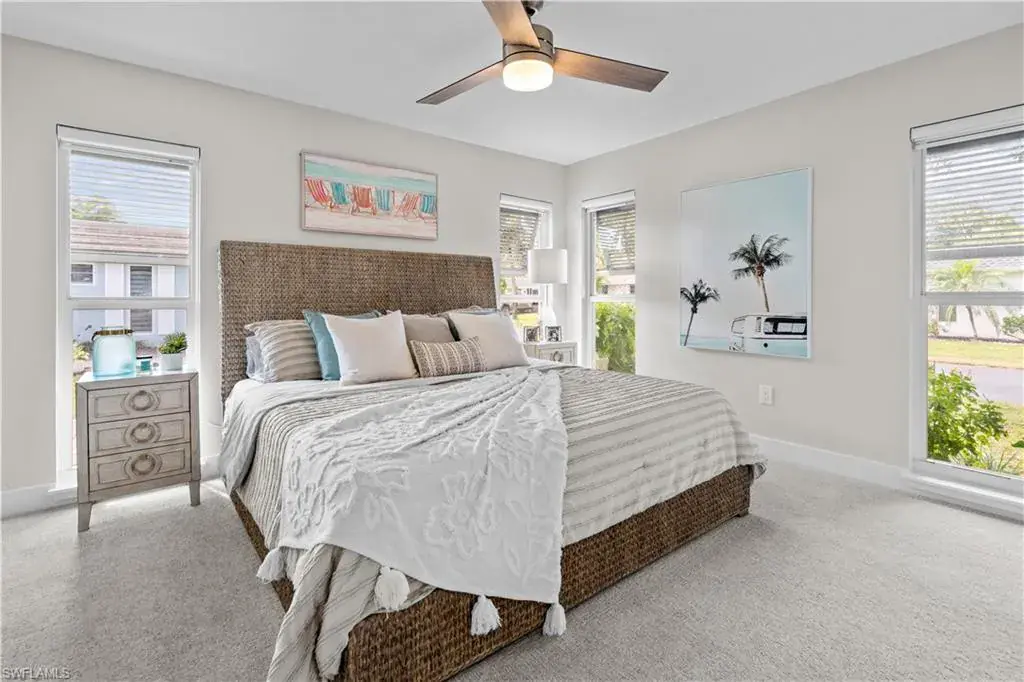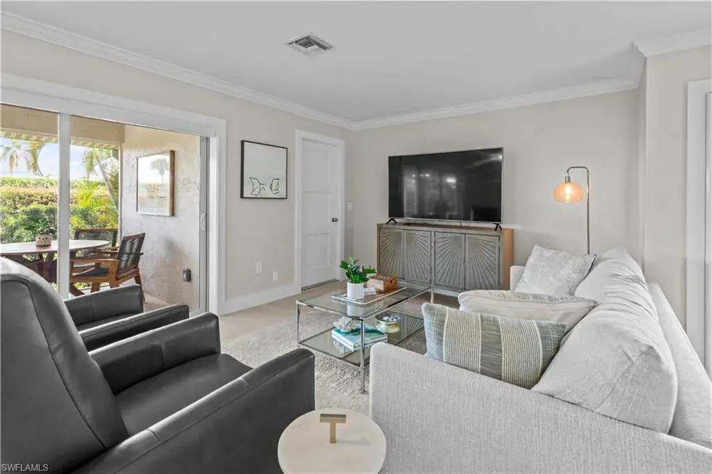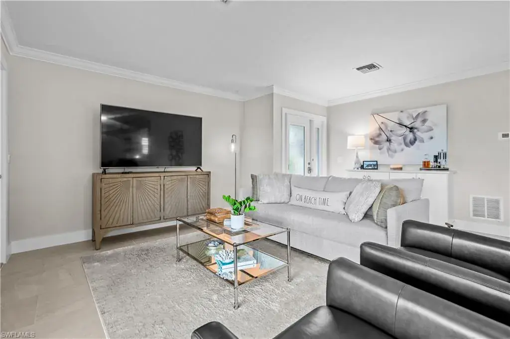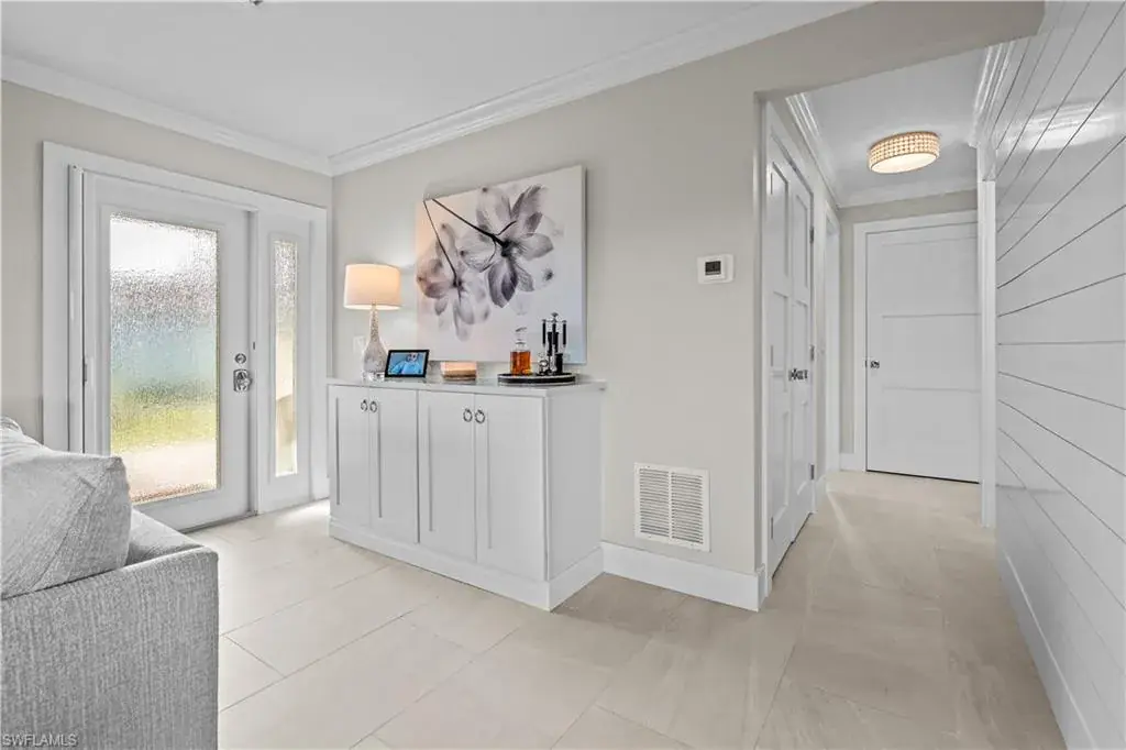 Incredible investment opportunity in a PRIME Naples location! Just 2 miles from the beaches and iconic 5th Avenue, this beautifully updated Coastal Chic 2-bedroom, 2-bath home with a private garage offers a bright, open living space. This property has been thoughtfully upgraded with a new roof (2022), new brick-paver driveway, HVAC replaced in 2022, and full hurricane protection including impact glass, 12-foot sliding doors, and hurricane-rated front and garage doors. The lanai features motorized privacy shades, and a retractable screen on the front door allows for breezy indoor-outdoor living. Inside, the kitchen boasts flat-panel cabinetry, soft-close drawers, slide-out shelving, upgraded island and pantry panels, and KitchenAid stainless appliances. Additional high-end touches include upgraded 18×36 tile flooring, Karastan carpeting, solid wood 3-panel doors, chrome hardware, 6-inch baseboards, shiplap accent walls, and custom closet organizers throughout. With its unbeatable location, premium finishes, and low-maintenance upgrades, this property is move-in ready and an exceptional investment property for seasonal renting, full-time living, or a high-demand vacation rental.