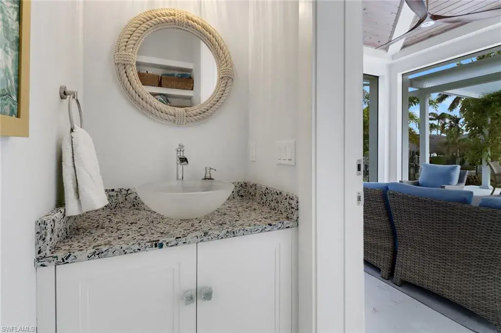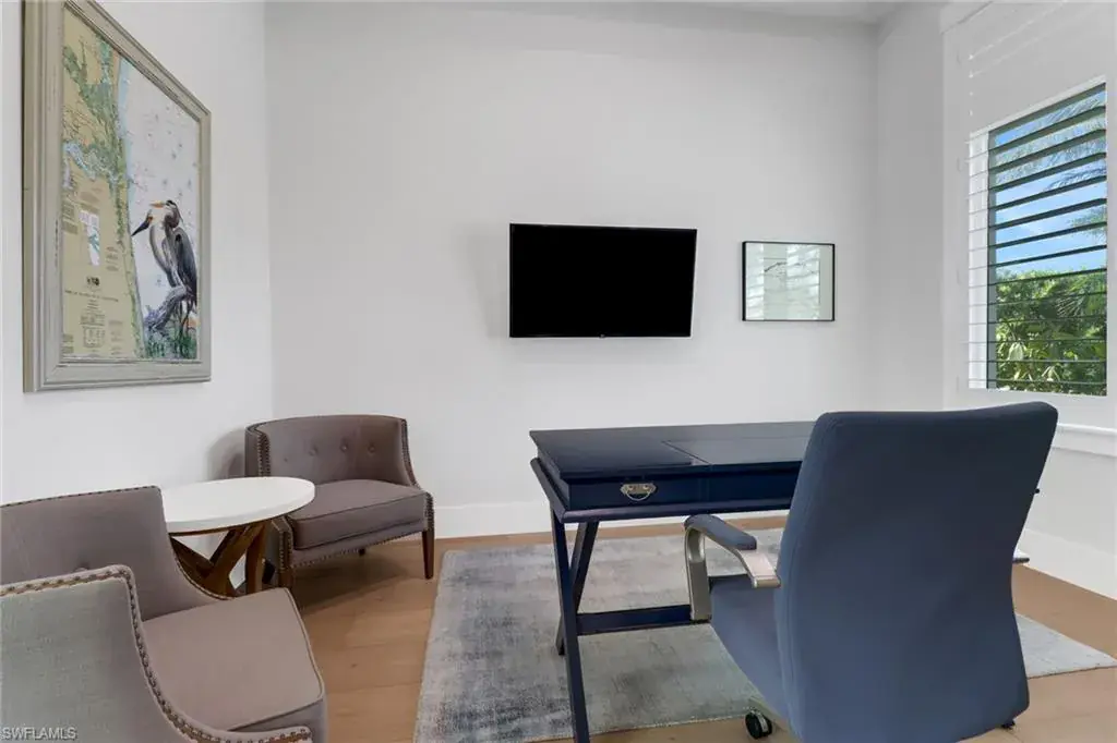 One of the standout features of this home is the waterfront living opportunity afforded by 148 feet of frontage on a 50′ width canal, providing direct Gulf access along with a dock and lift for water toys. After a long day at the beach or on the water, you can relax by the infinity pool with an attached spa, dine al fresco, or unwind in the covered outdoor area.