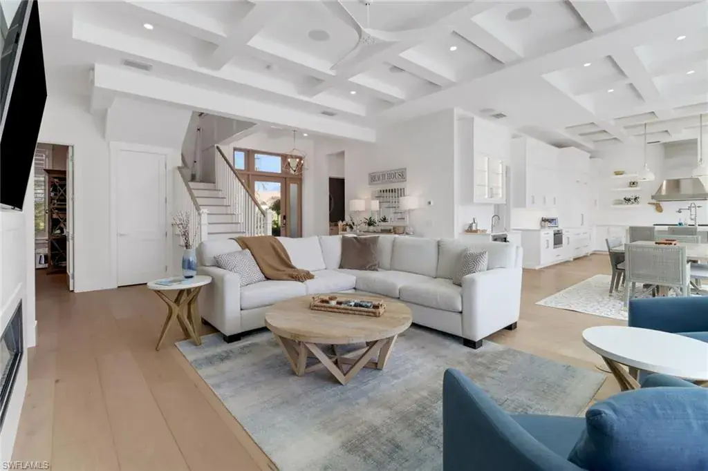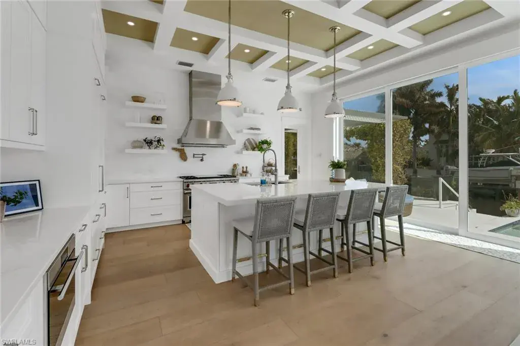 The open floor plan facilitates seamless movement from the family room and dining room into the kitchen, with fully pocketing, impact-resistant sliding doors that lead outside. The interior boasts wide-plank wood flooring, coffered ceilings, custom built-ins, and designer finishes, creating an atmosphere of warmth and comfort.