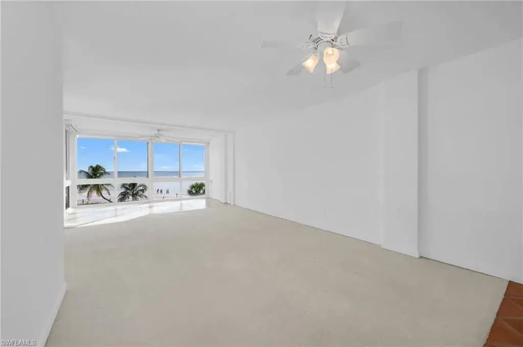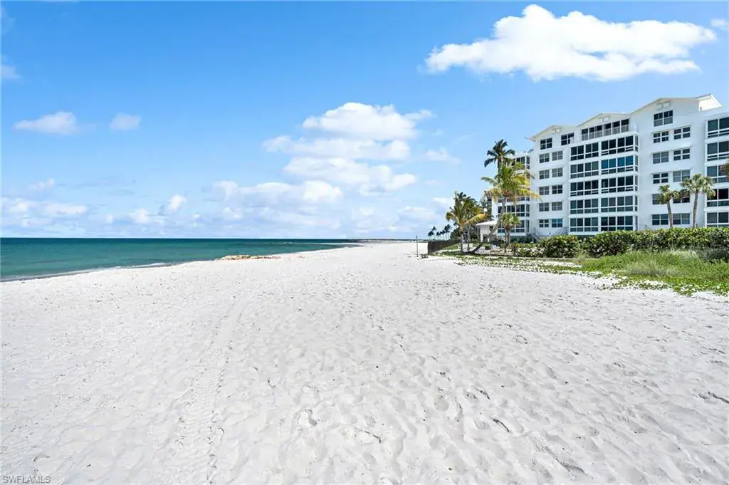 Scenic views of the Gulf define this 2nd-floor residence in Royal Palm Club. This light-filled 2-bedroom, 2-bath home offers 1,143 sq ft of open-concept living where the kitchen has been opened to the living area to maximize sightlines to the Gulf and lanai. Southwesterly exposure delivers panoramic views of the pool, beach, and Gulf with the Naples Pier visible on the horizon. The kitchen features warm brown tones, rich cabinetry with new hardware, complementary countertops and authentic Spanish tile flooring and accents that lend Mediterranean charm and durable function. Both baths have been tastefully updated; the primary bath showcases a spacious walk-in shower with a frameless glass door, decorative tile detail and updated cabinetry. Bedrooms are freshly painted for a move-in-ready presentation. An open lanai with tile extends the living space and provides an ideal spot for morning coffee or sunset viewing. The community pool is conveniently located steps from the Gulf, enhancing the beachfront lifestyle and easy access to sand and surf. Moorings Private Park is located next door, adding exclusive greenspace and easy access to waterfront recreation. Located in a low-density Gulf-front building, this property offers direct beach access, a residential feel and convenient proximity to dining, shopping and recreation.