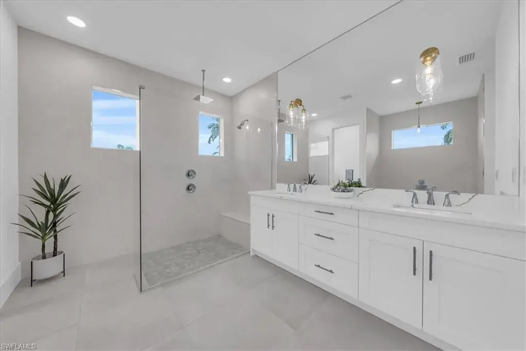 The primary suite is a true retreat, offering panoramic golf course views, a walk-in closet, and a spa-inspired bath featuring dual quartz vanities and a frameless glass shower with a filtered shower head. Two additional guest suites, each with its own private bath, provide comfort and privacy for family or visitors.